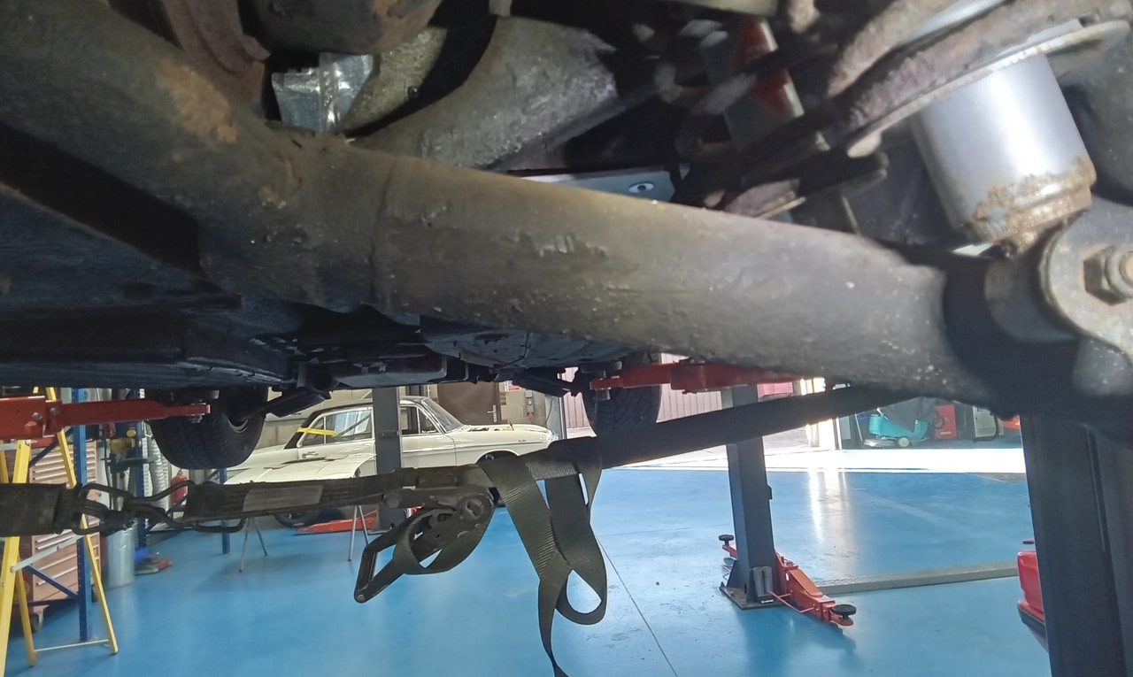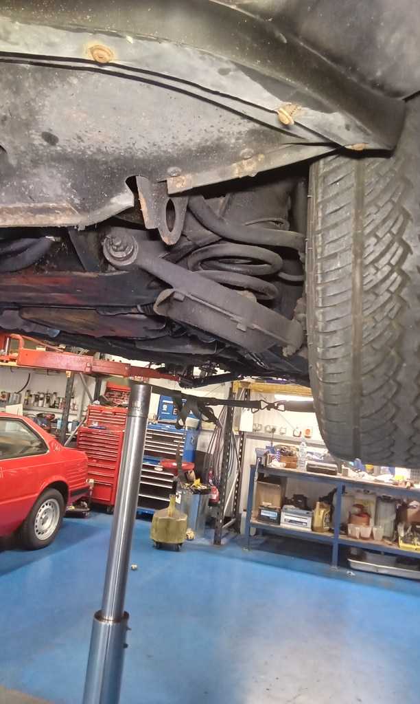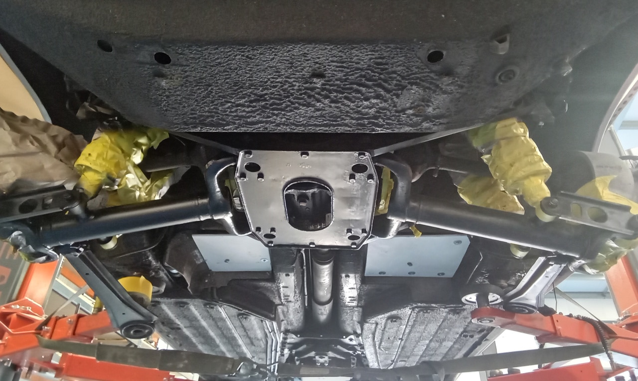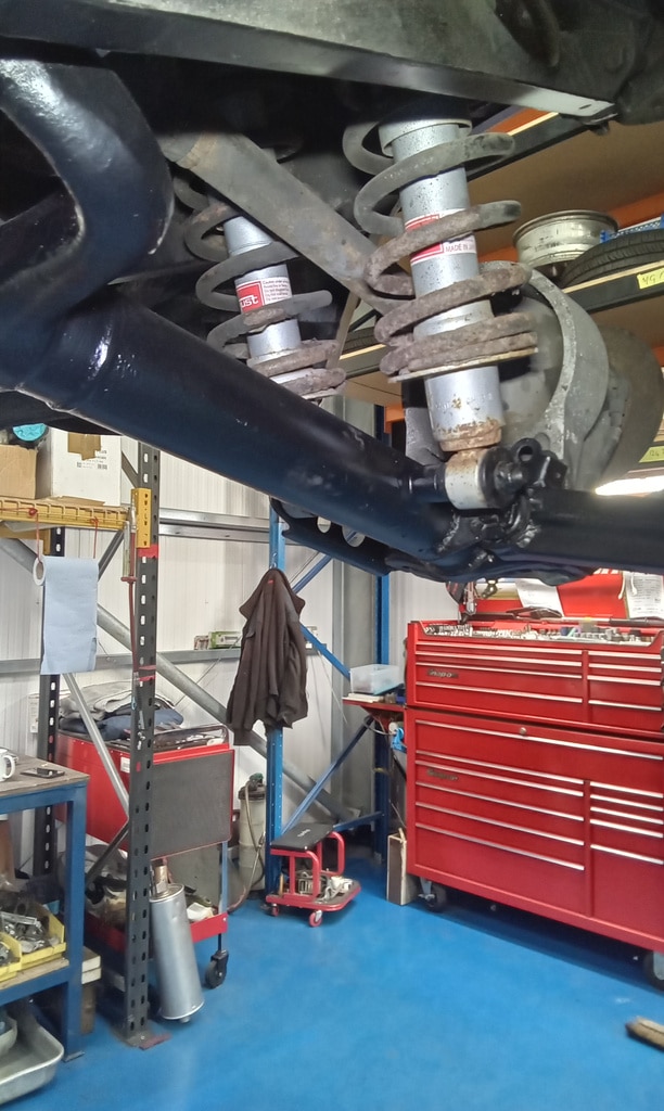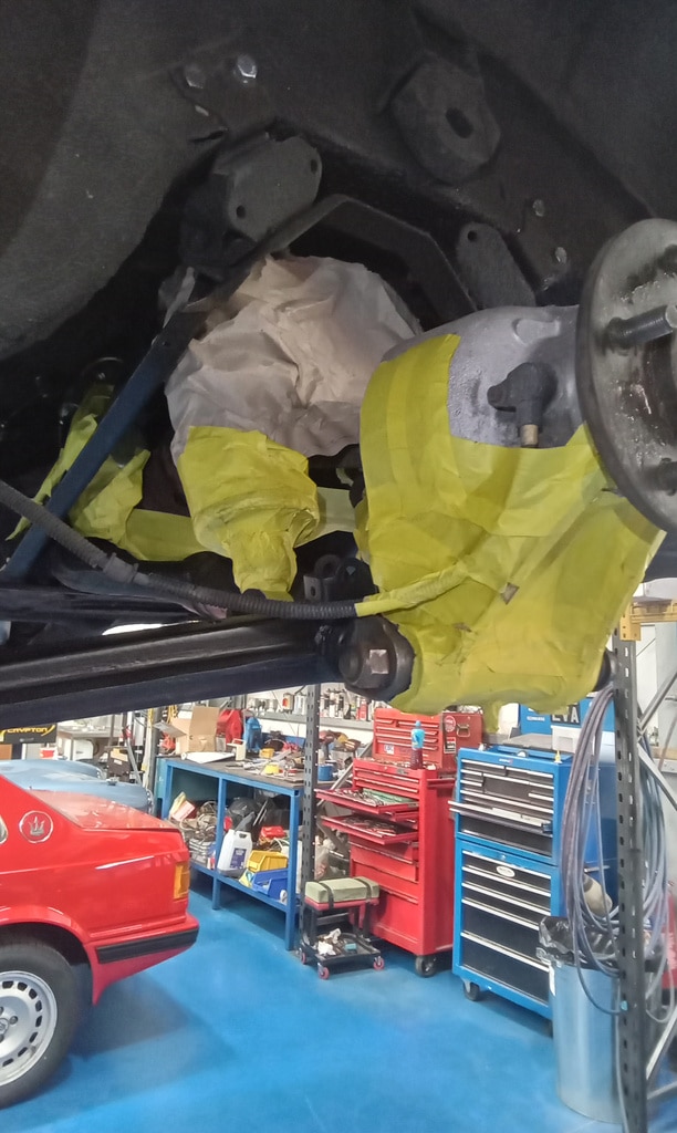 The Bridge Classic Cars team have been busy on the 1991 Jaguar XJS V12. Our technician Jon has got the rear axle back underneath the car after the rust repairs were completed – so he could begin to cleaning up the underneath for painting.