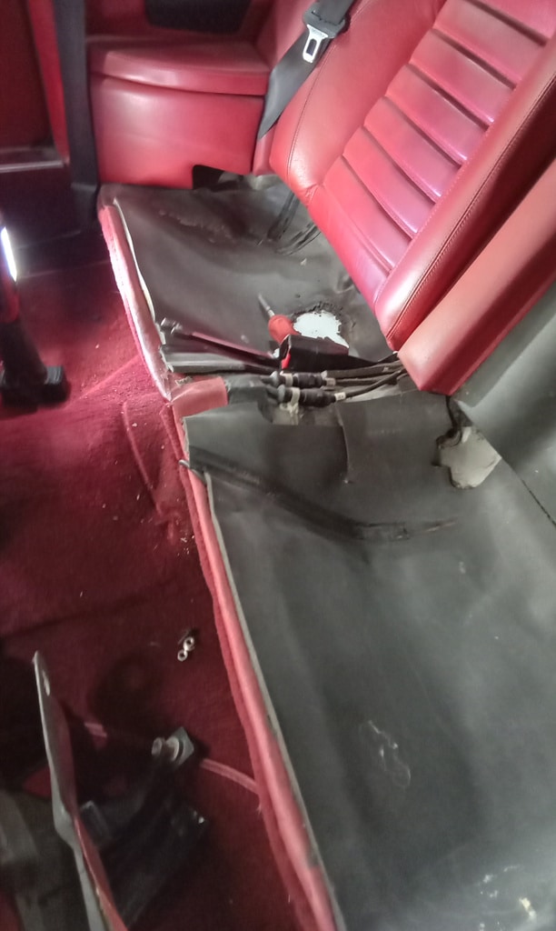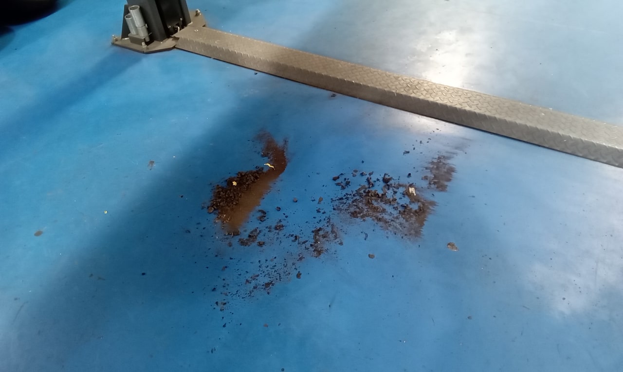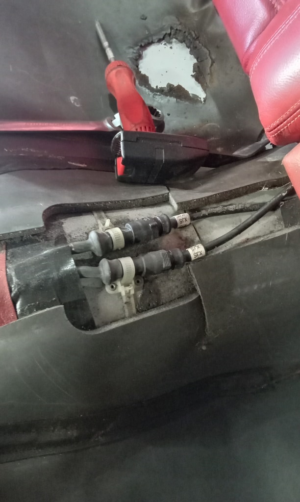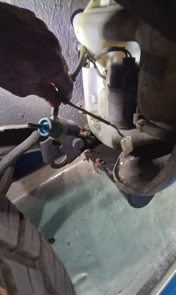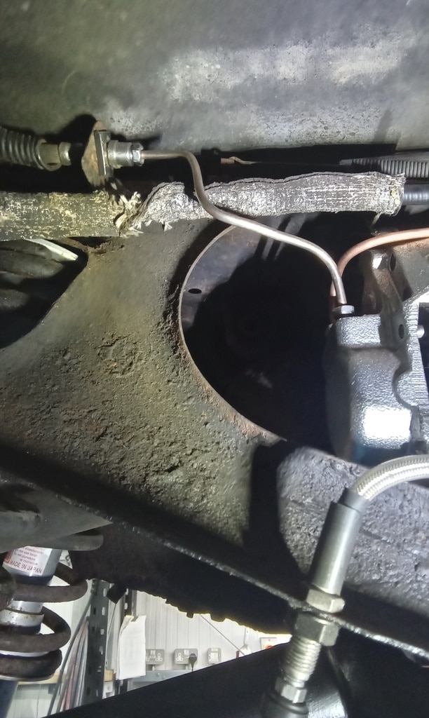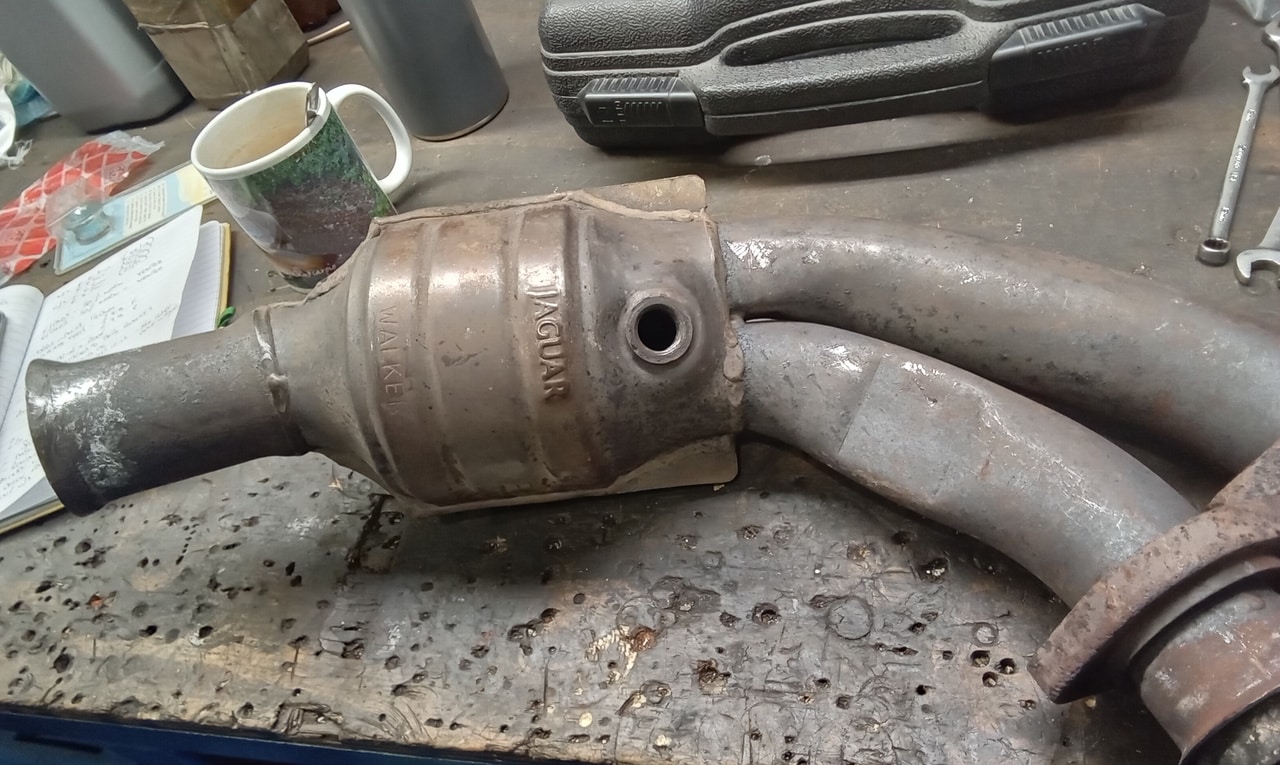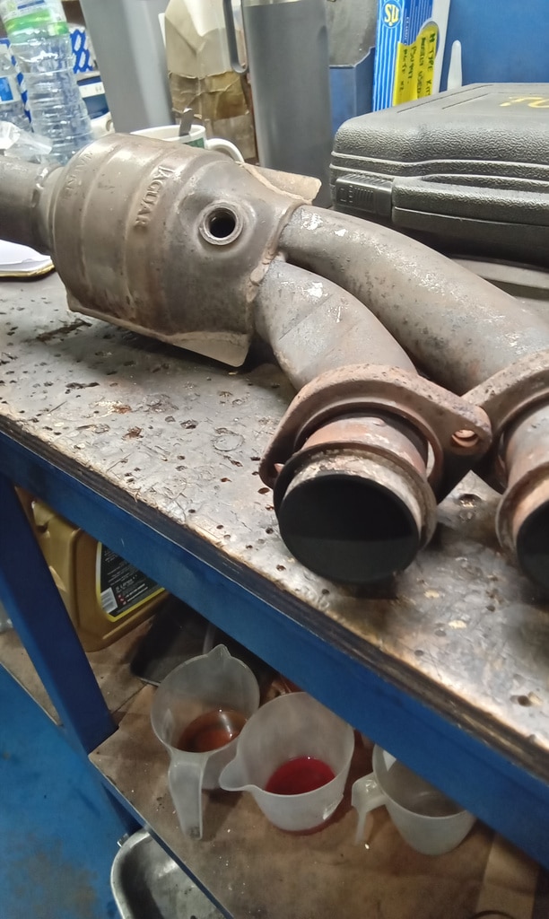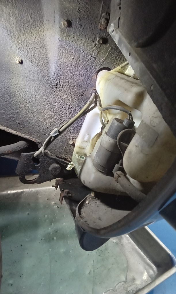 ”Secure dash binnacle trim. Remove offside front arch li er and access washer pump. Not working. Check power to pump, OK. Pump u/s. With John’s help blee brakes and changed brake fluid. Bleed all and top up reservoir. Strip and remove offside Catalyst. Remove oxygen sensor and clean.”