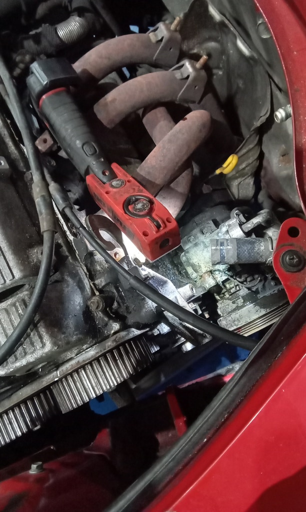 The water pump housing was cleaned and Jonn drilled out the broken bolt and retapped the thread to 6mm. He then refitted it the to engine with new o rings. The new water pump was fitted and secured before a vac test was carried out to check if the system was sealed.