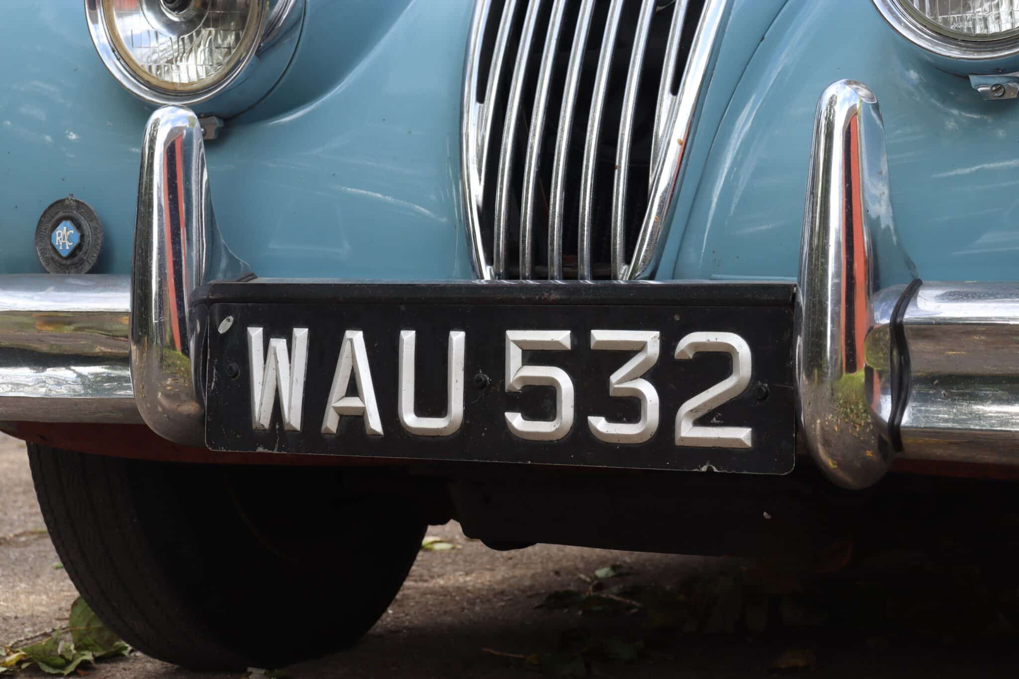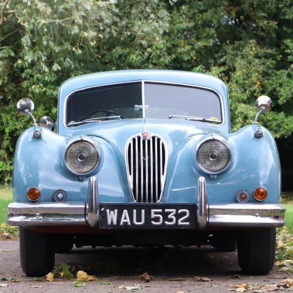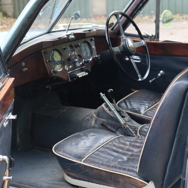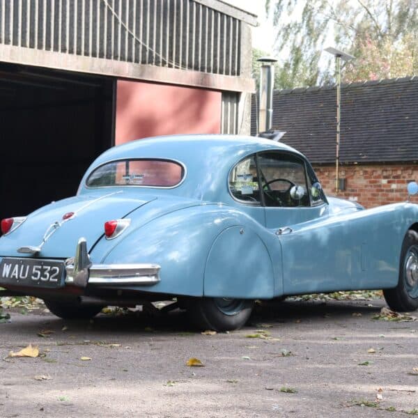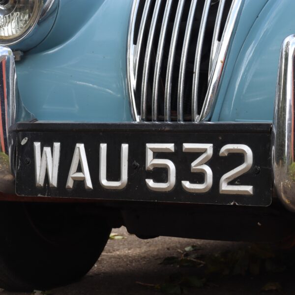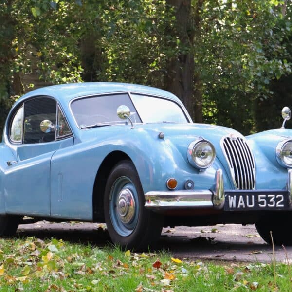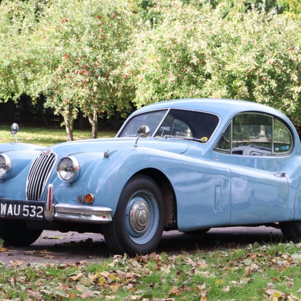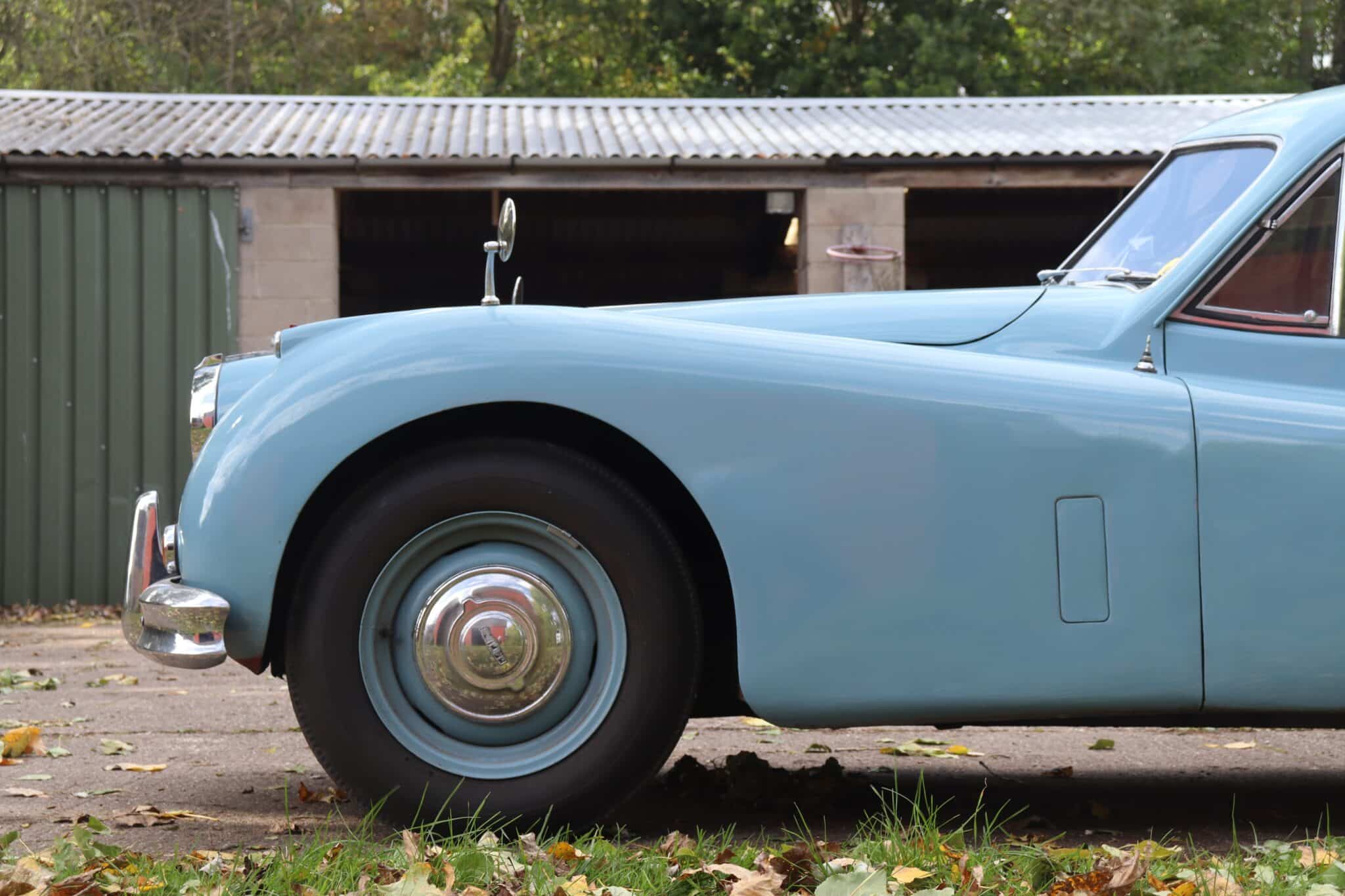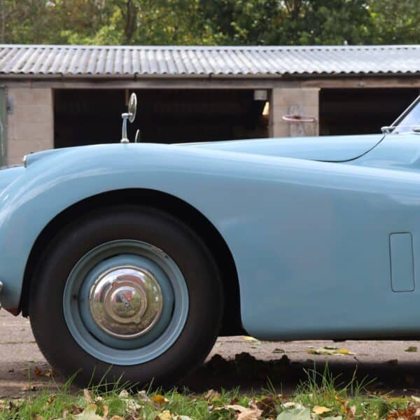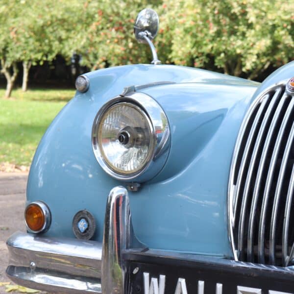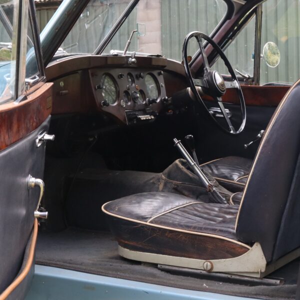 Still wearing its factory-applied colour scheme of Cotswold Blue with a Dark Blue interior, the Jaguar was resprayed in the 1990s but the interior remains outstandingly original. In the present family ownership, it has benefitted from much maintenance combined with extremely light use. Maintenance history is traceable to 1970, when the Jaguar received a light engine overhaul. A more comprehensive overhaul was undertaken by Sporting Cars of Beeston, which included the fitment of a replacement cylinder head. A vast collection of invoices reveals much additional work over the years, including fitment of a stainless-steel exhaust pipe in 1988. In 2022, the twin SU carburettors were overhauled with parts supplied by Burlen, and new front brake cylinders were purchased from the David Manners Group.