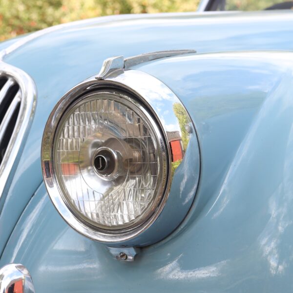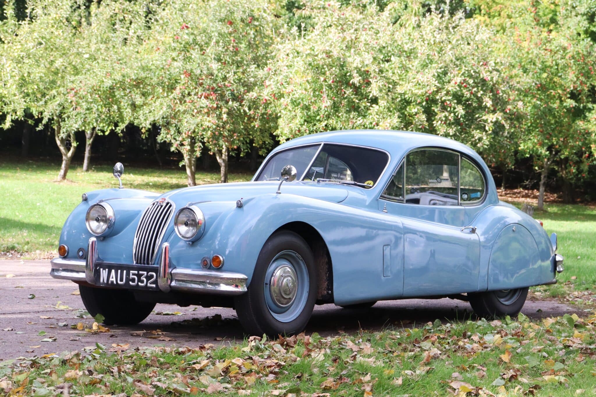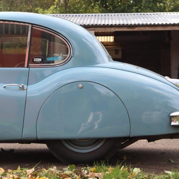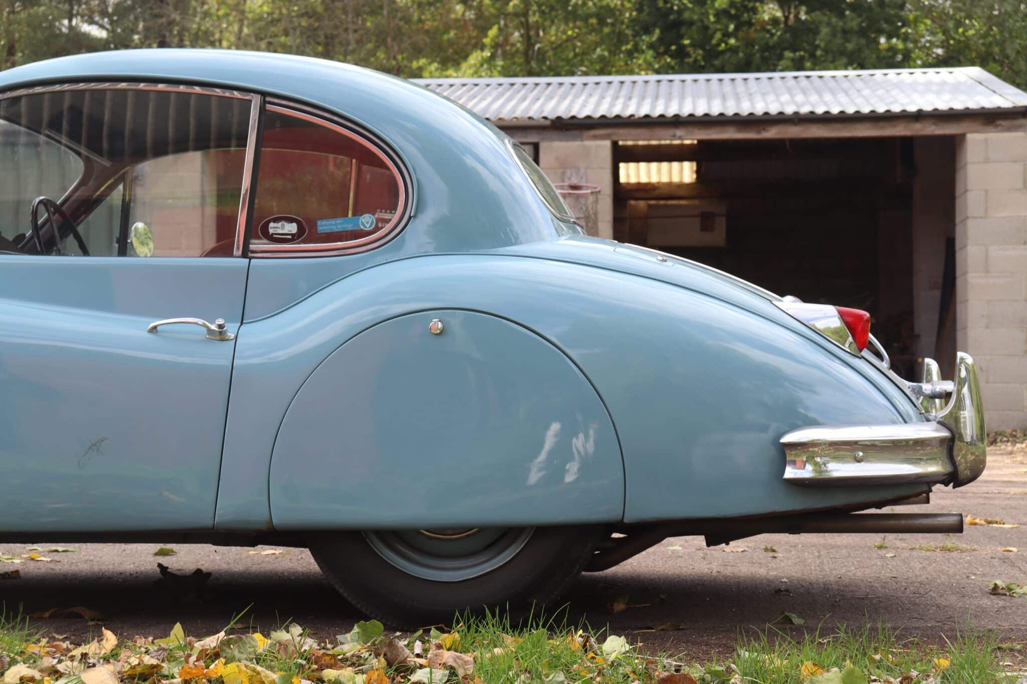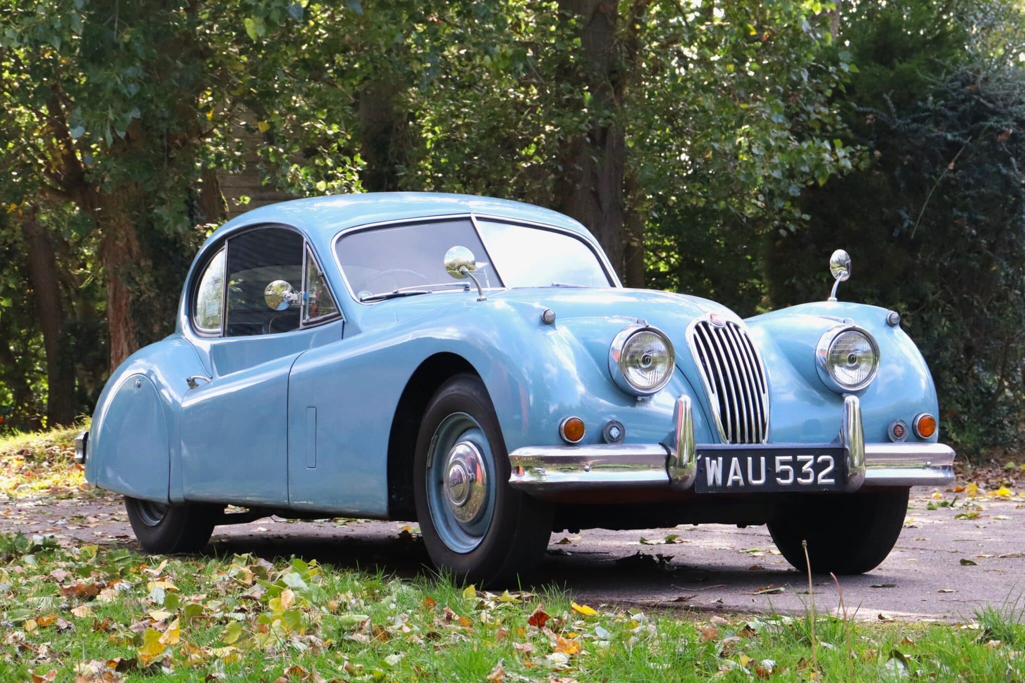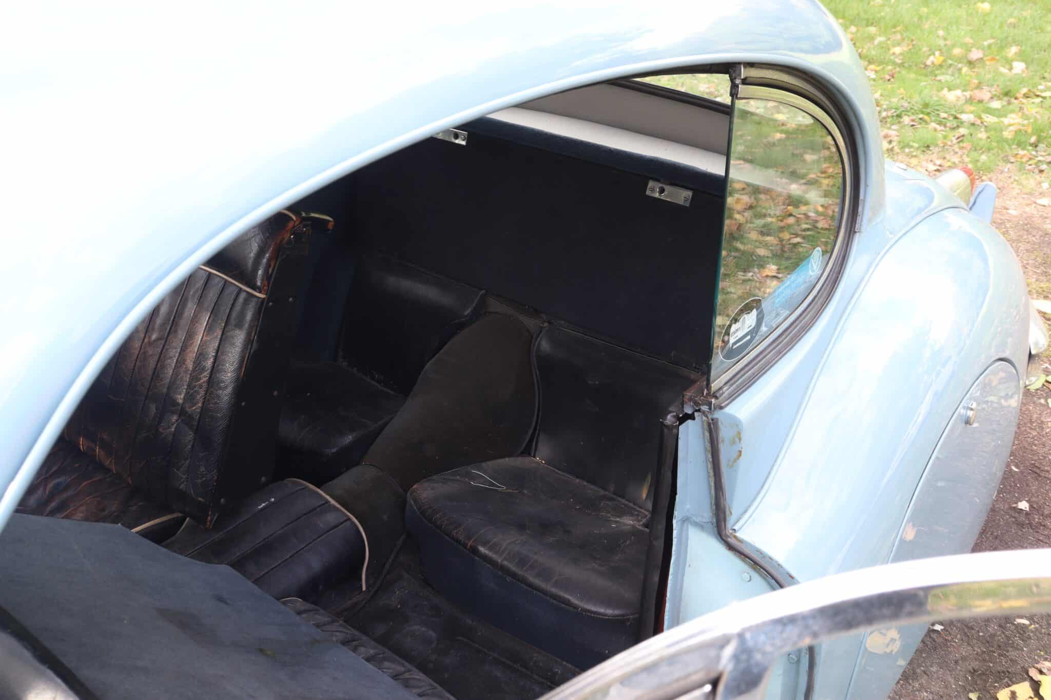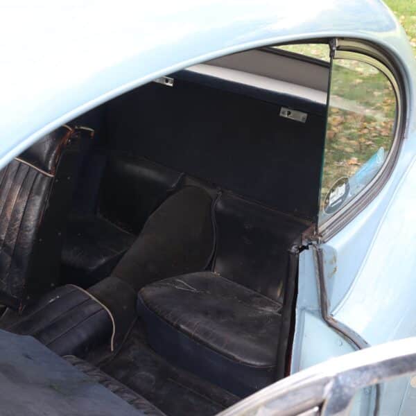 Still wearing its factory-applied colour scheme of Cotswold Blue with a Dark Blue interior, the Jaguar was resprayed in the 1990s but the interior remains outstandingly original. In the present family ownership, it has benefitted from much maintenance combined with extremely light use. Maintenance history is traceable to 1970, when the Jaguar received a light engine overhaul. A more comprehensive overhaul was undertaken by Sporting Cars of Beeston, which included the fitment of a replacement cylinder head. A vast collection of invoices reveals much additional work over the years, including fitment of a stainless-steel exhaust pipe in 1988. In 2022, the twin SU carburettors were overhauled with parts supplied by Burlen, and new front brake cylinders were purchased from the David Manners Group.