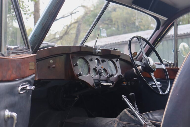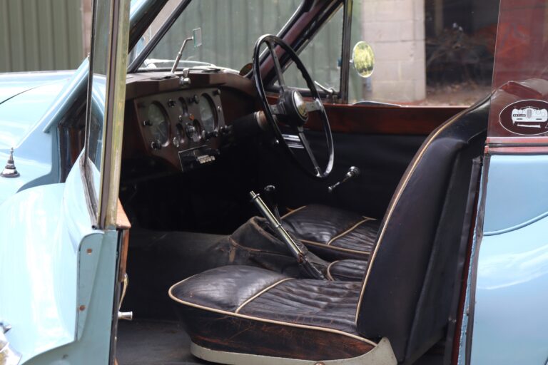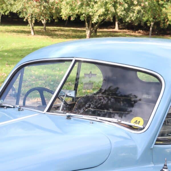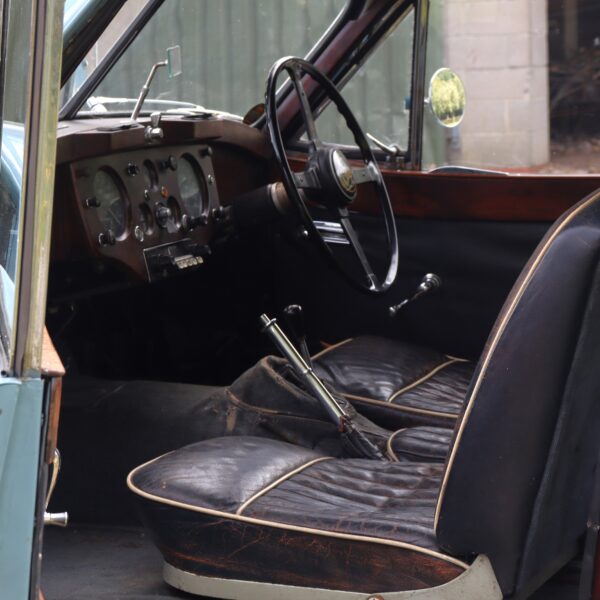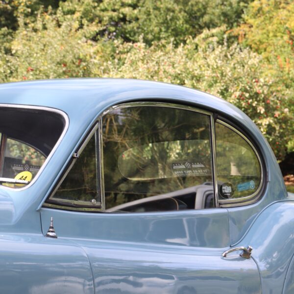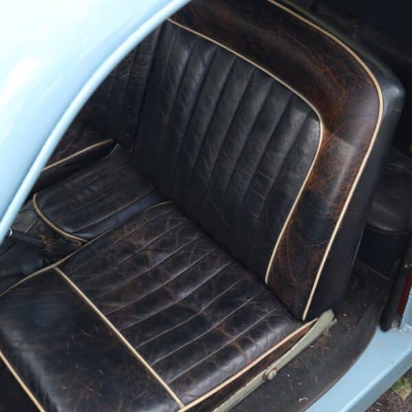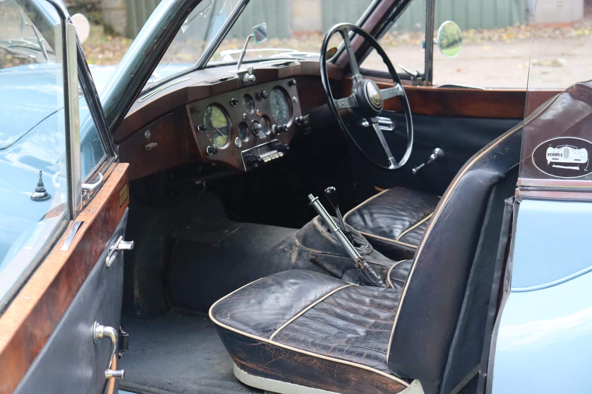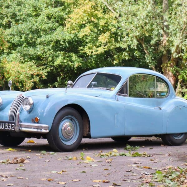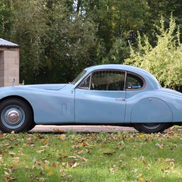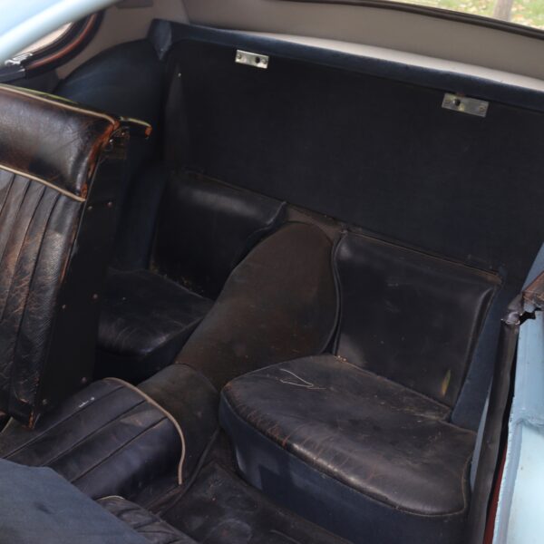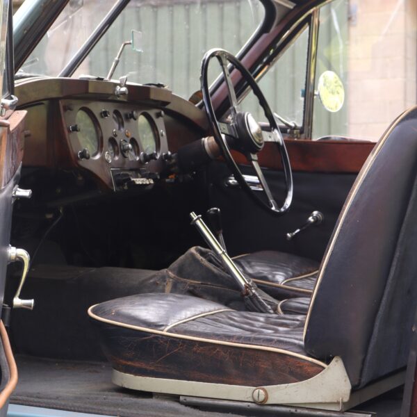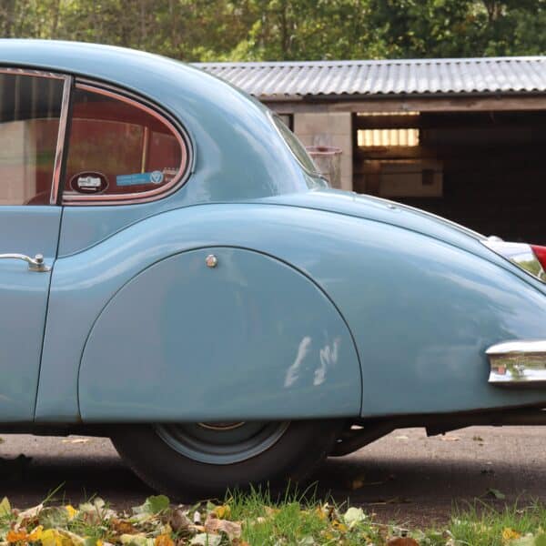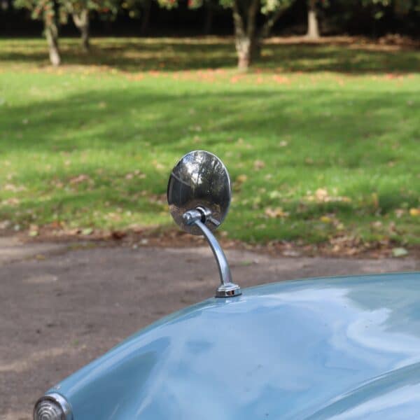Still wearing its factory-applied colour scheme of Cotswold Blue with a Dark Blue interior, the Jaguar was resprayed in the 1990s but the interior remains outstandingly original. In the present family ownership, it has benefitted from much maintenance combined with extremely light use. Maintenance history is traceable to 1970, when the Jaguar received a light engine overhaul. A more comprehensive overhaul was undertaken by Sporting Cars of Beeston, which included the fitment of a replacement cylinder head. A vast collection of invoices reveals much additional work over the years, including fitment of a stainless-steel exhaust pipe in 1988. In 2022, the twin SU carburettors were overhauled with parts supplied by Burlen, and new front brake cylinders were purchased from the David Manners Group.