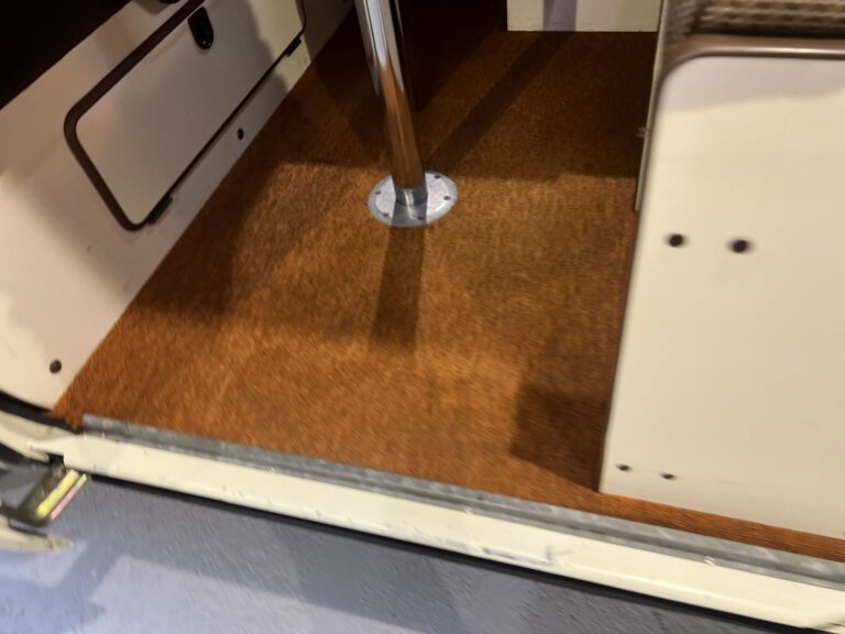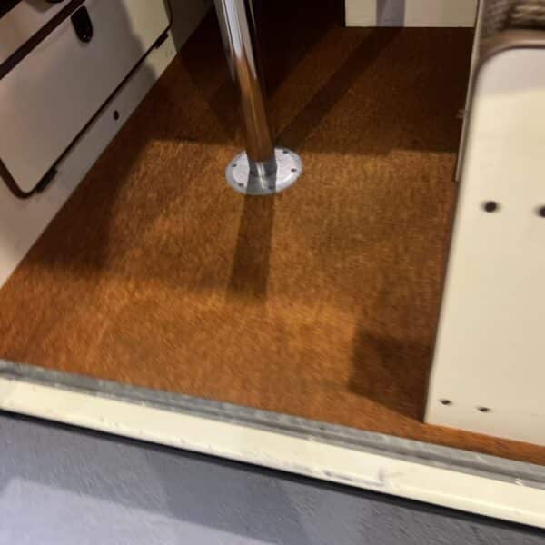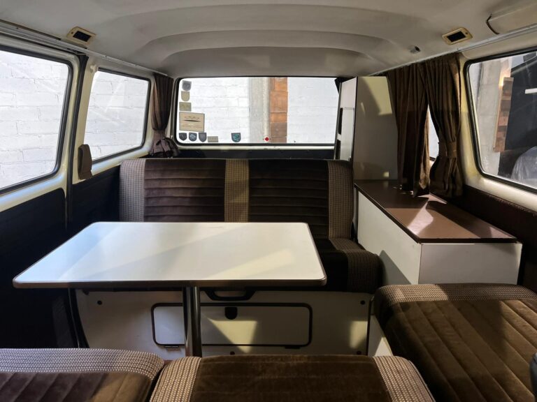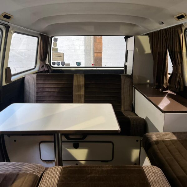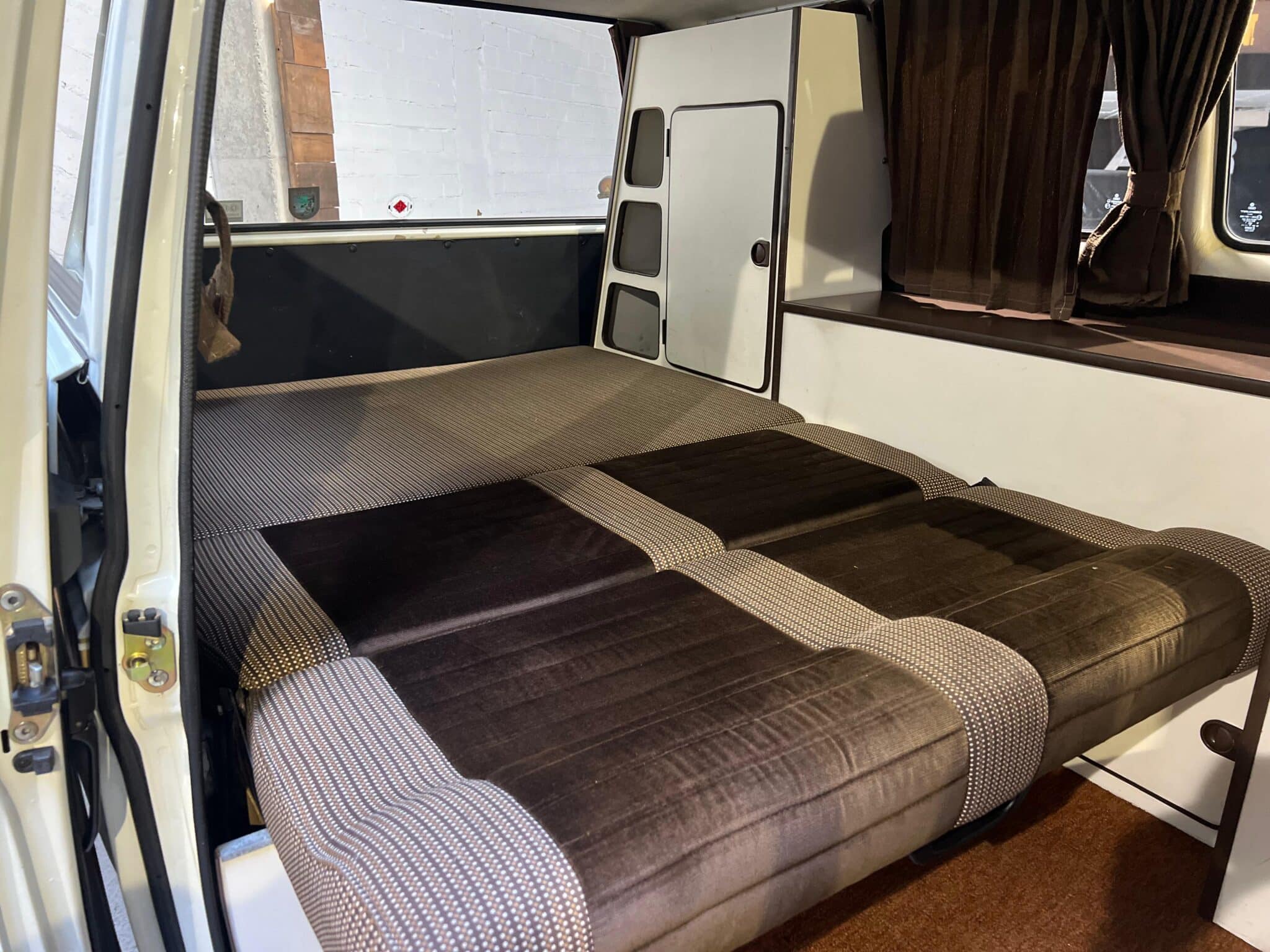Sin restaurar y con un magnífico aspecto original. La cabina ofrece el inconfundible encanto de un Volkswagen clásico, con asientos impecables, alfombras impecables y un techo interior impecable, algo poco común en una autocaravana de esta antigüedad.