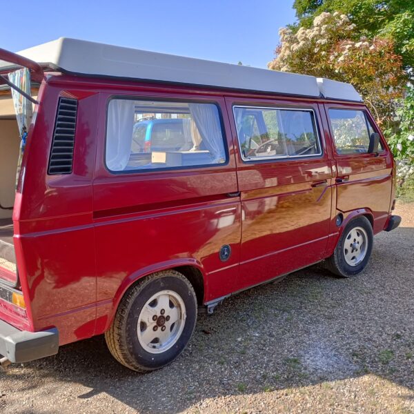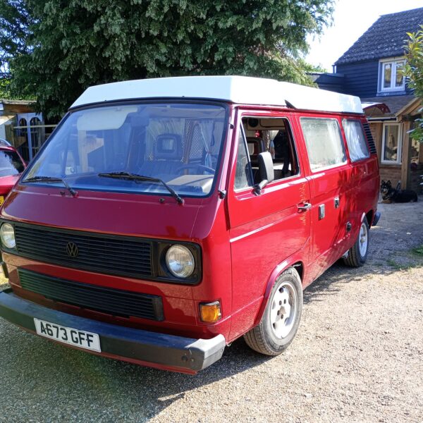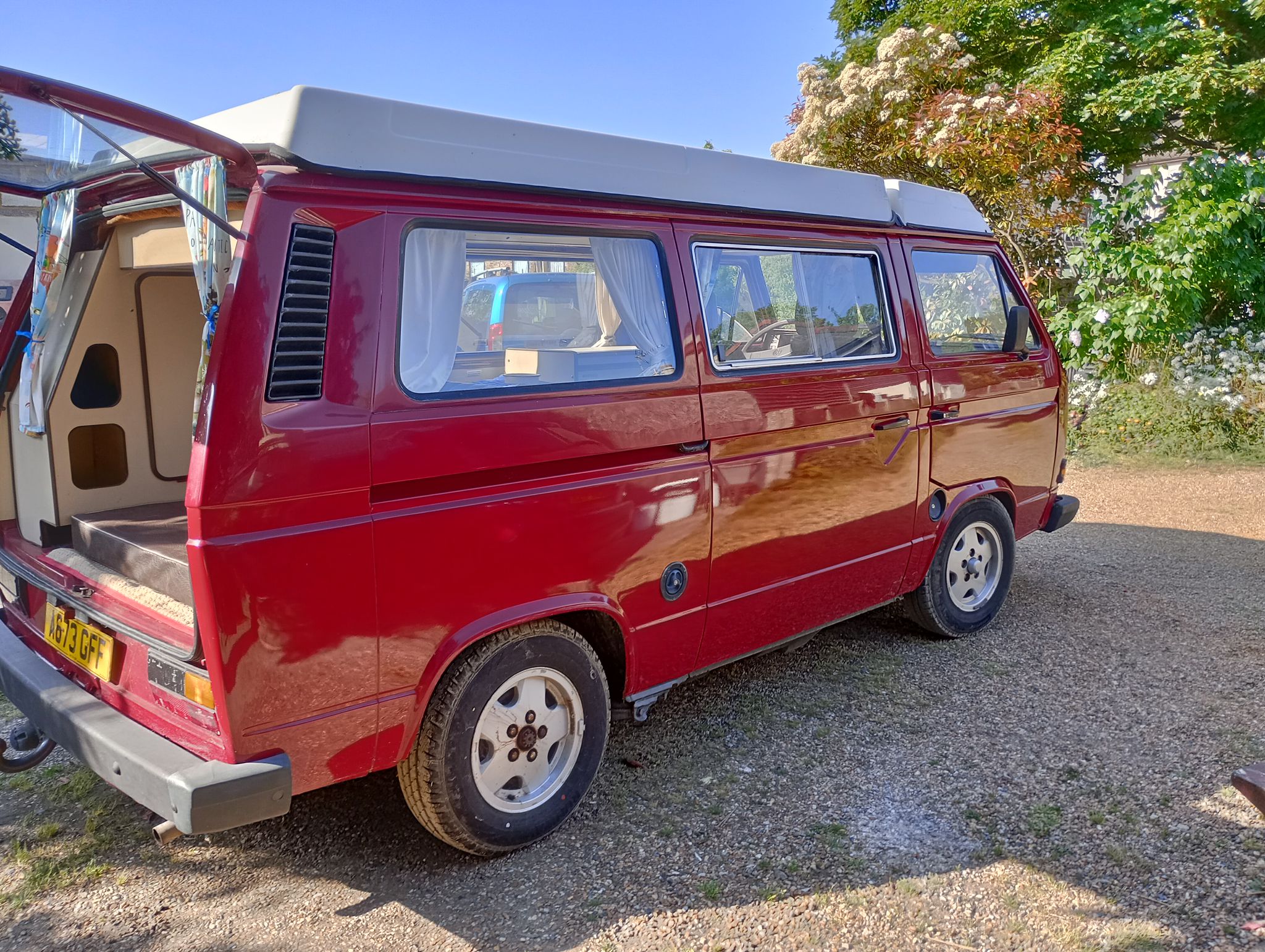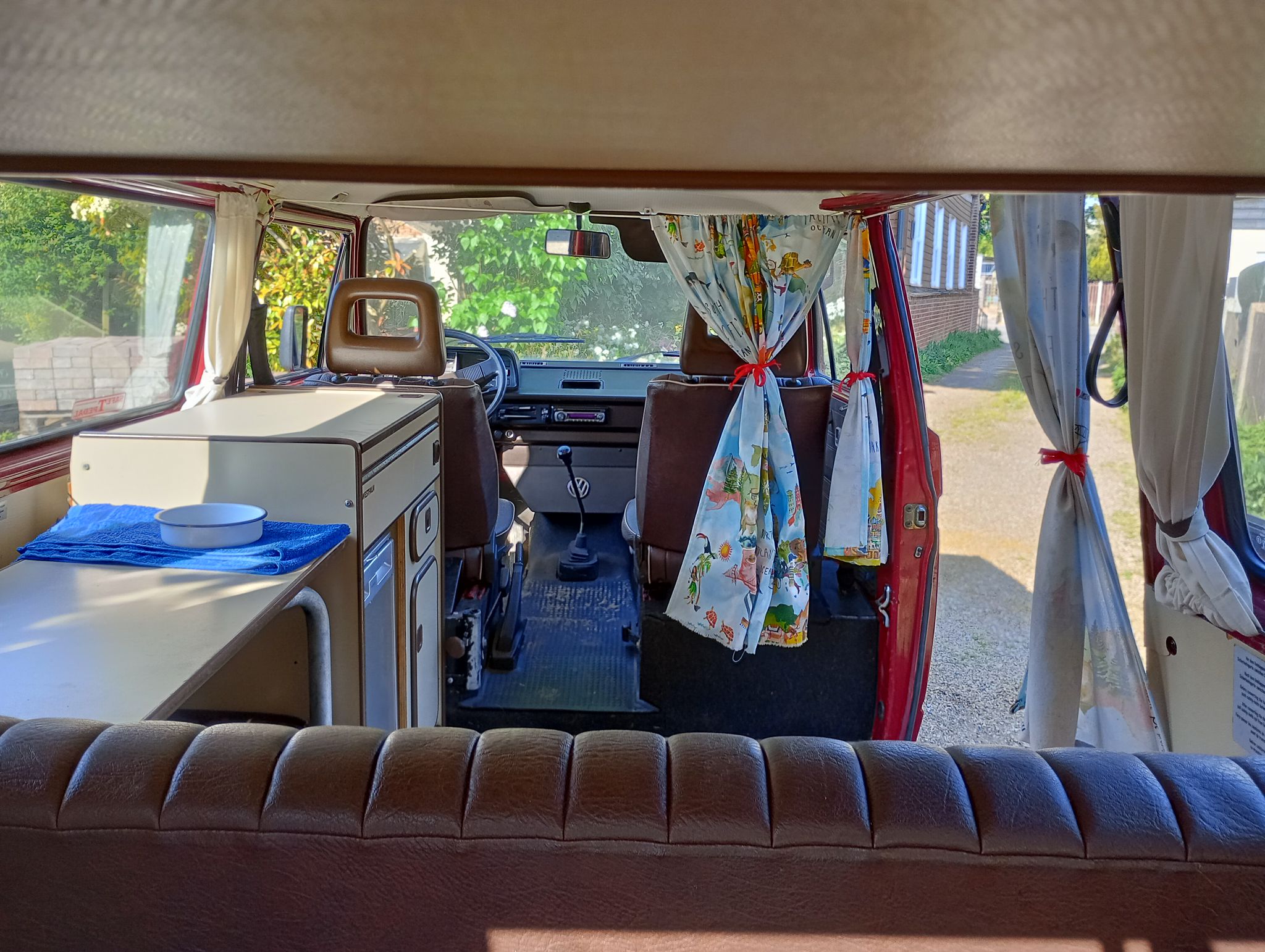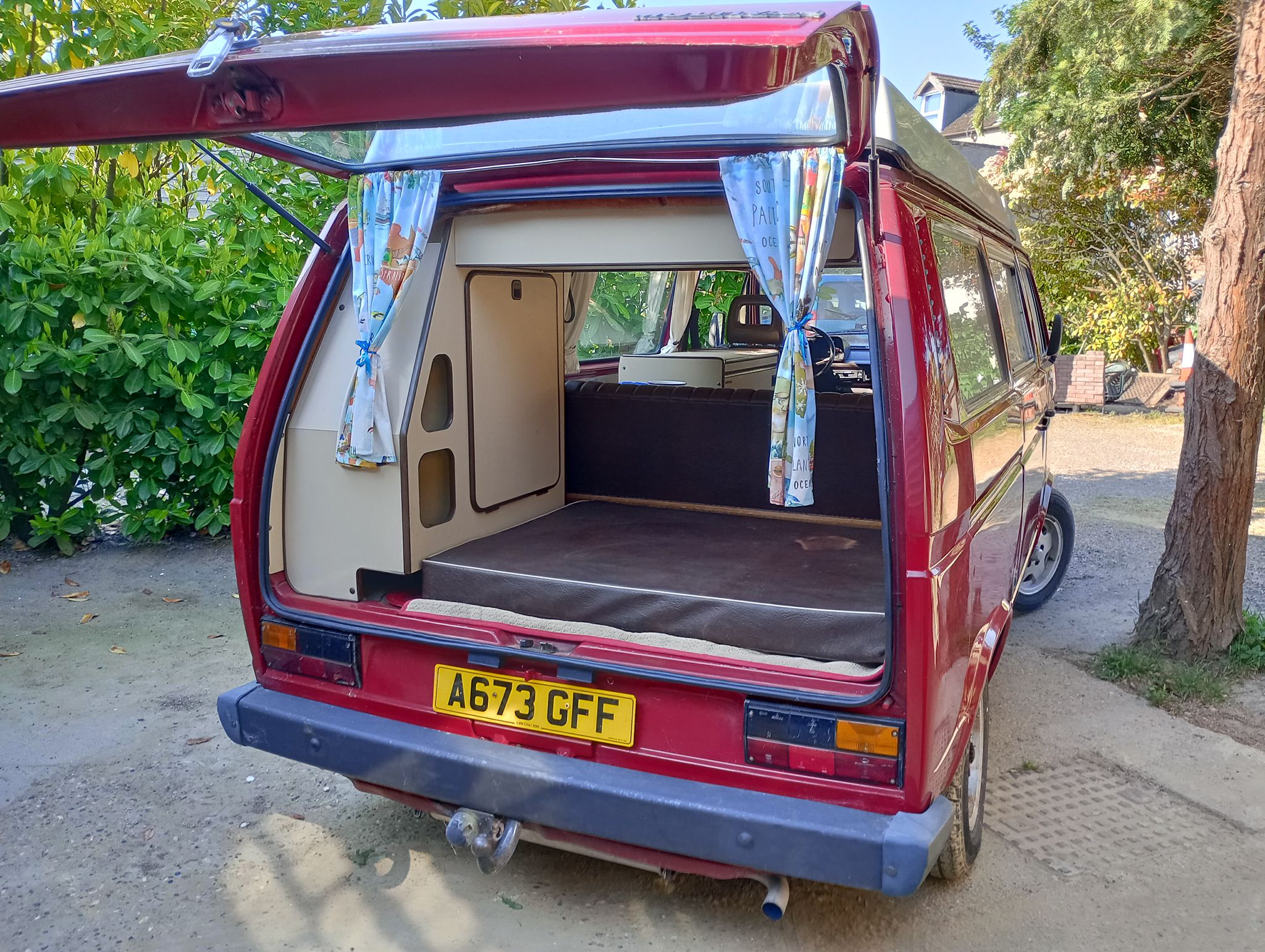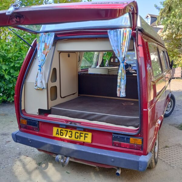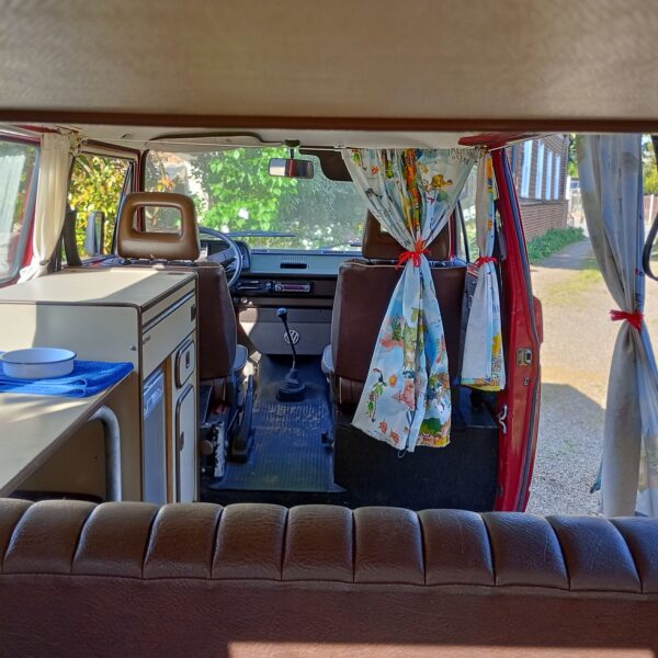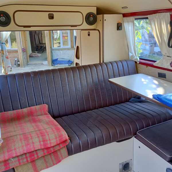 Fully insulated with double glazing and curtains. Sink, two burner gas hobs, rotating table, new domestic/ Waeco CRX50 12V Compressor Fridge (fitted in June 2020). Leather ‘Rock n Roll’ double bed, with bedding storage area under seat, and a double bed in pop-top roof.