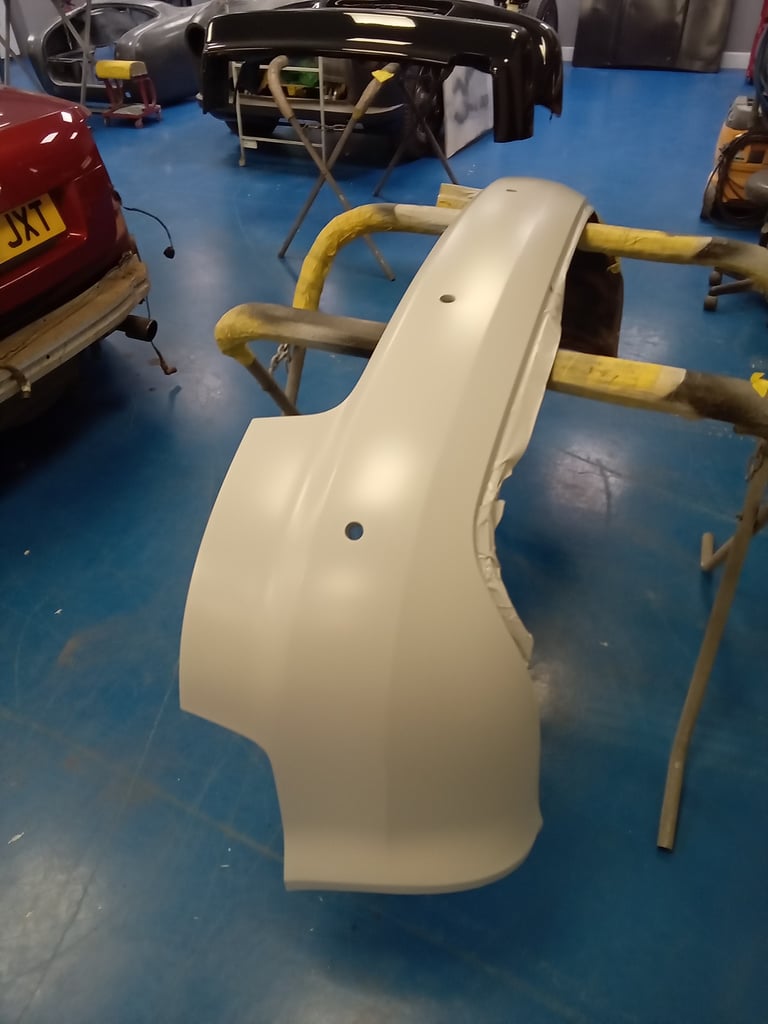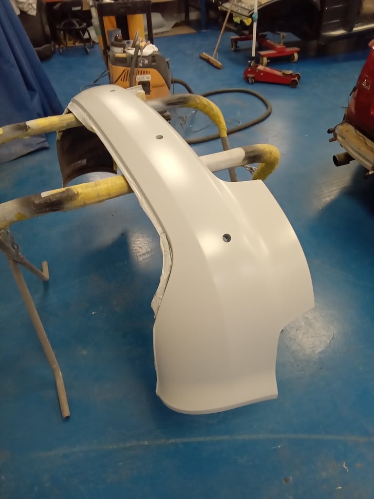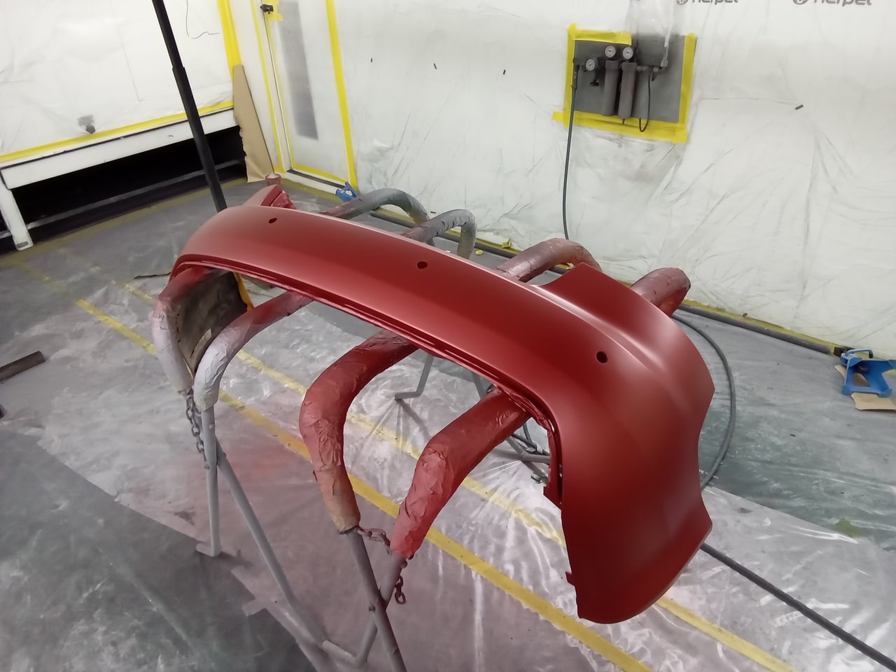 After prepping the bumper, it was primed, cured and then shot in matching red before being put back on the car.
