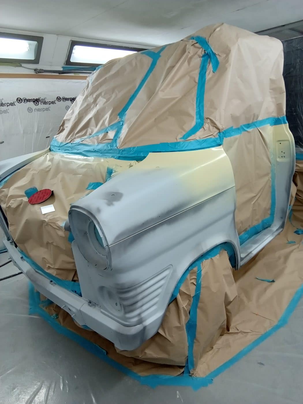 Our 1972 Ford Transit Tipper MKI has been in the Bridge Classic Cars paintshop with classic car technician Mauro. After being primed, the vehicle was ready for Mauro to begin the painting process.