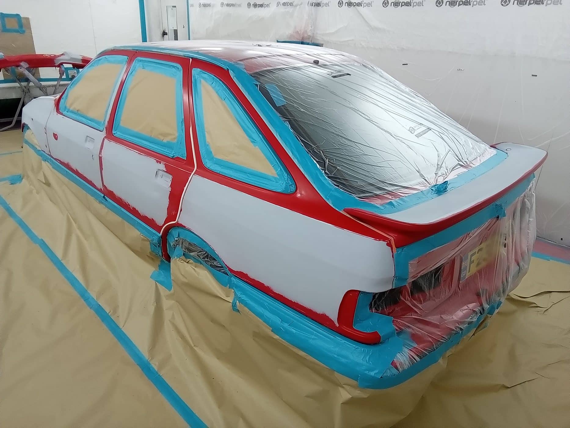 After the car was prepared for paint, it spent some time in the paint booth while it was painted in its great looking red.