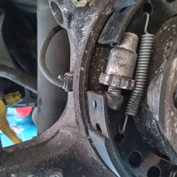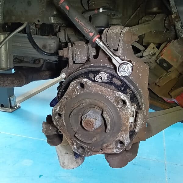To address this, the bolts securing the shield were heated for removal. One bolt snapped during this process, but it did not affect the outcome. Jonn modified the backplate as necessary, cleaned out the bolt holes, and applied lubricant to the bolts. Washers were used to secure the backplate in place. The disc was then refitted, followed by the calliper, with Loctite applied to the bolts for security. Jonn adjusted the handbrake shoes to the correct setting and refitted the wheel, tightening it to a torque of 160Nm.