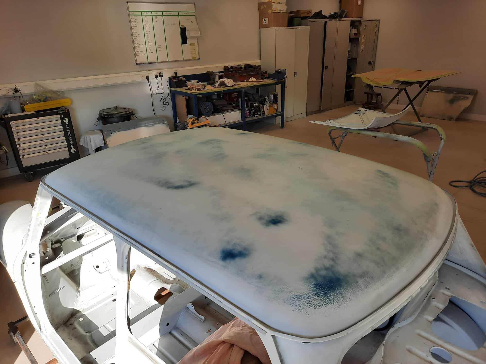 Our paint and body restoration technician Mauro has worked on preparing the classic Mini. The car arrived into us in grey primer, but the team have begun body sanding the entire shell to make sure that every curve and panel is in perfect shape before it finally gets its new colour.