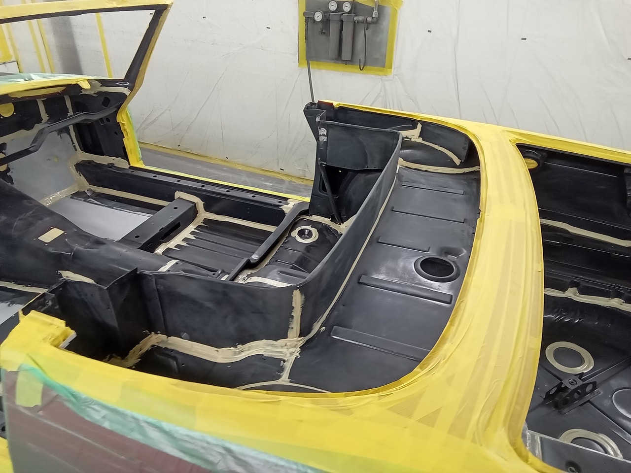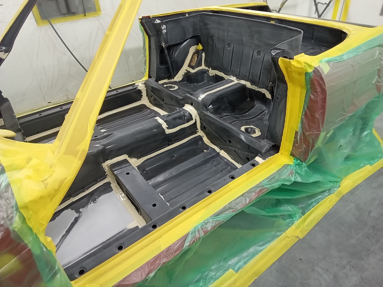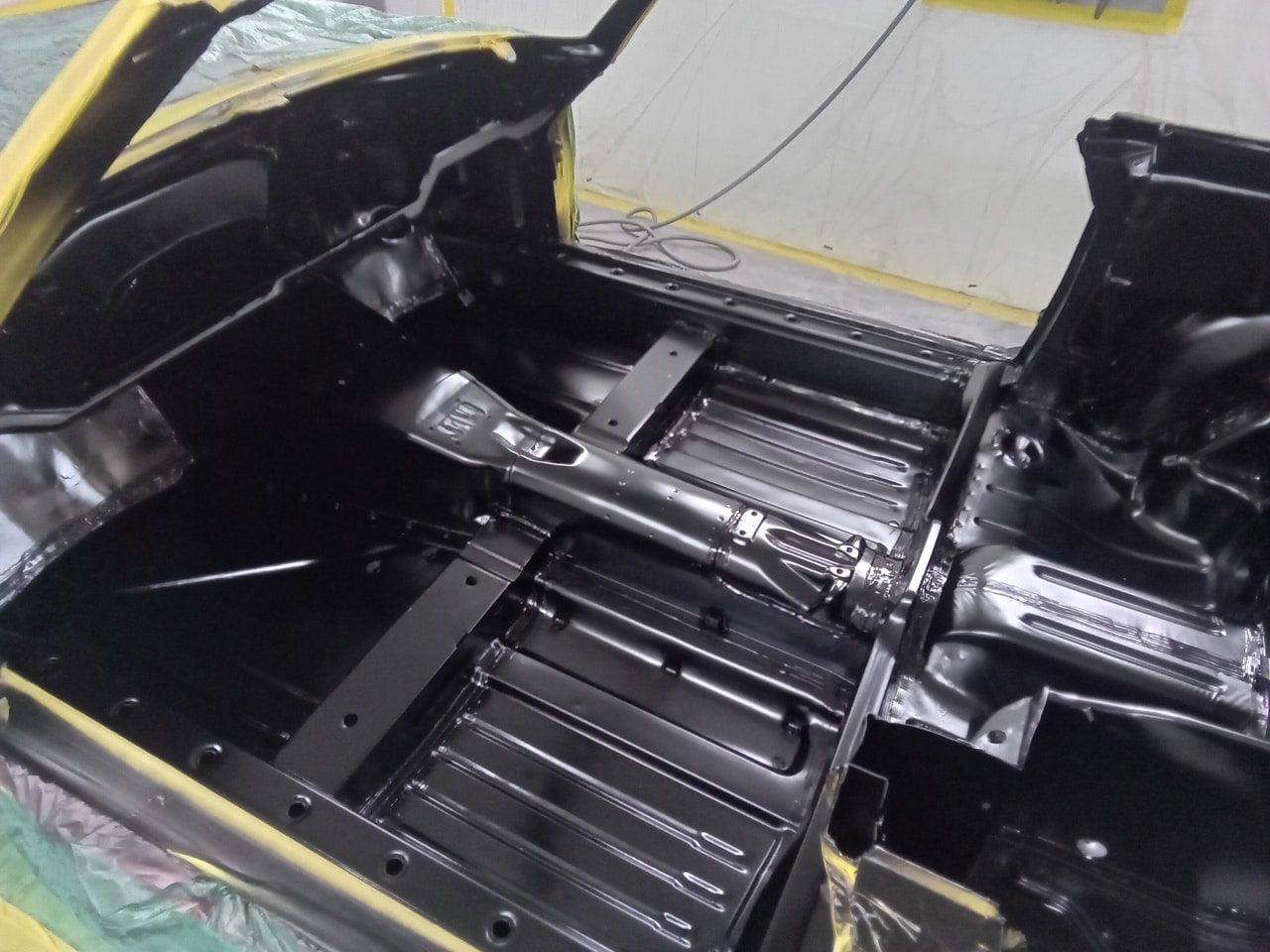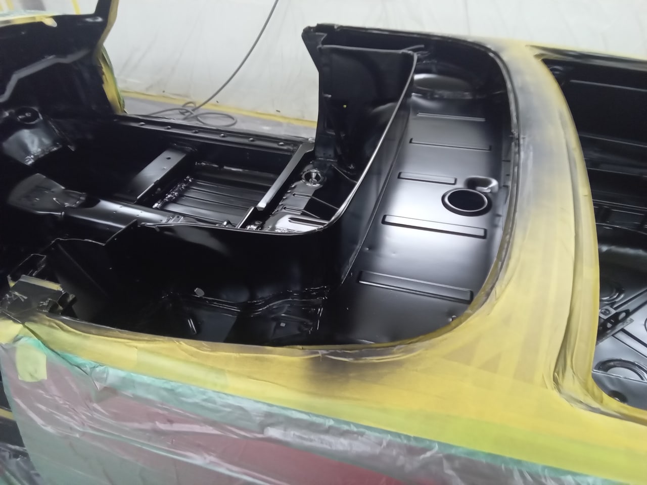 The paint and body team have had the 1978 Mercedes 350SL in our in-house paint booth for our paint and body technician Chris to take the bodyshell to the next level. Chris has carefully cleaned down the floor and boot pans before then seam sealing all the joints and then applied a heavy duty durable satin black DTM.