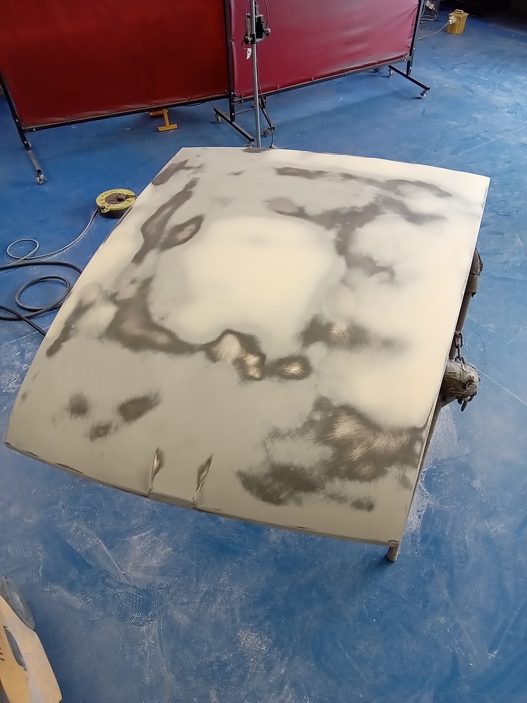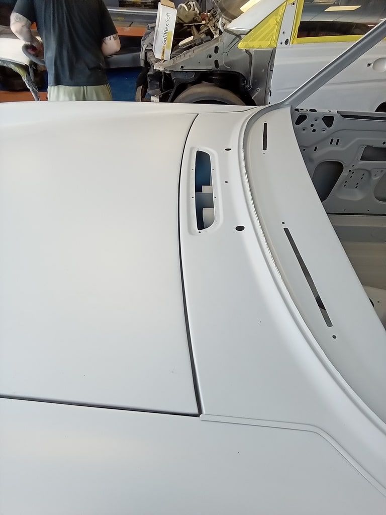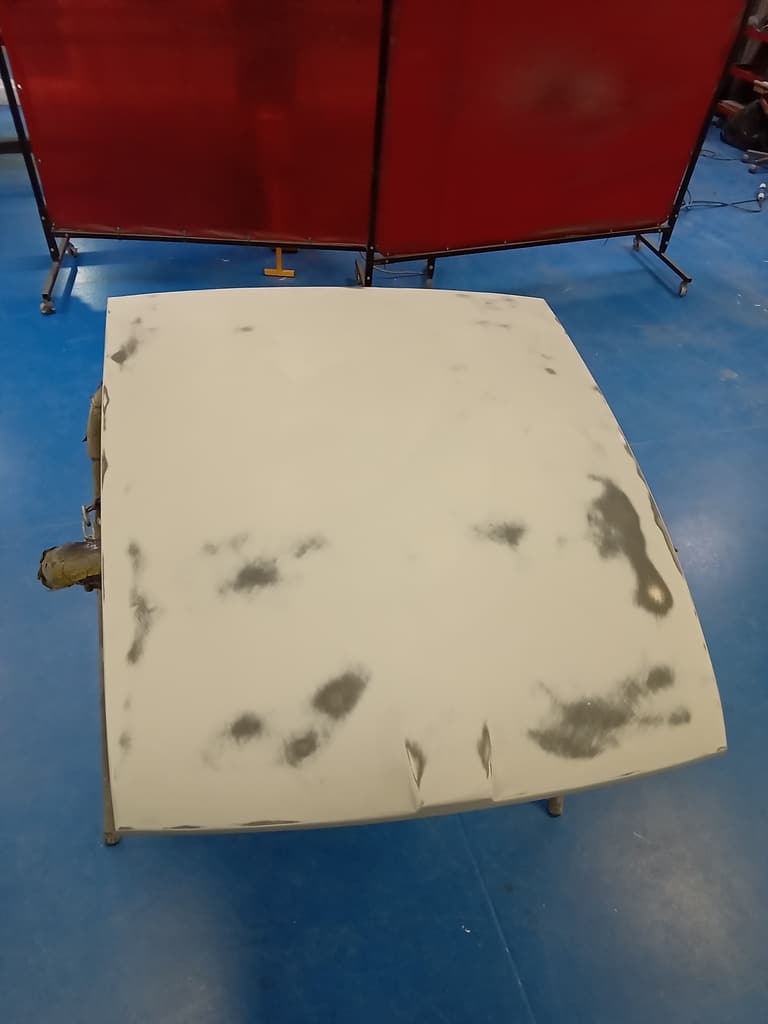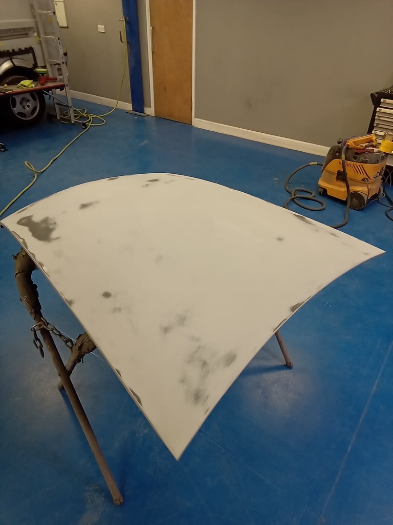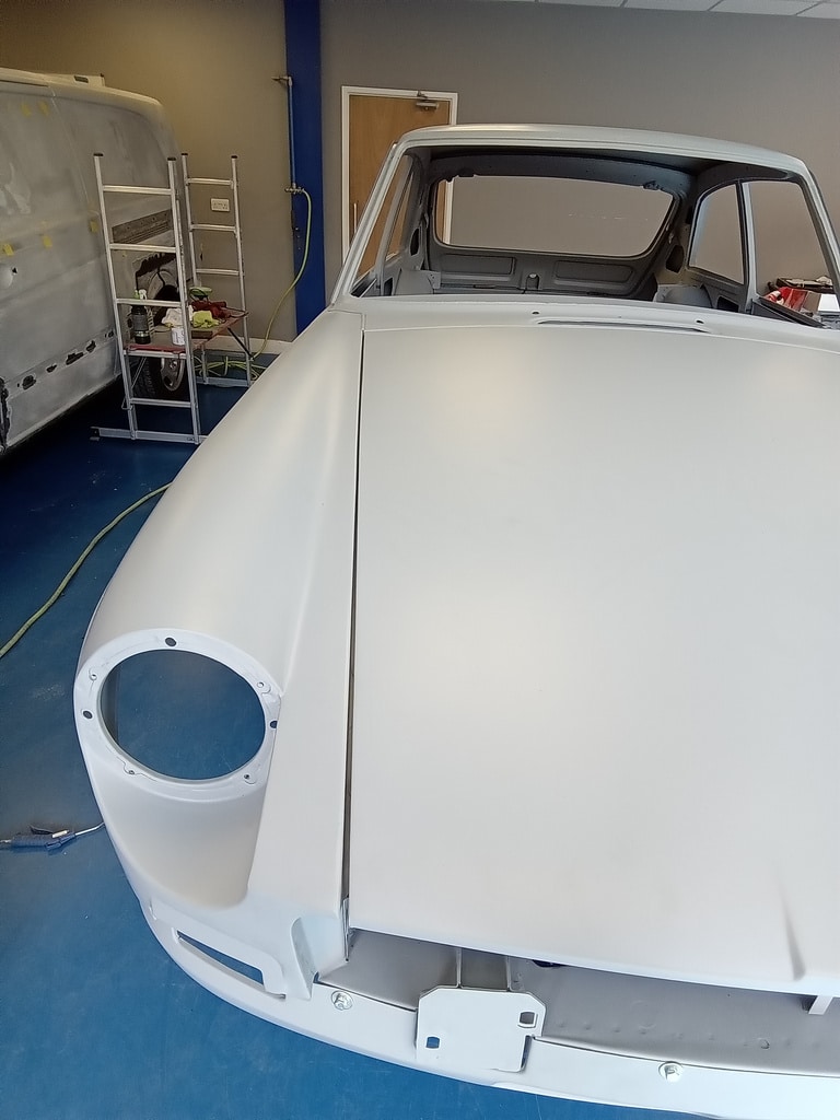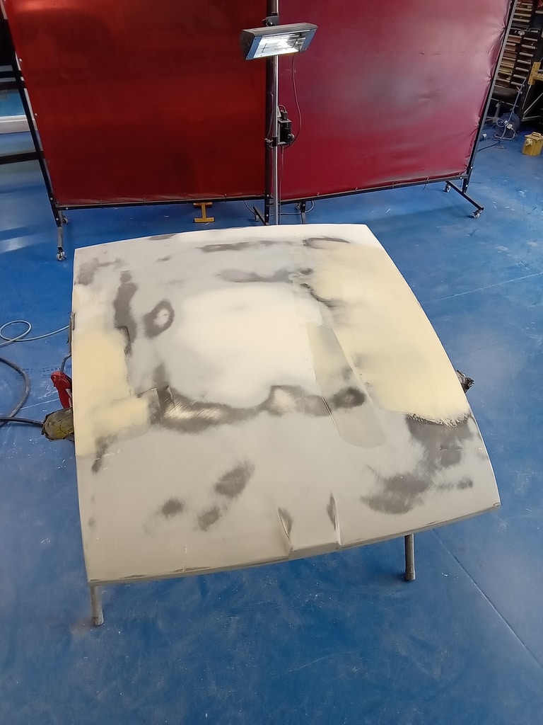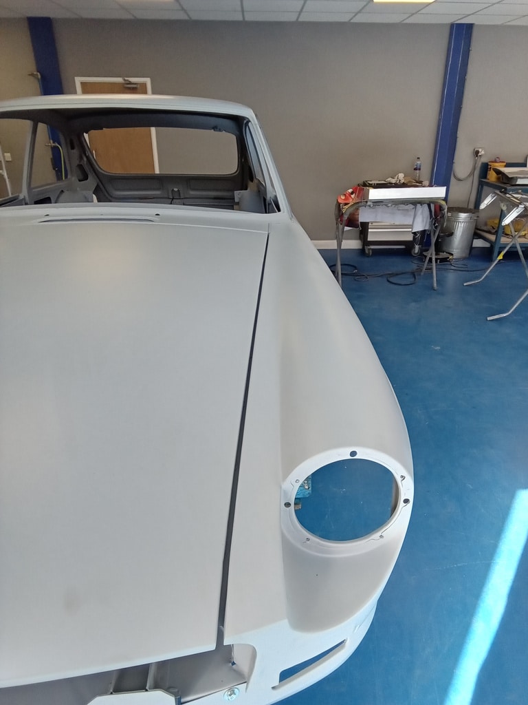 Since its arrival last week, the heritage bodyshell for our 1975 MGB GT V8 has been a hive of activity. Whilst our technician Rob has been busy adjusting and refining the doors, our paint and body technician Adam has been hard at work panel levelling the bonnet of the ready to go into Polyfan. Using a variety of methods to bring up any low spots and knock back any high points in order to get everything just how it should be before the team move on to the next phase with the new bodyshell.