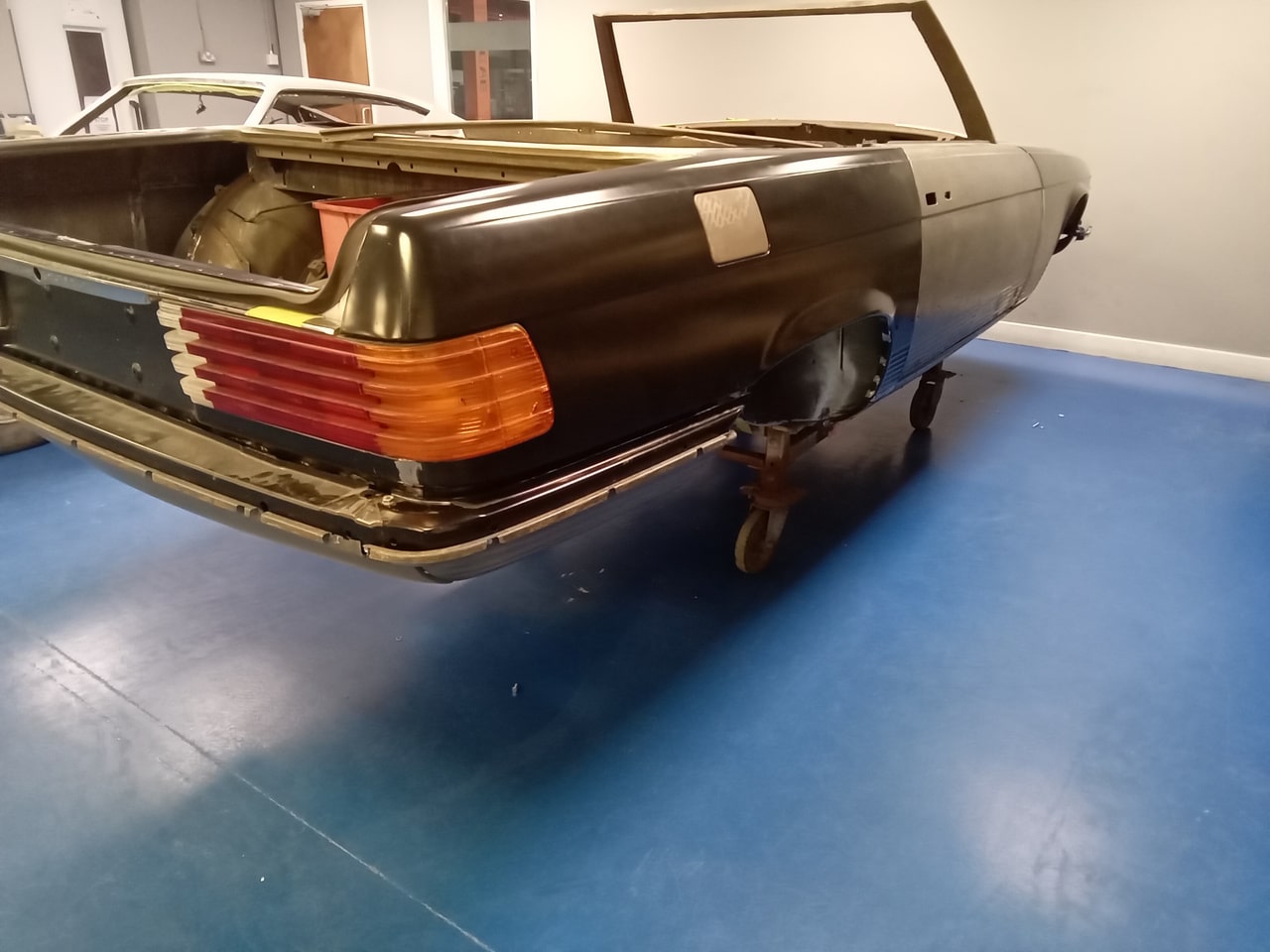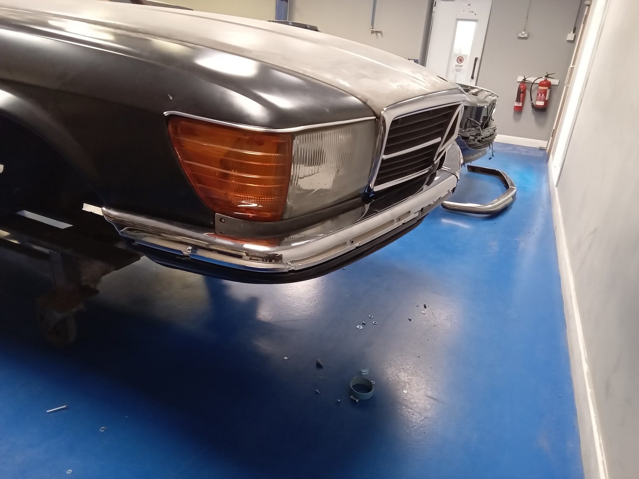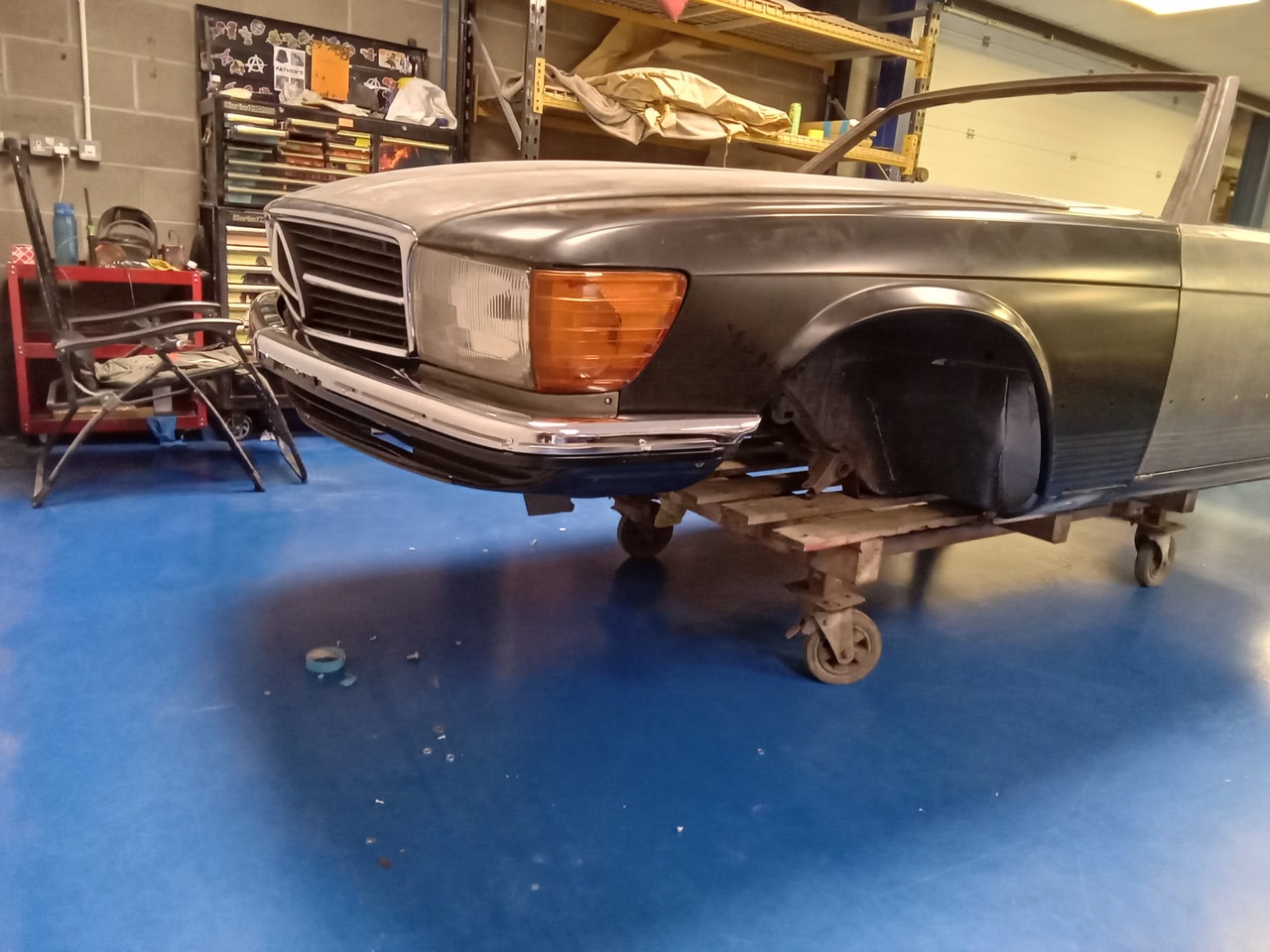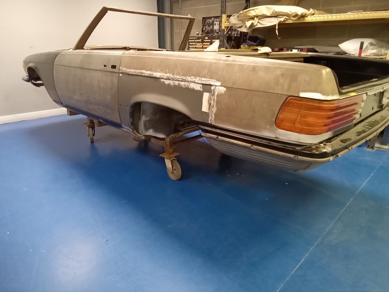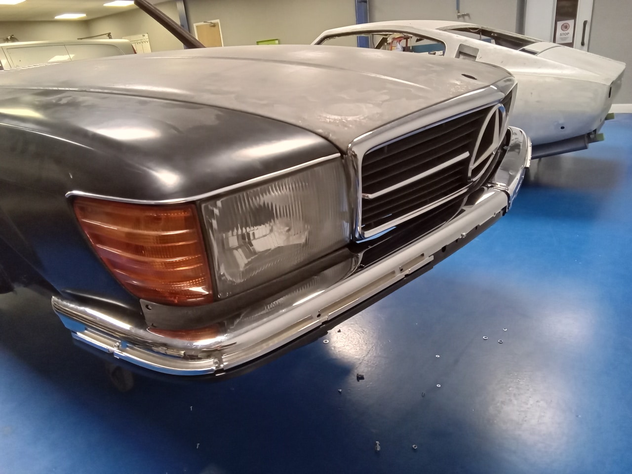 Chris, our paintshop manager, applied epoxy primer to various parts of our 1978 Mercedes 350SL in preparation for panel levelling here at the Bridge Classic Cars restoration workshops. He began fitting up the car to check the panel gaps and carry out the necessary adjustments, including the first fitting of the bumpers and some of the chrome work. Attention was then given to refining the bumper fitment to ensure everything aligned correctly.