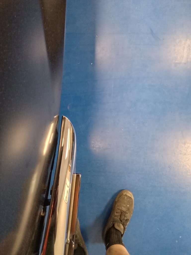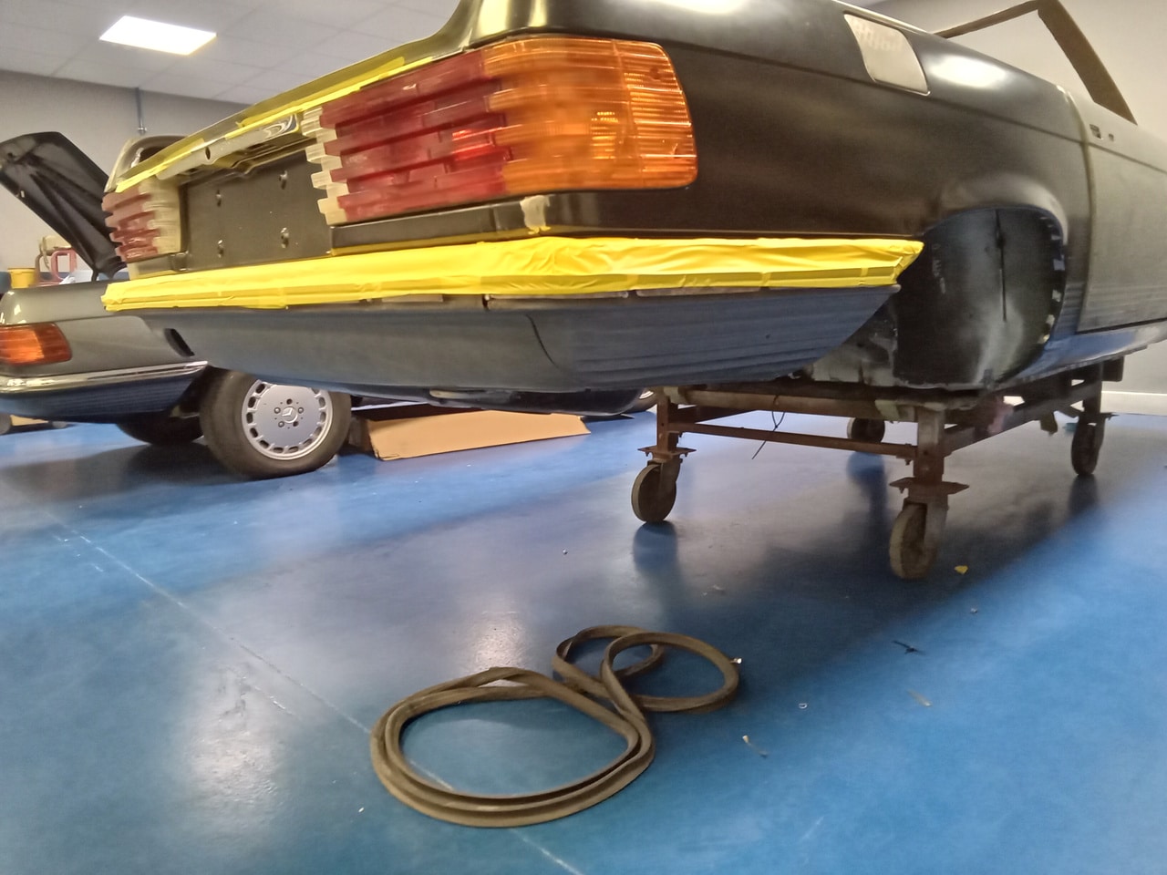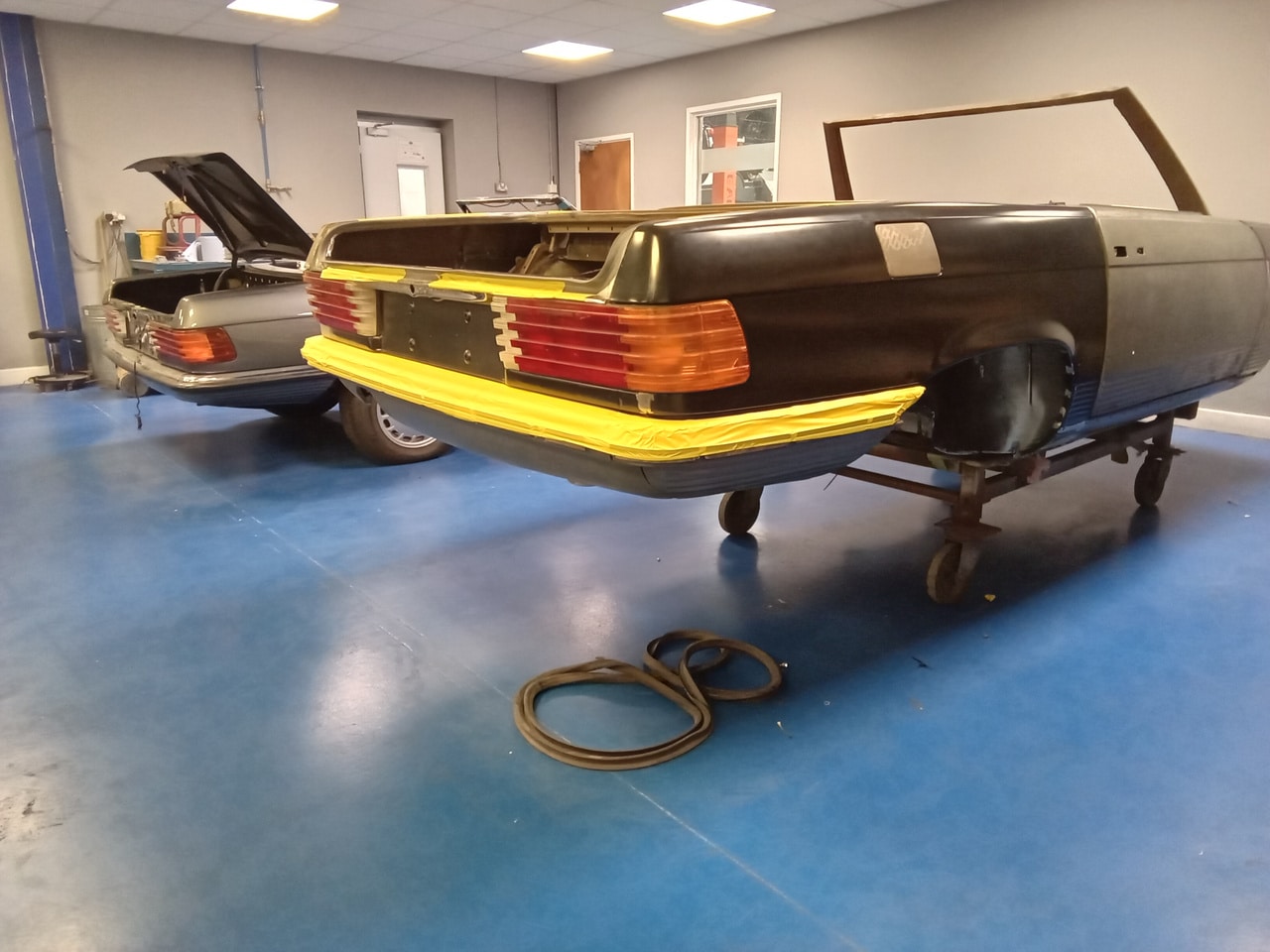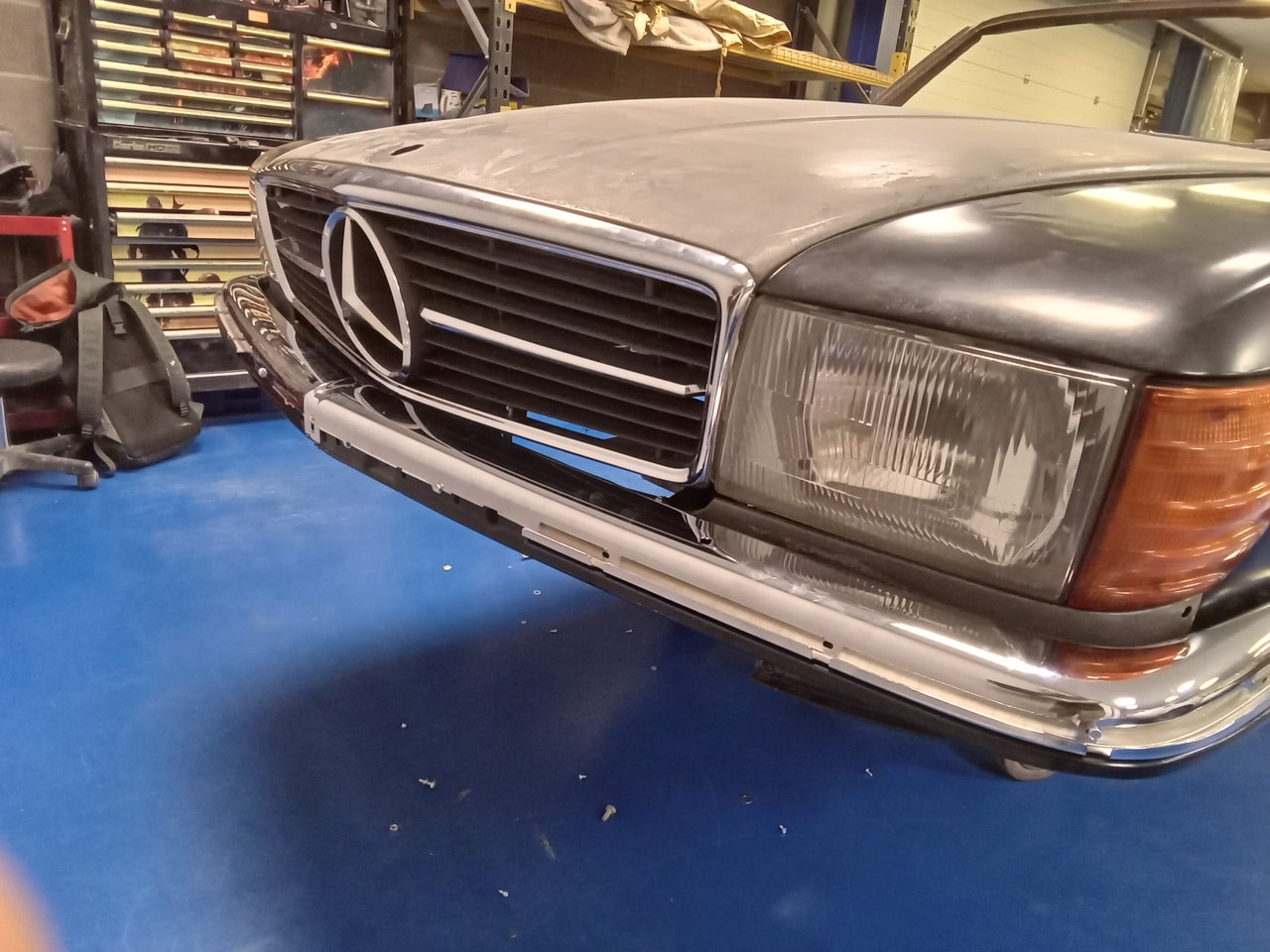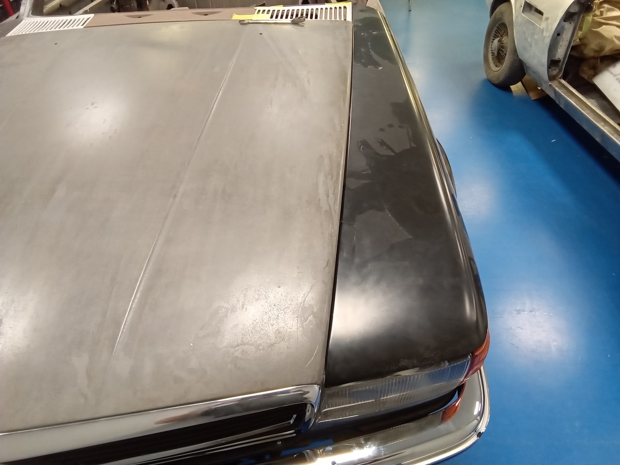 Chris, our paintshop manager, applied epoxy primer to various parts of our 1978 Mercedes 350SL in preparation for panel levelling here at the Bridge Classic Cars restoration workshops. He began fitting up the car to check the panel gaps and carry out the necessary adjustments, including the first fitting of the bumpers and some of the chrome work. Attention was then given to refining the bumper fitment to ensure everything aligned correctly.