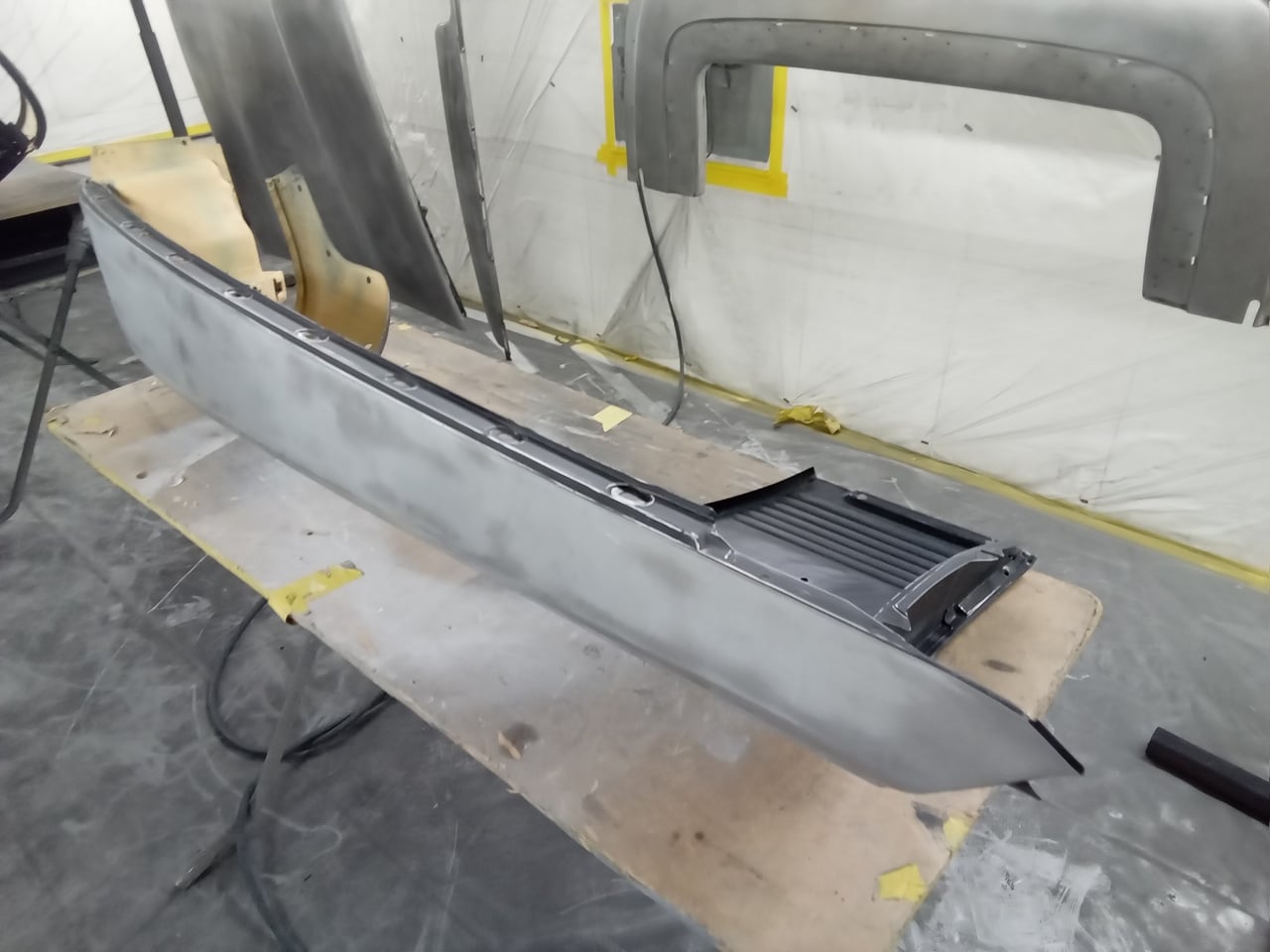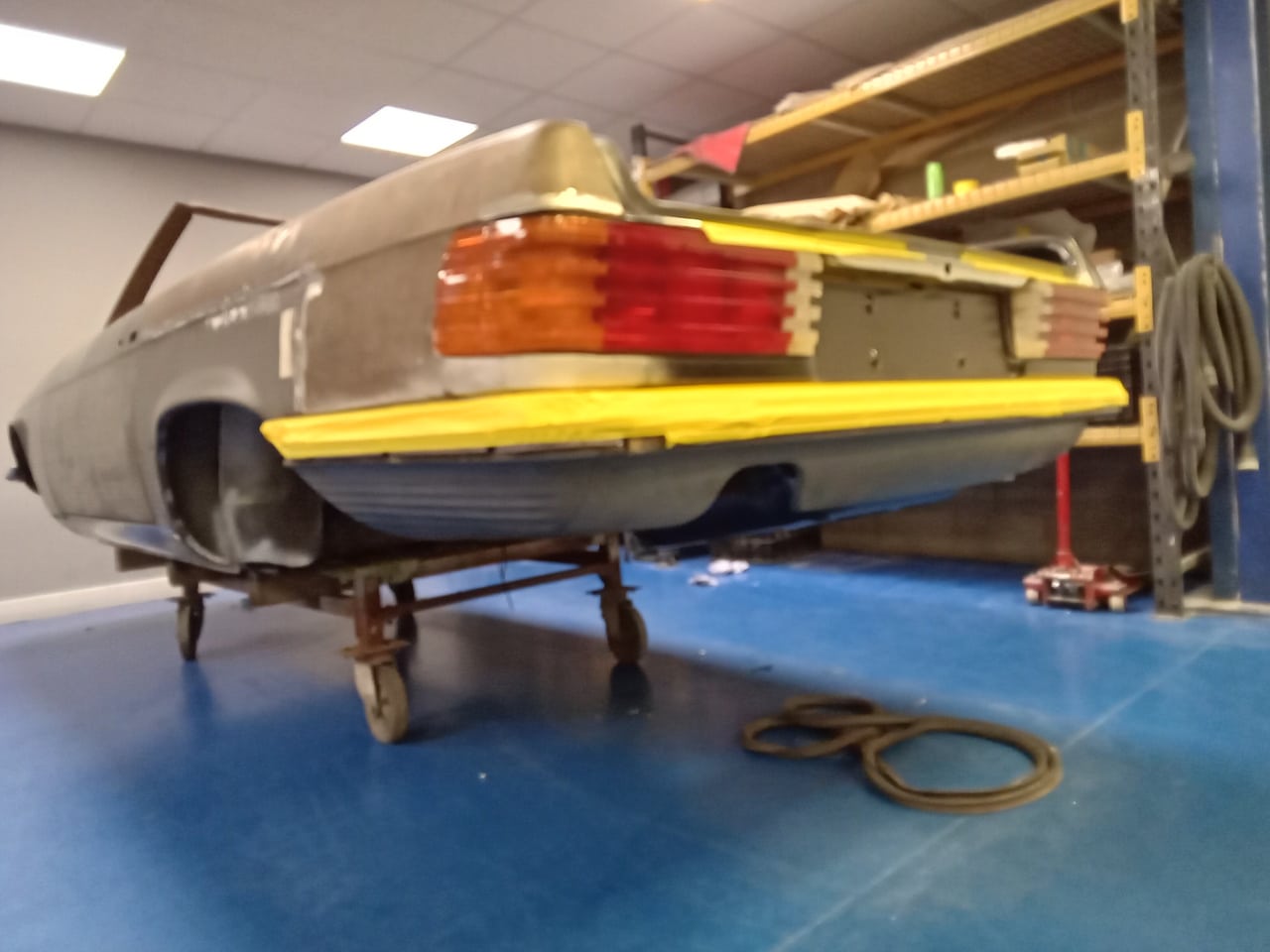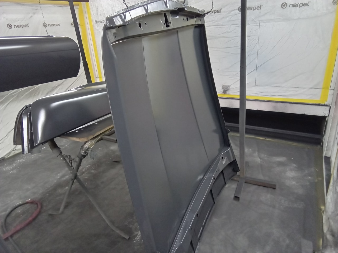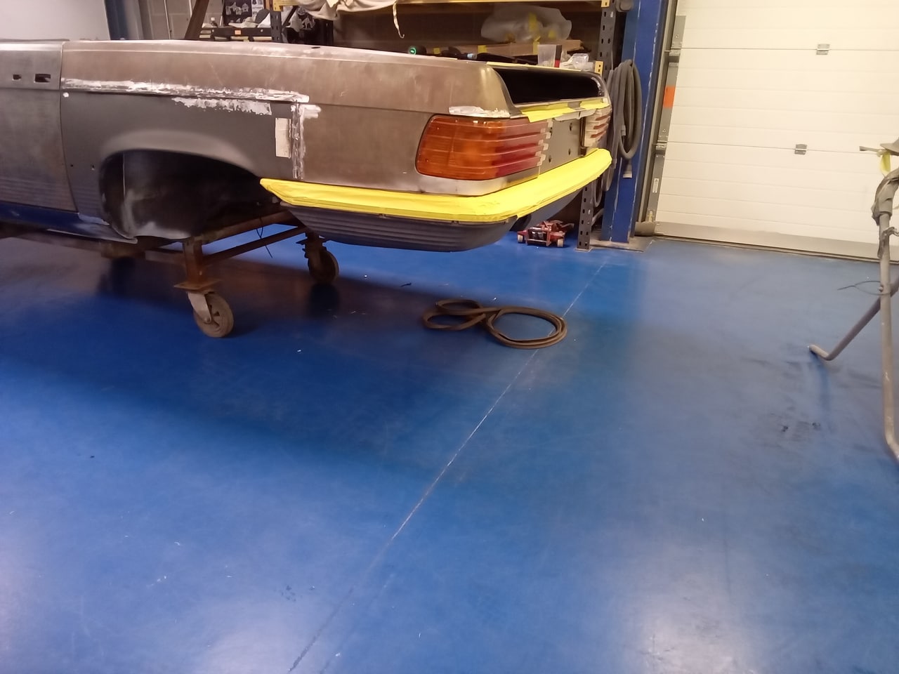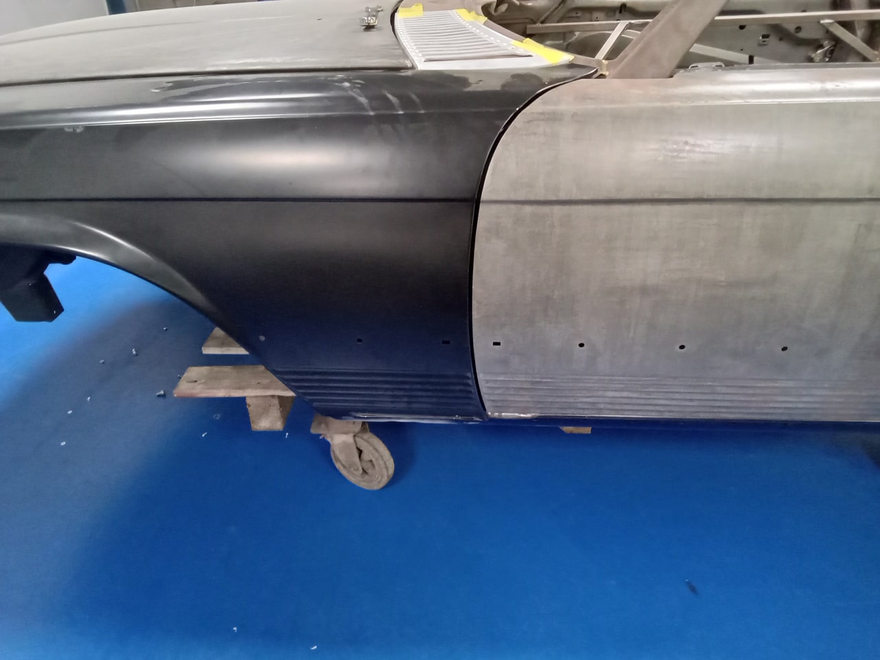 Chris, our paintshop manager, applied epoxy primer to various parts of our 1978 Mercedes 350SL in preparation for panel levelling here at the Bridge Classic Cars restoration workshops. He began fitting up the car to check the panel gaps and carry out the necessary adjustments, including the first fitting of the bumpers and some of the chrome work. Attention was then given to refining the bumper fitment to ensure everything aligned correctly.