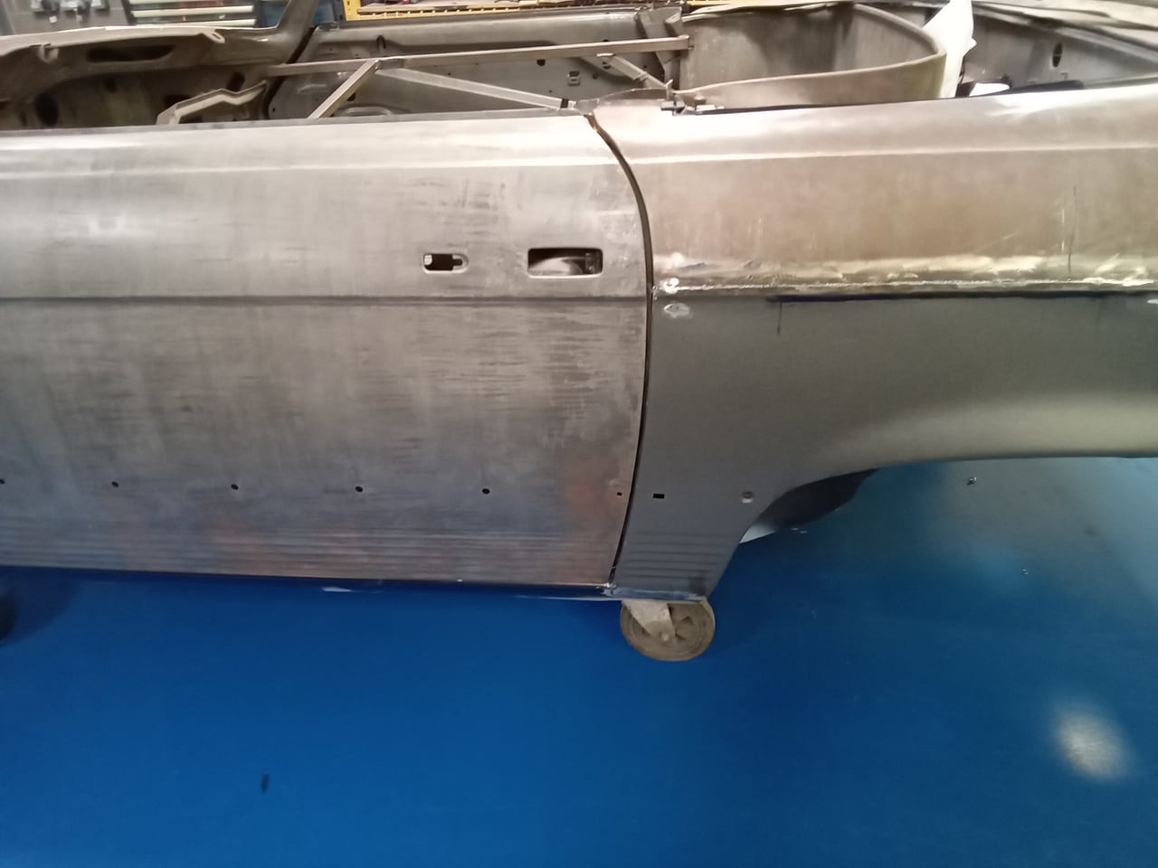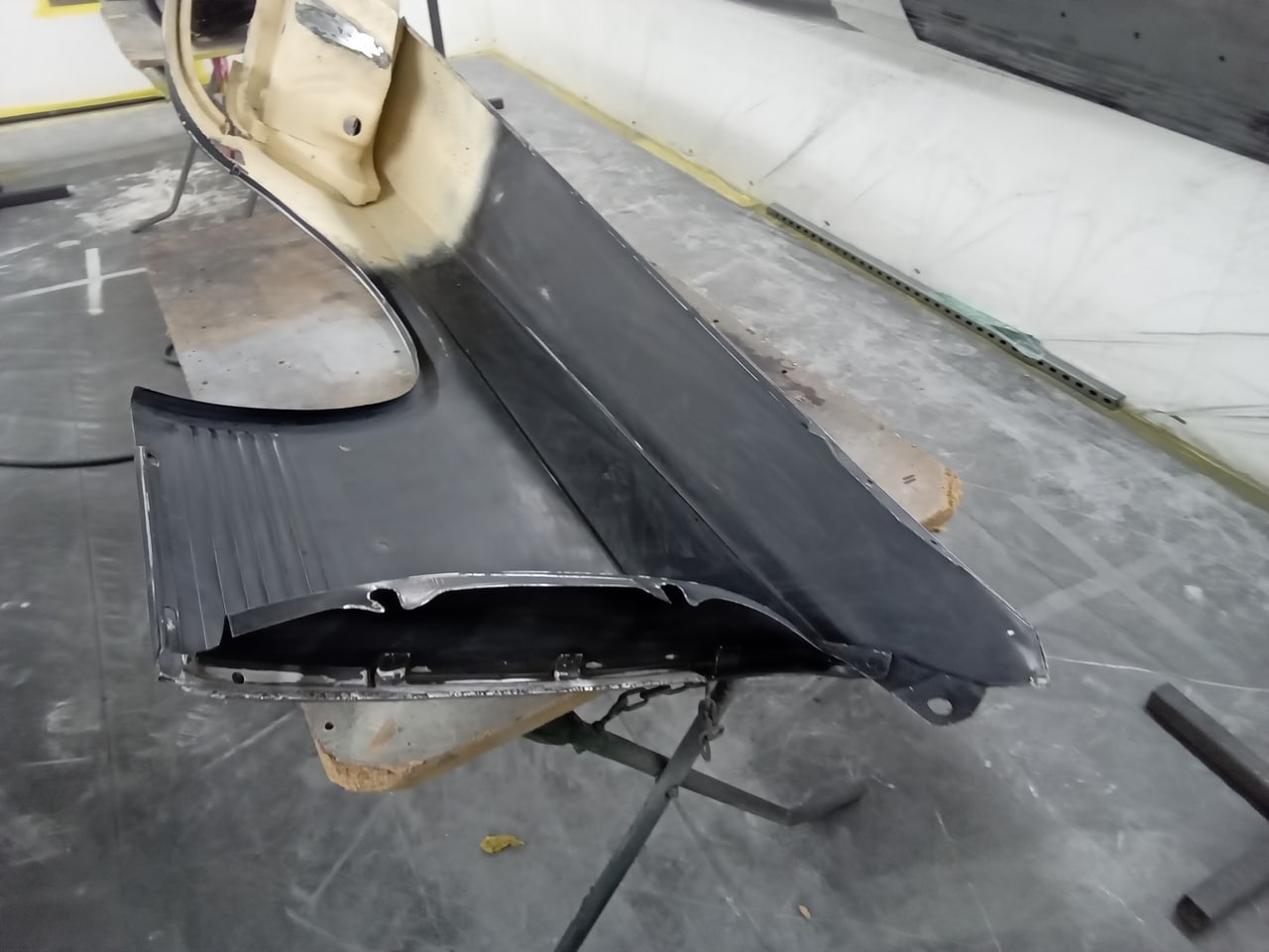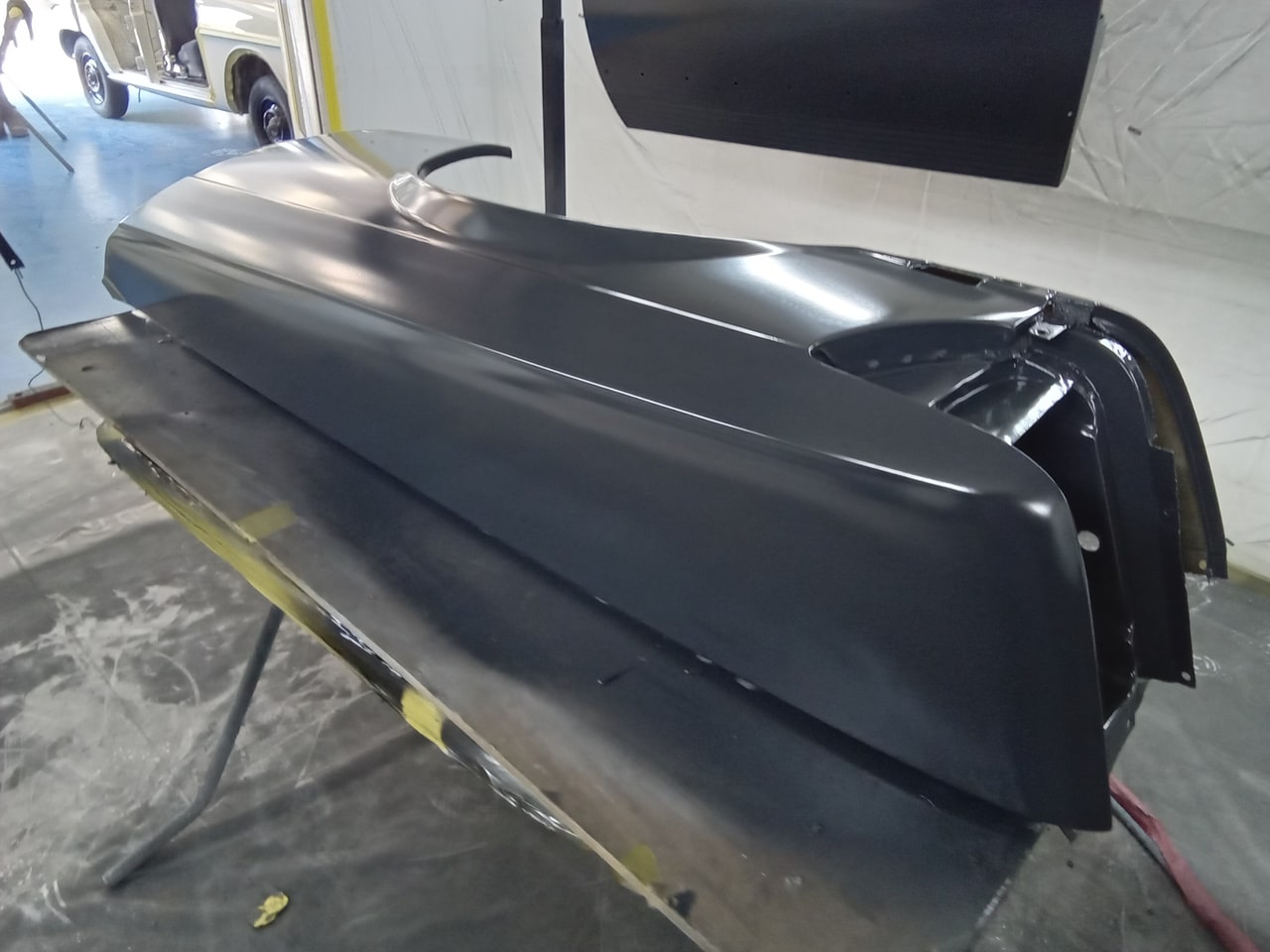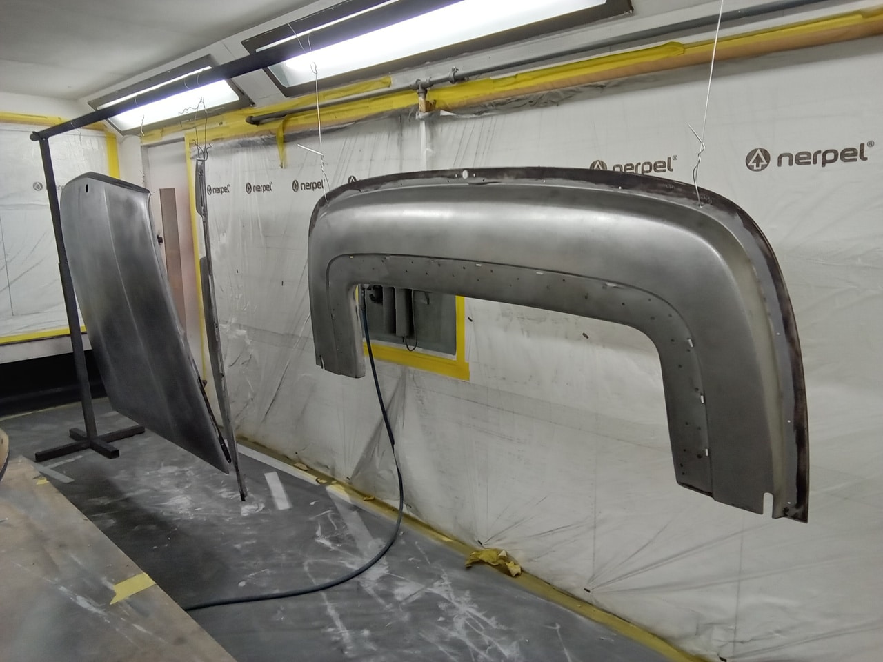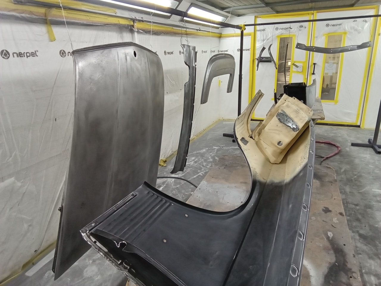 Chris, our paintshop manager, applied epoxy primer to various parts of our 1978 Mercedes 350SL in preparation for panel levelling here at the Bridge Classic Cars restoration workshops. He began fitting up the car to check the panel gaps and carry out the necessary adjustments, including the first fitting of the bumpers and some of the chrome work. Attention was then given to refining the bumper fitment to ensure everything aligned correctly.