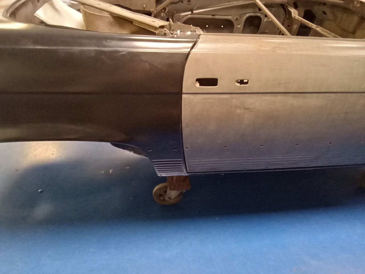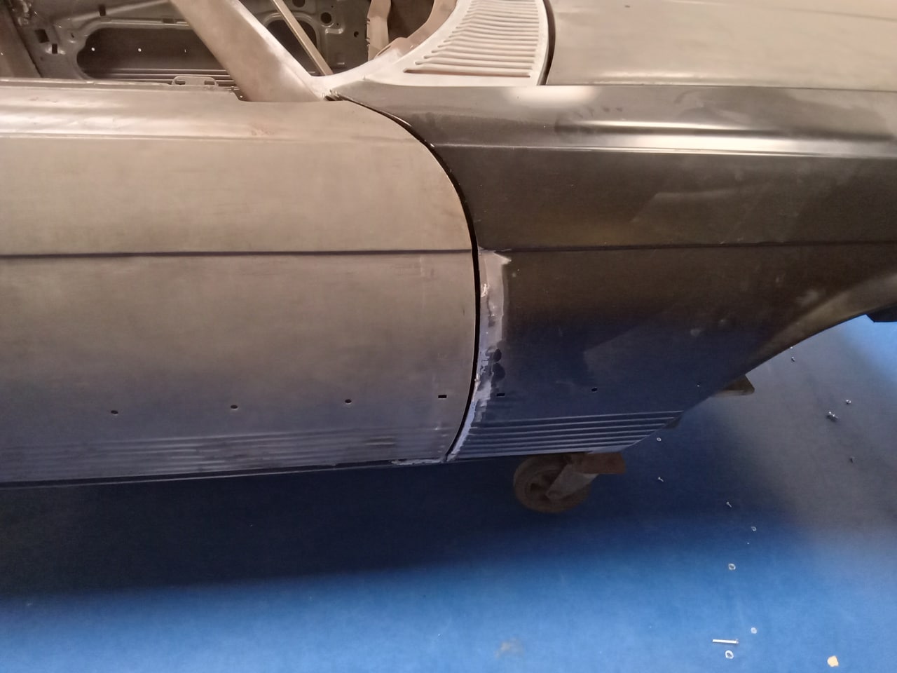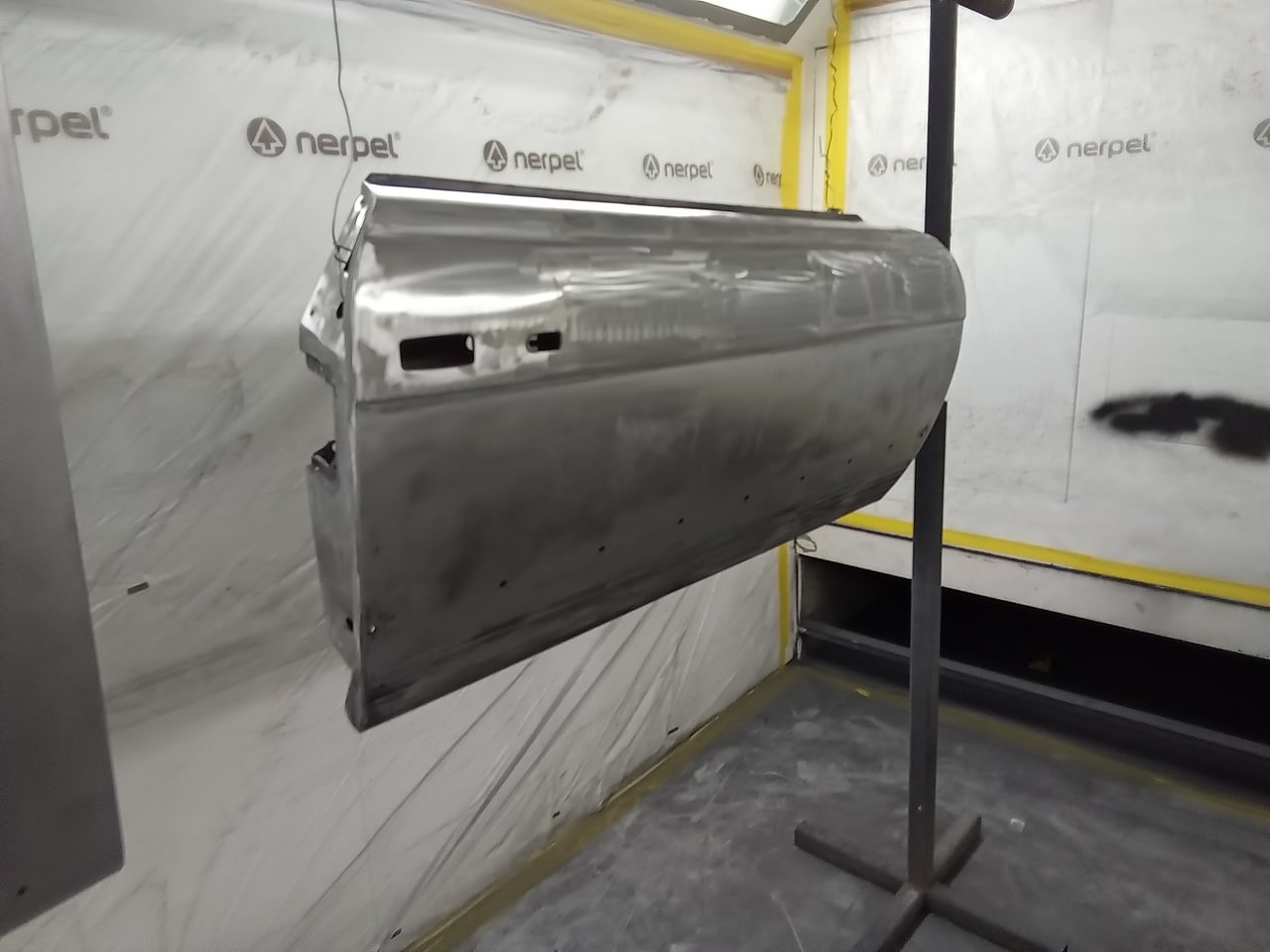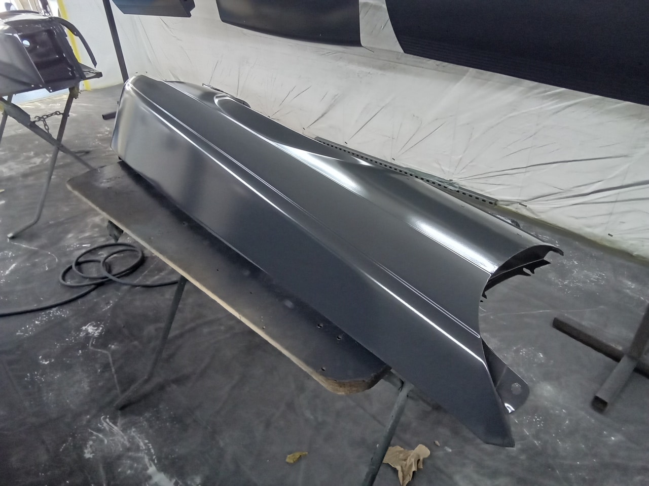 Chris, our paintshop manager, applied epoxy primer to various parts of our 1978 Mercedes 350SL in preparation for panel levelling here at the Bridge Classic Cars restoration workshops. He began fitting up the car to check the panel gaps and carry out the necessary adjustments, including the first fitting of the bumpers and some of the chrome work. Attention was then given to refining the bumper fitment to ensure everything aligned correctly.