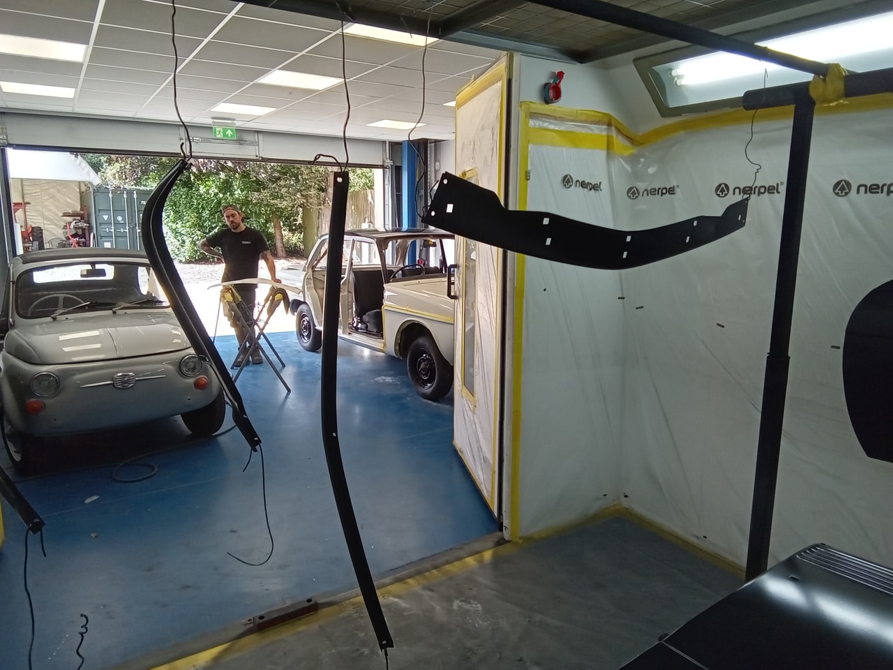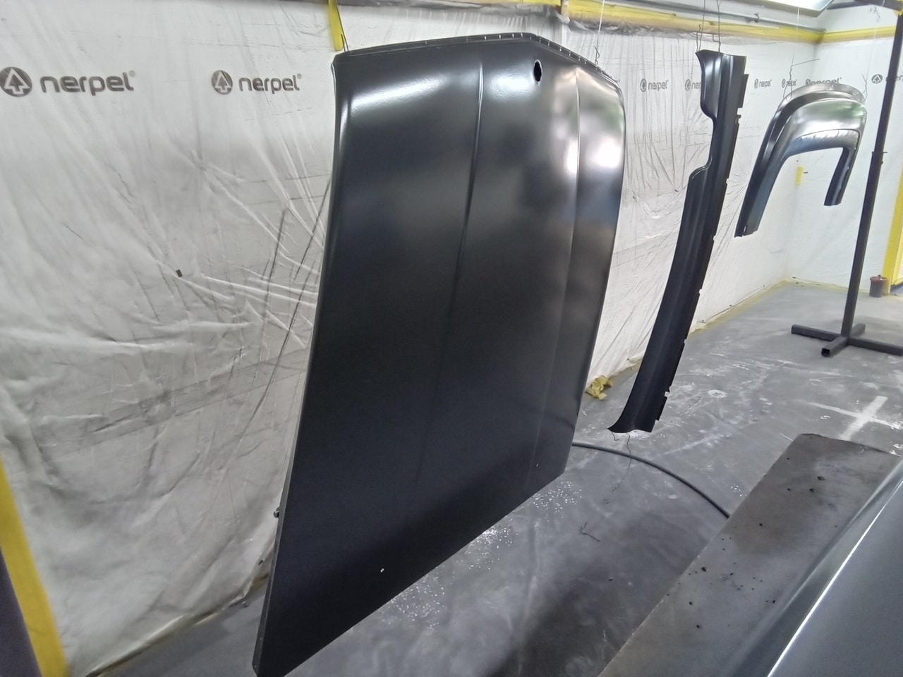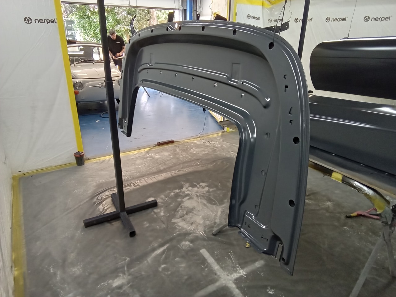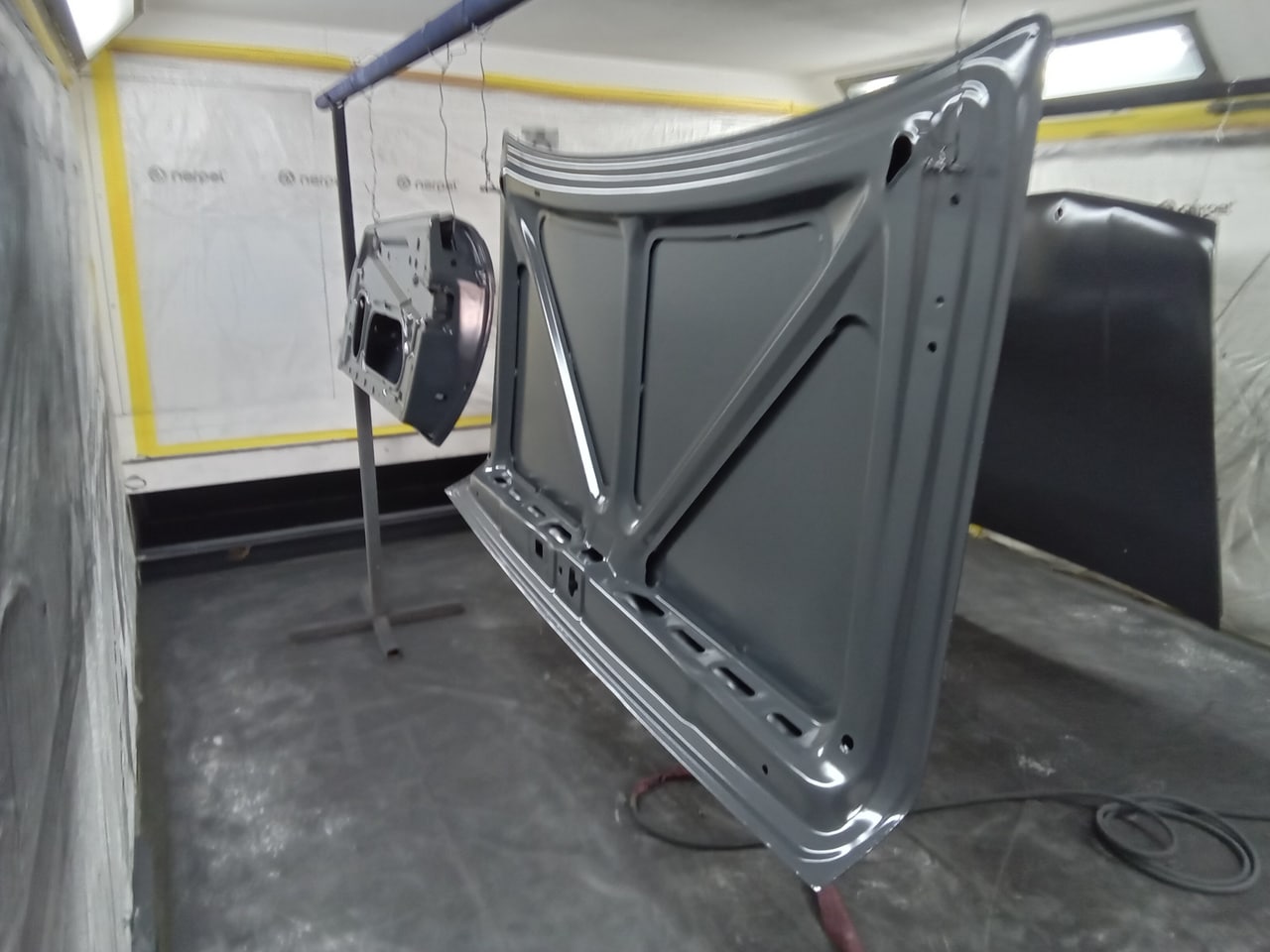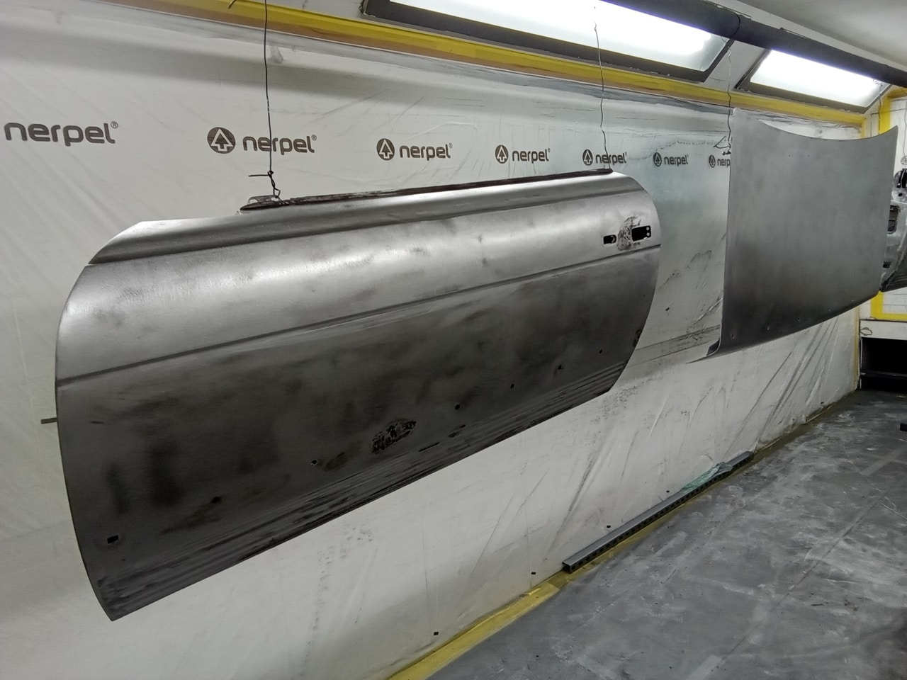 Chris, our paintshop manager, applied epoxy primer to various parts of our 1978 Mercedes 350SL in preparation for panel levelling here at the Bridge Classic Cars restoration workshops. He began fitting up the car to check the panel gaps and carry out the necessary adjustments, including the first fitting of the bumpers and some of the chrome work. Attention was then given to refining the bumper fitment to ensure everything aligned correctly.