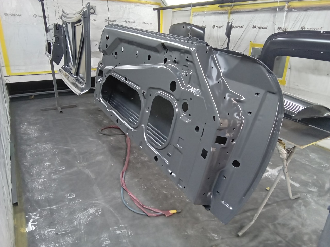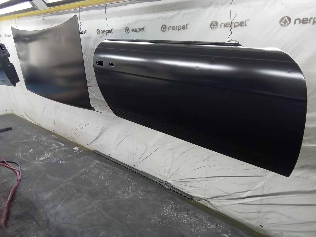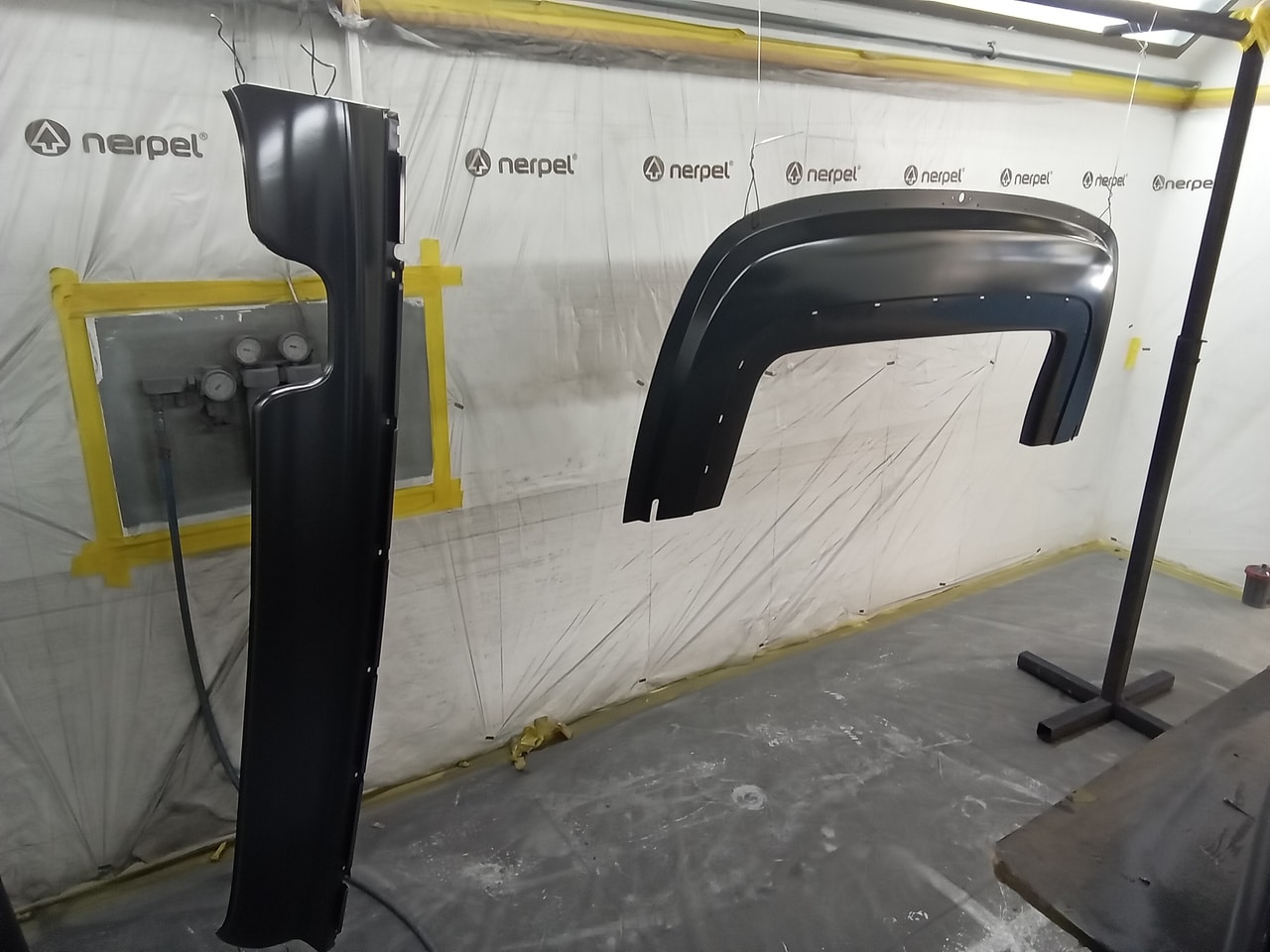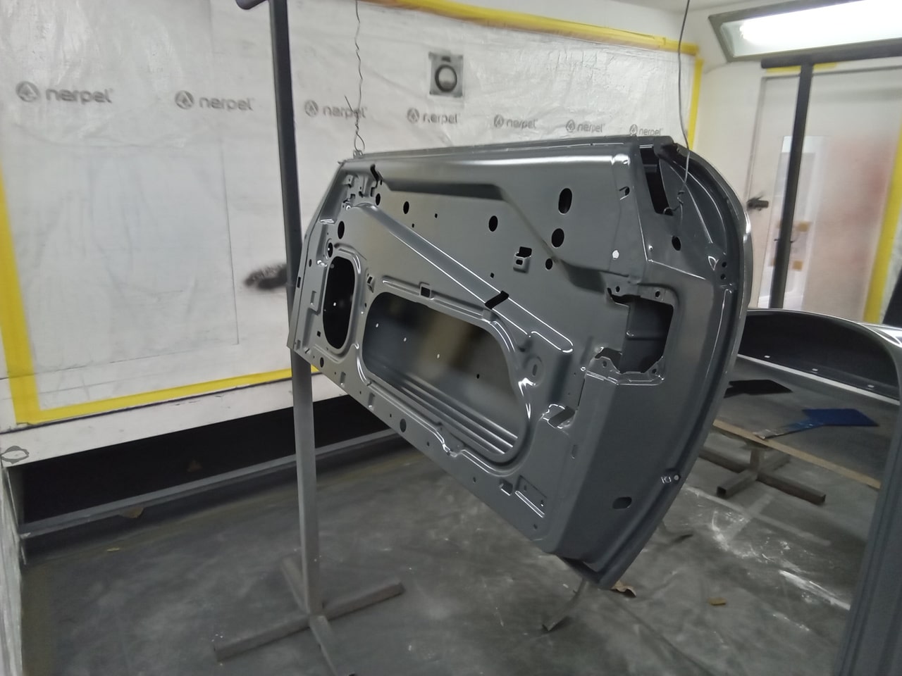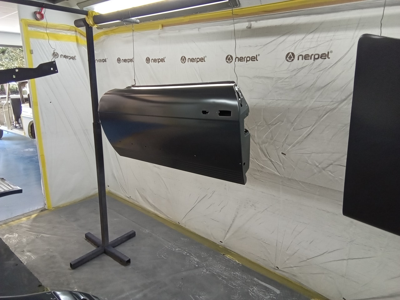 Chris, our paintshop manager, applied epoxy primer to various parts of our 1978 Mercedes 350SL in preparation for panel levelling here at the Bridge Classic Cars restoration workshops. He began fitting up the car to check the panel gaps and carry out the necessary adjustments, including the first fitting of the bumpers and some of the chrome work. Attention was then given to refining the bumper fitment to ensure everything aligned correctly.