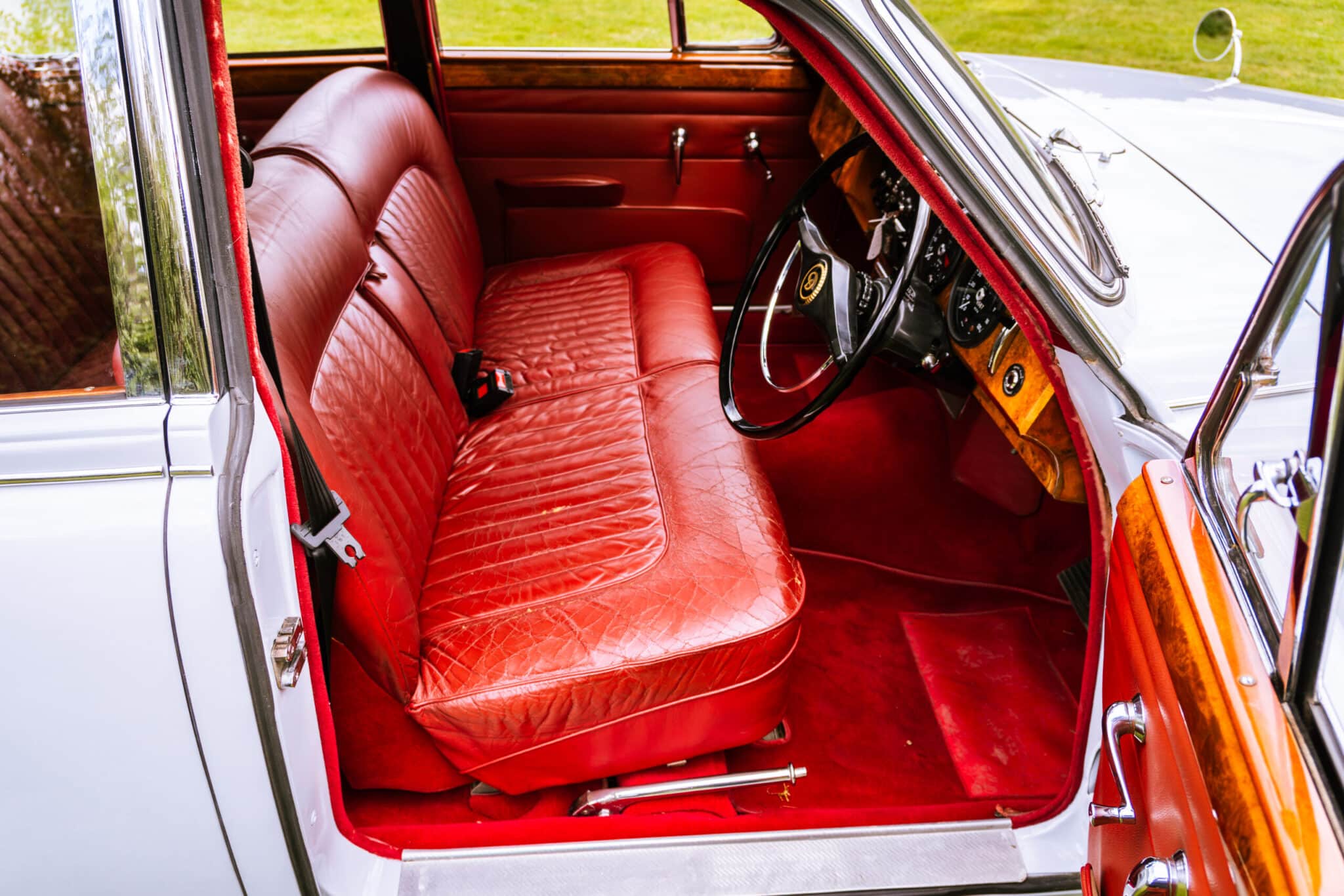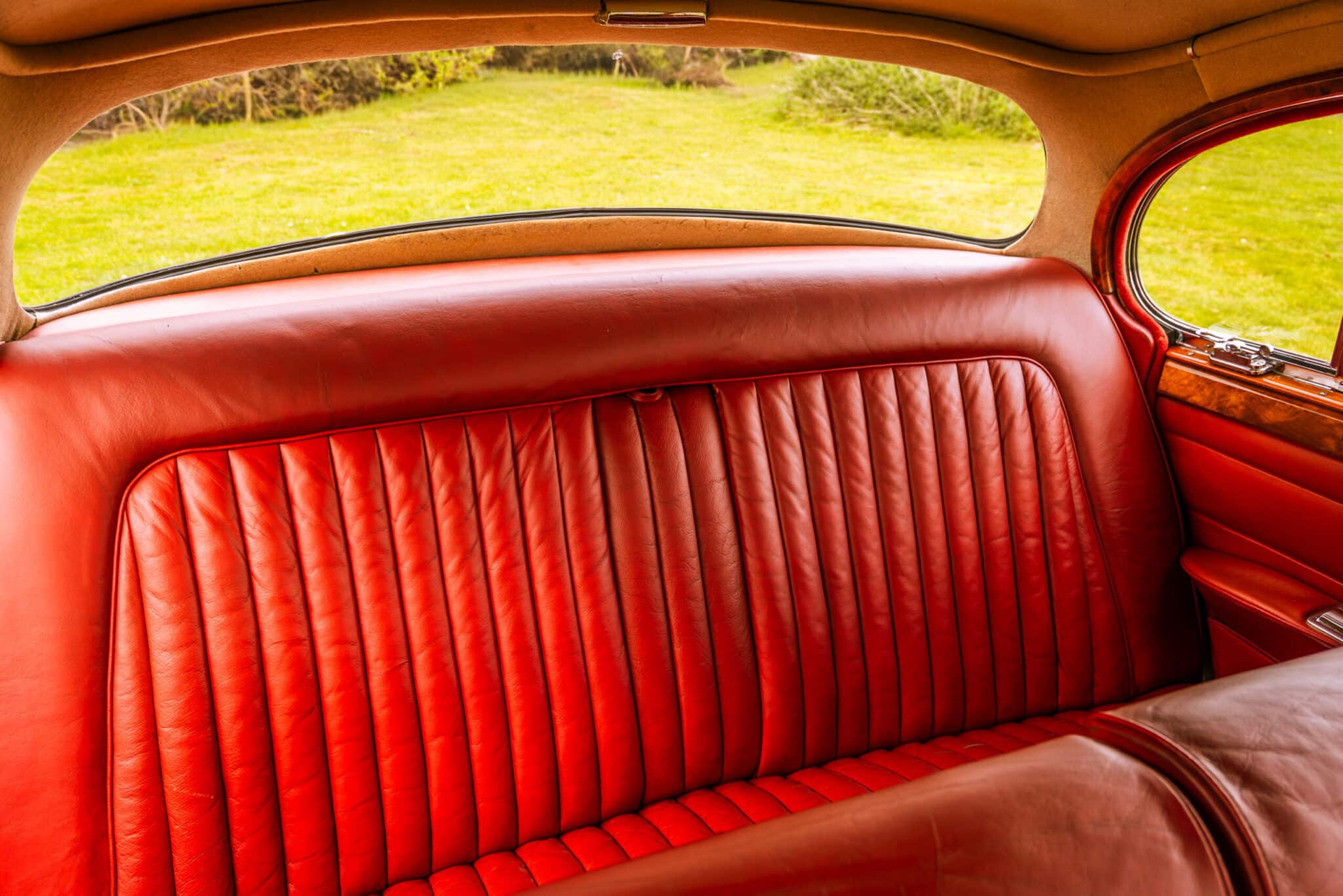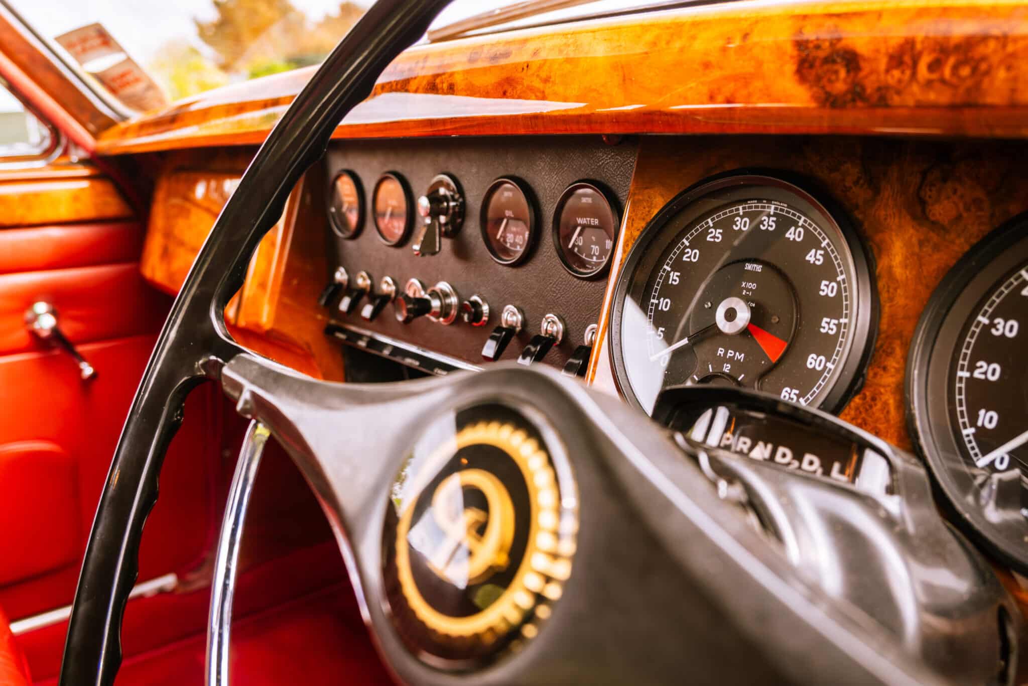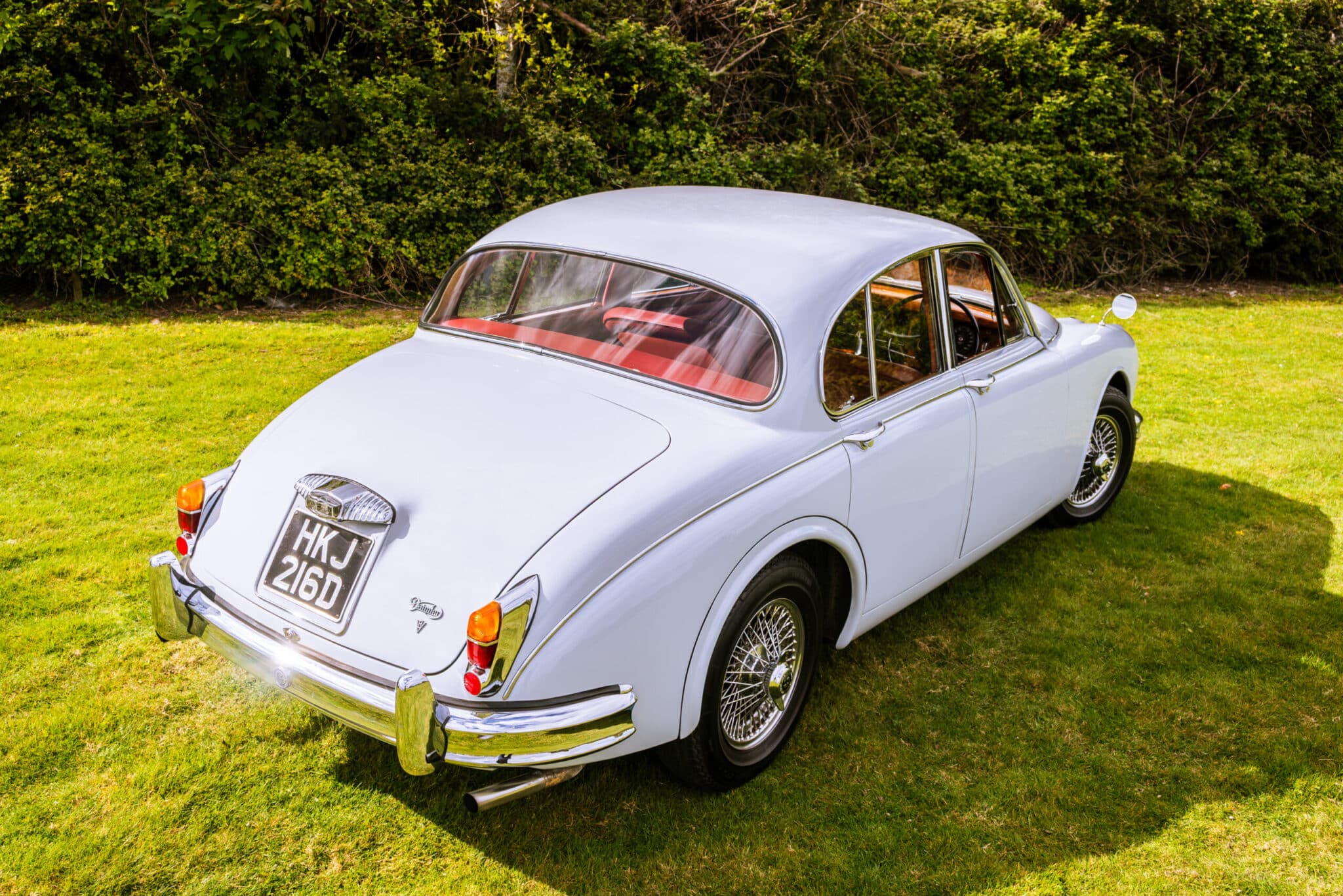 Our 1966 Daimler V8 250 is finished in an interesting light blue/grey with a red leather interior.