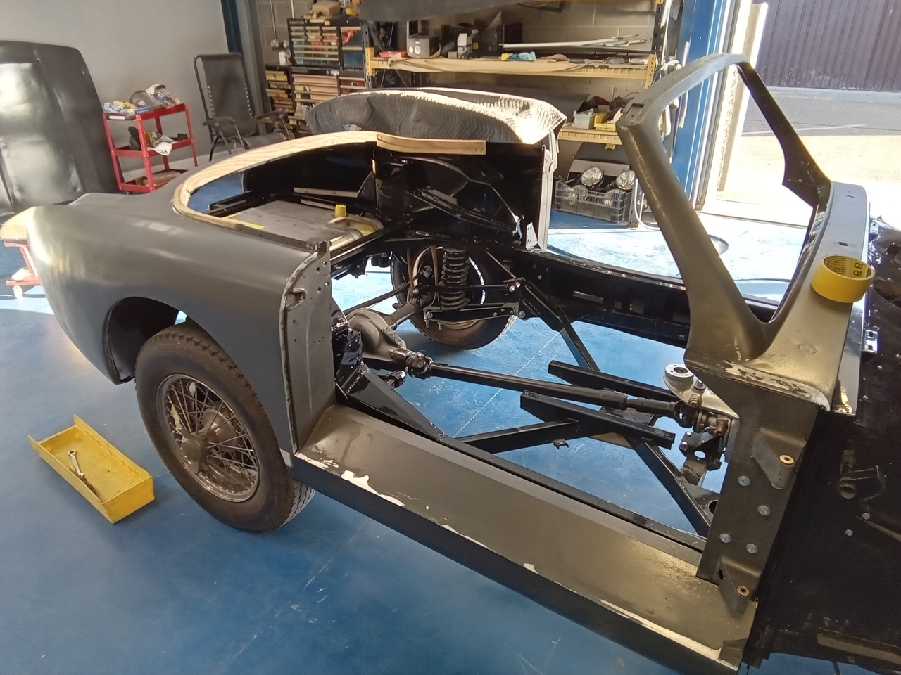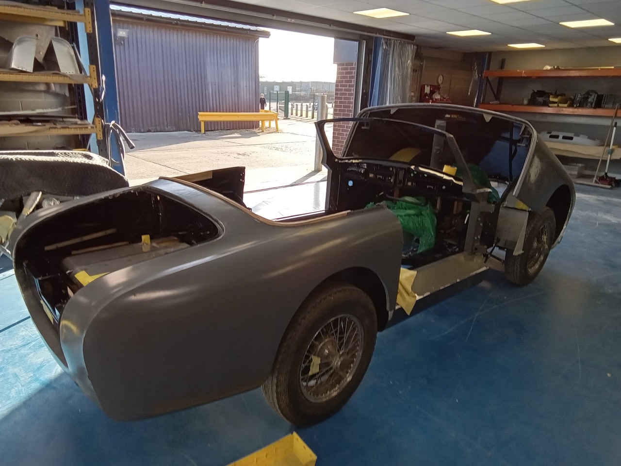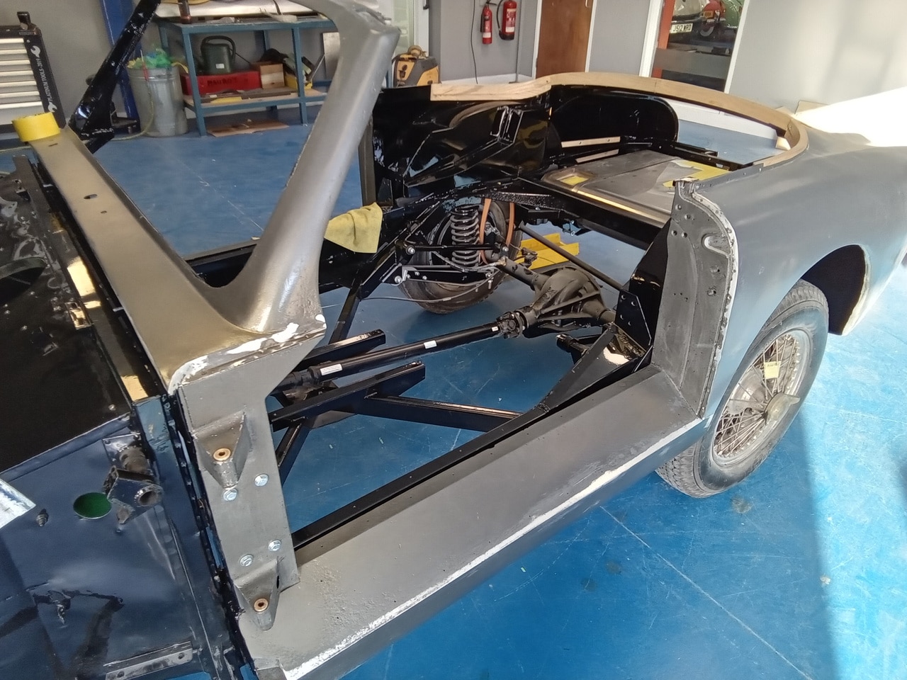 The 1955 Aston Martin DB2/4 Drophead Coupe has been in the bodyshop at our Suffolk HQ for Bridge Classic Cars technician Mauro so get the project onto the next phase of its rebuild. Recently the bodyshell of the classic Aston Martin, which had its interior paint in super durable black has been put back onto its freshly restored chassis.