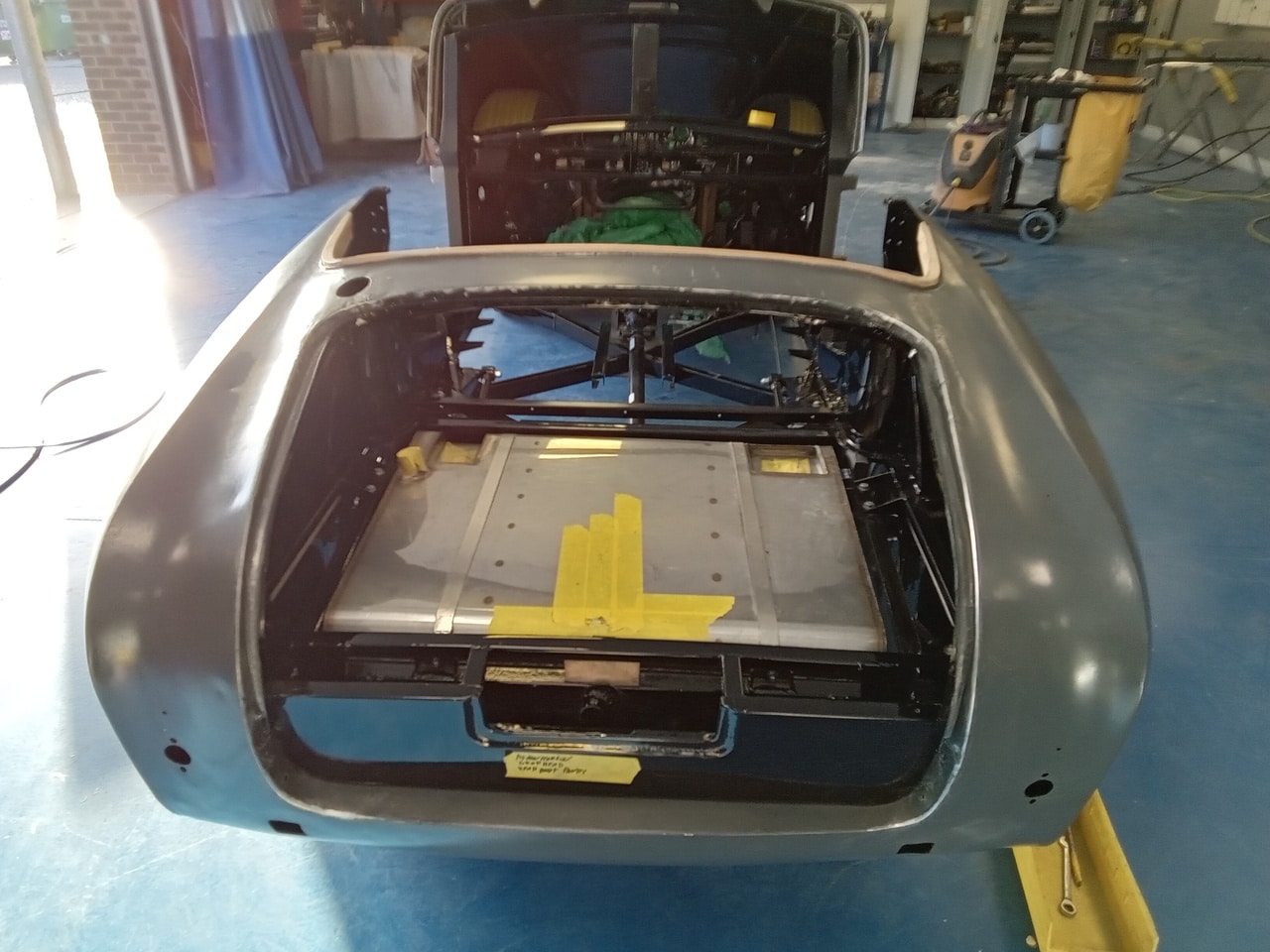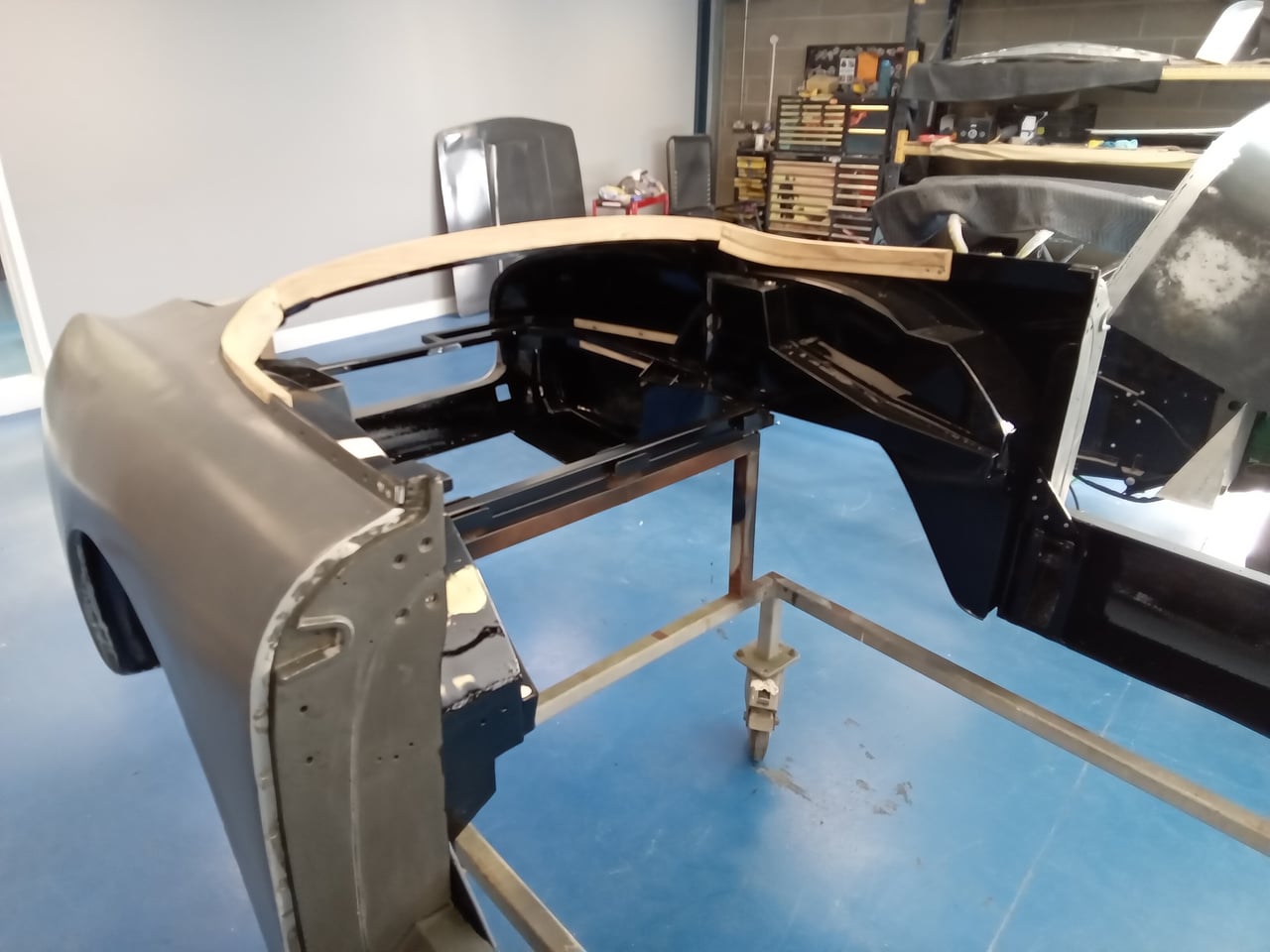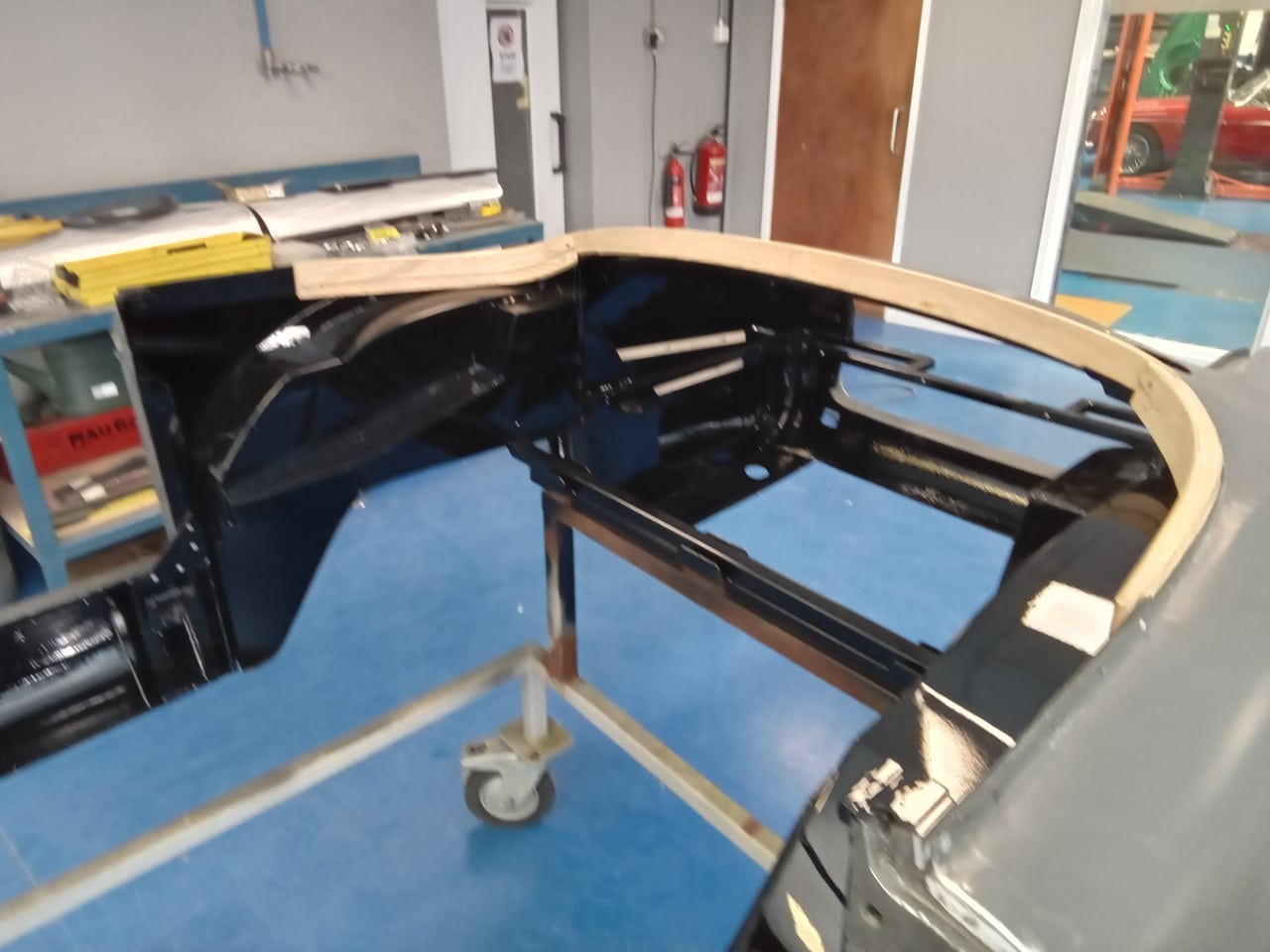 The 1955 Aston Martin DB2/4 Drophead Coupe has been in the bodyshop at our Suffolk HQ for Bridge Classic Cars technician Mauro so get the project onto the next phase of its rebuild. Recently the bodyshell of the classic Aston Martin, which had its interior paint in super durable black has been put back onto its freshly restored chassis.