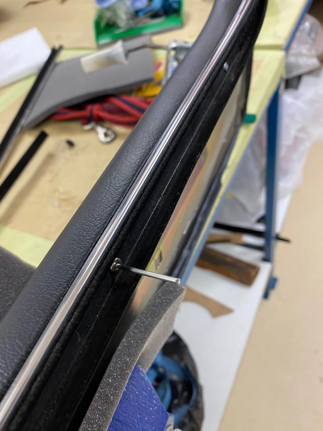 Kath has been working on getting the rear panels ready and into the car. The weatherstrip has been riveted to the bottom of the window opening along with the chrome strips that make up the ribbing for the panel.