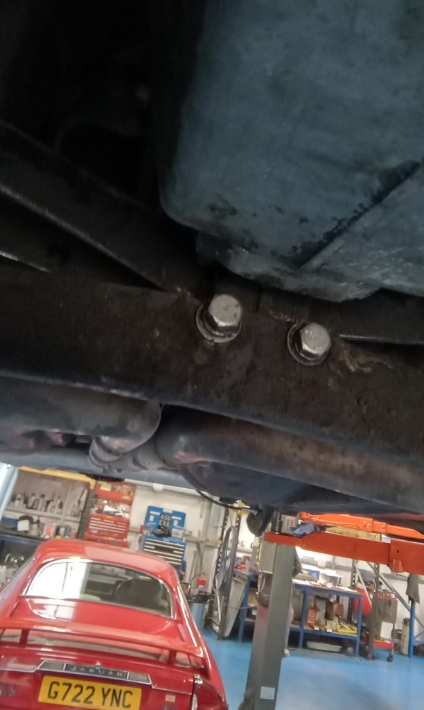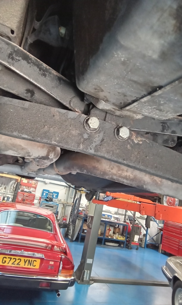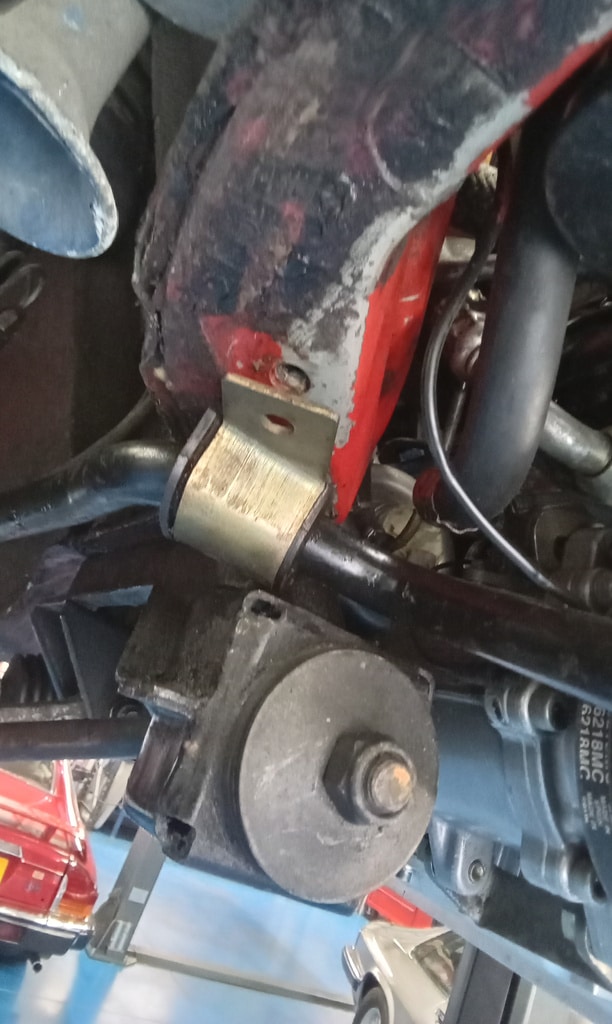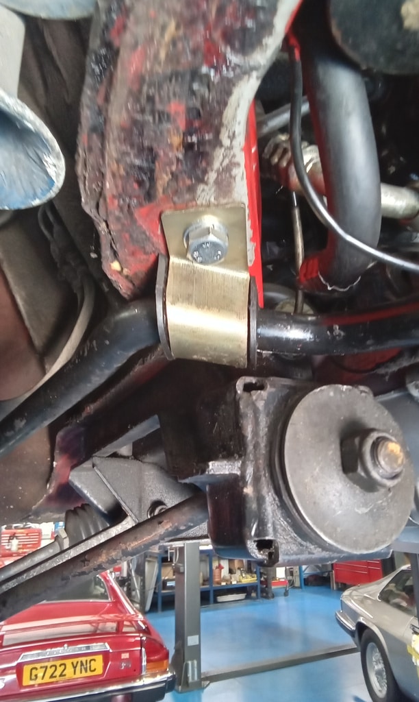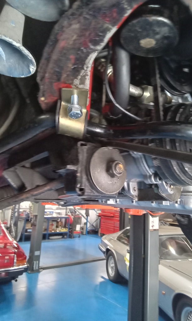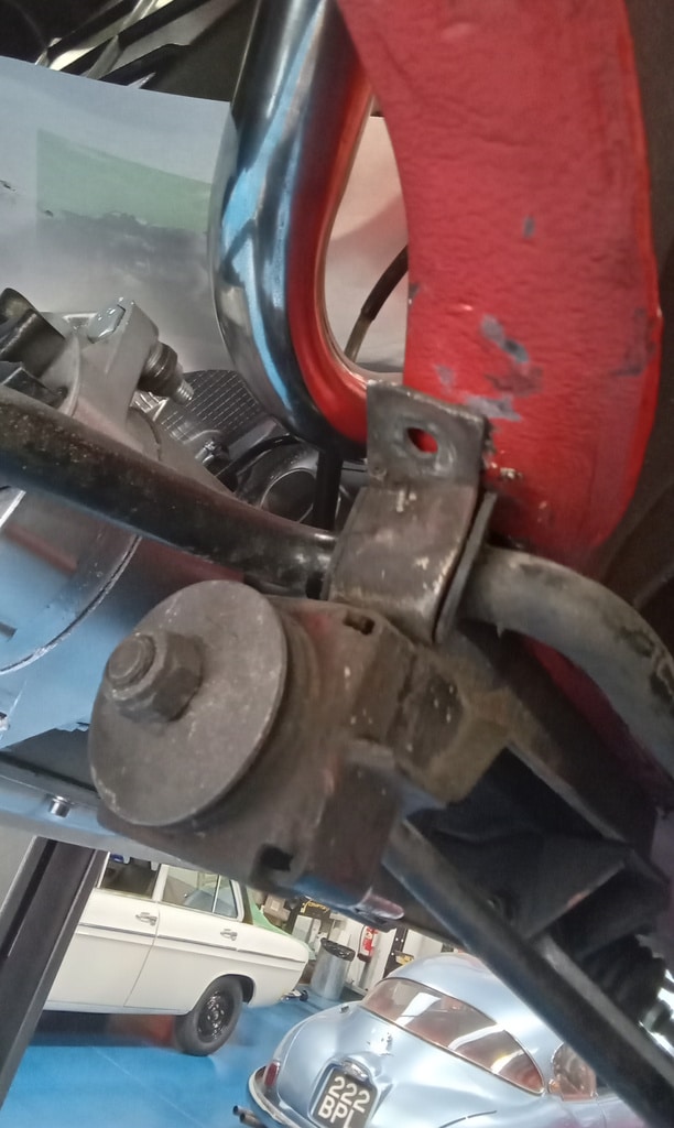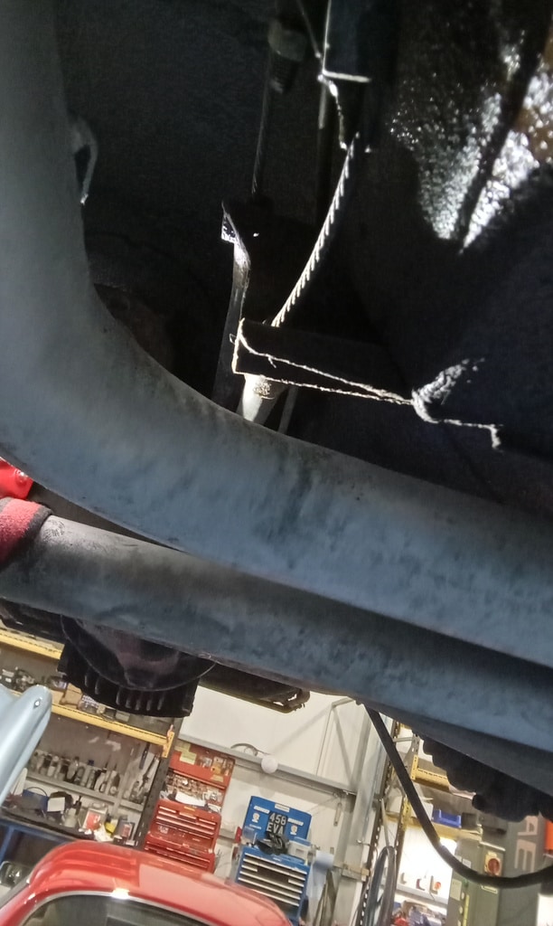 ”Remove old handbrake cable and compare with new. Slightly different butshould be OK. Secure to backplate and rear arms. Route through rod to lever and loosely bolt up. Clean handbrake shoes and springs. Fit handbrake pivot and then shoes. Secure shoes and fit adjuster. Clean discs and fit. Adjust hand brake shoes. Repeat for other side and then test handbrake. Readjust via cable to set at 3 to 4 clicks. Waiting for calipers to finish rear brakes. Apply sealer and fit both exhaust downpipes to manifolds. Find new hosts and secure. Fit new anti roll bar clamp bracket to offside front. Get into position and bolt up tight. Noticed nearside captive nut missing from chassis so will have to be sorted.”