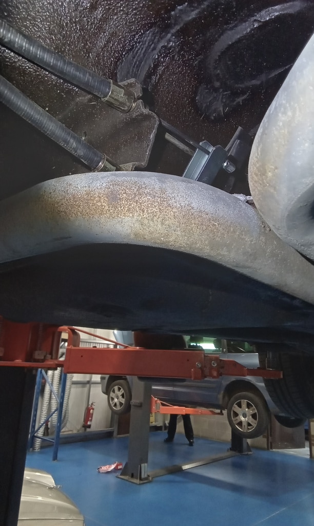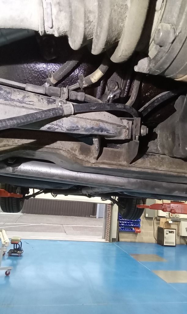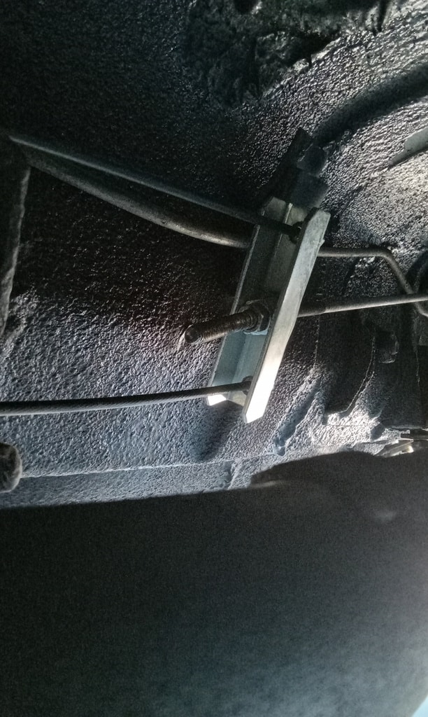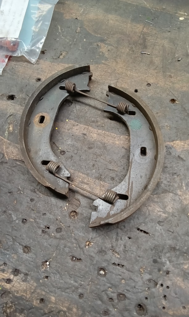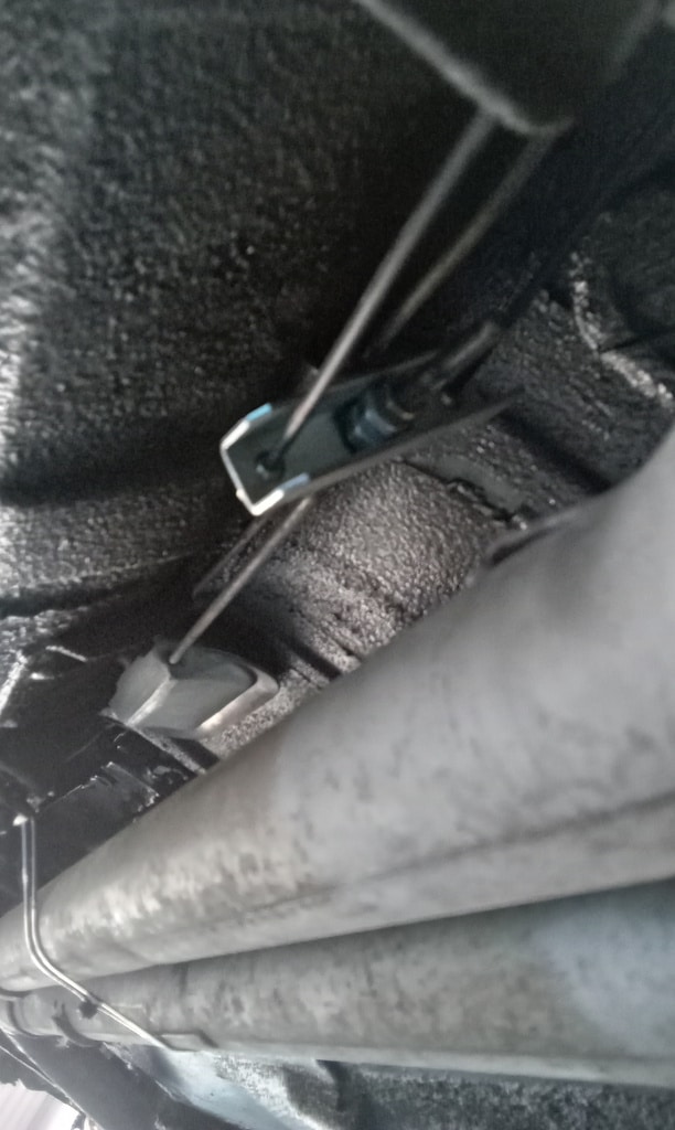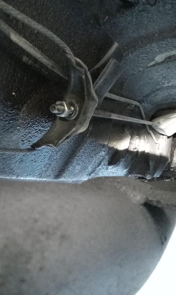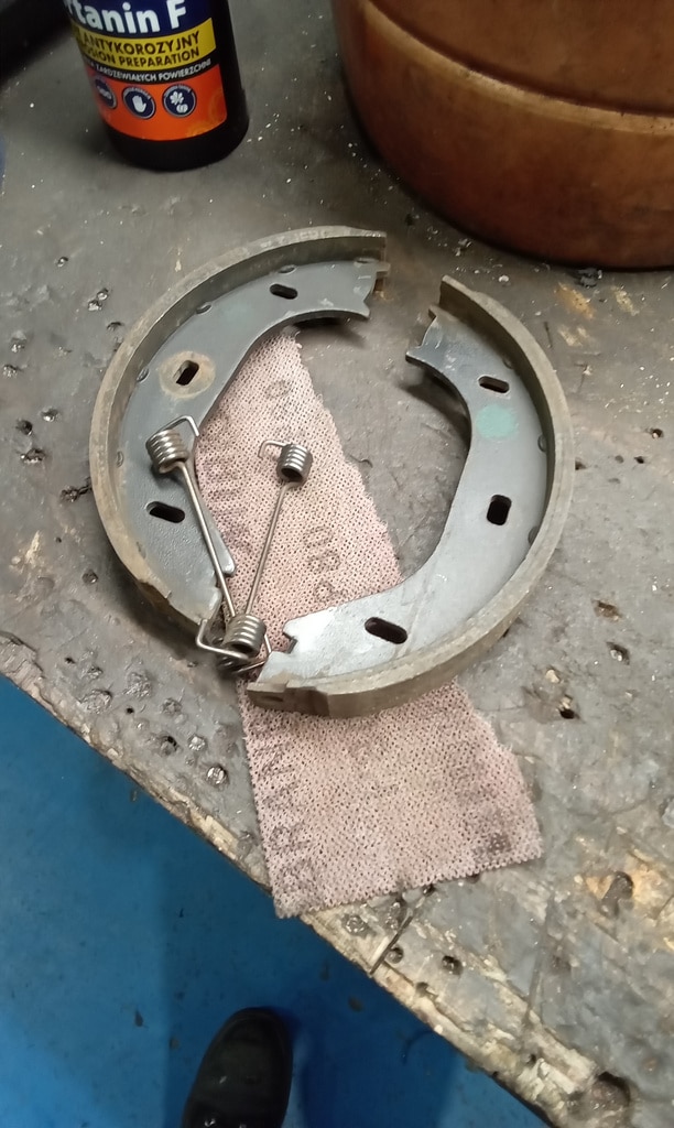 ”Remove old handbrake cable and compare with new. Slightly different butshould be OK. Secure to backplate and rear arms. Route through rod to lever and loosely bolt up. Clean handbrake shoes and springs. Fit handbrake pivot and then shoes. Secure shoes and fit adjuster. Clean discs and fit. Adjust hand brake shoes. Repeat for other side and then test handbrake. Readjust via cable to set at 3 to 4 clicks. Waiting for calipers to finish rear brakes. Apply sealer and fit both exhaust downpipes to manifolds. Find new hosts and secure. Fit new anti roll bar clamp bracket to offside front. Get into position and bolt up tight. Noticed nearside captive nut missing from chassis so will have to be sorted.”