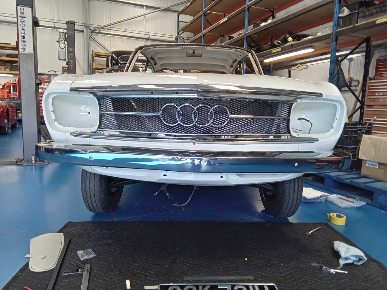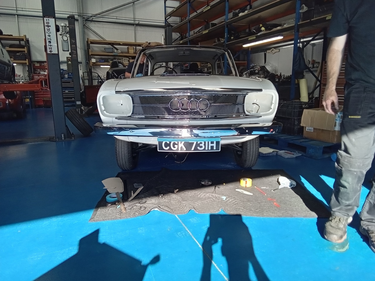 Our 1969 Audi seems all of a sudden be coming back to life! Not long ago, it was a freshly painted shell but now under the skillful hands of our restoration technician Dave the car is beginning to look reborn here at the Bridge Classic Cars HQ. Dave has been hard at work checking, rebuilding and regreasing the rear wheel bearings as well as fitting the new drums and wheels before moving onto the front of the car.