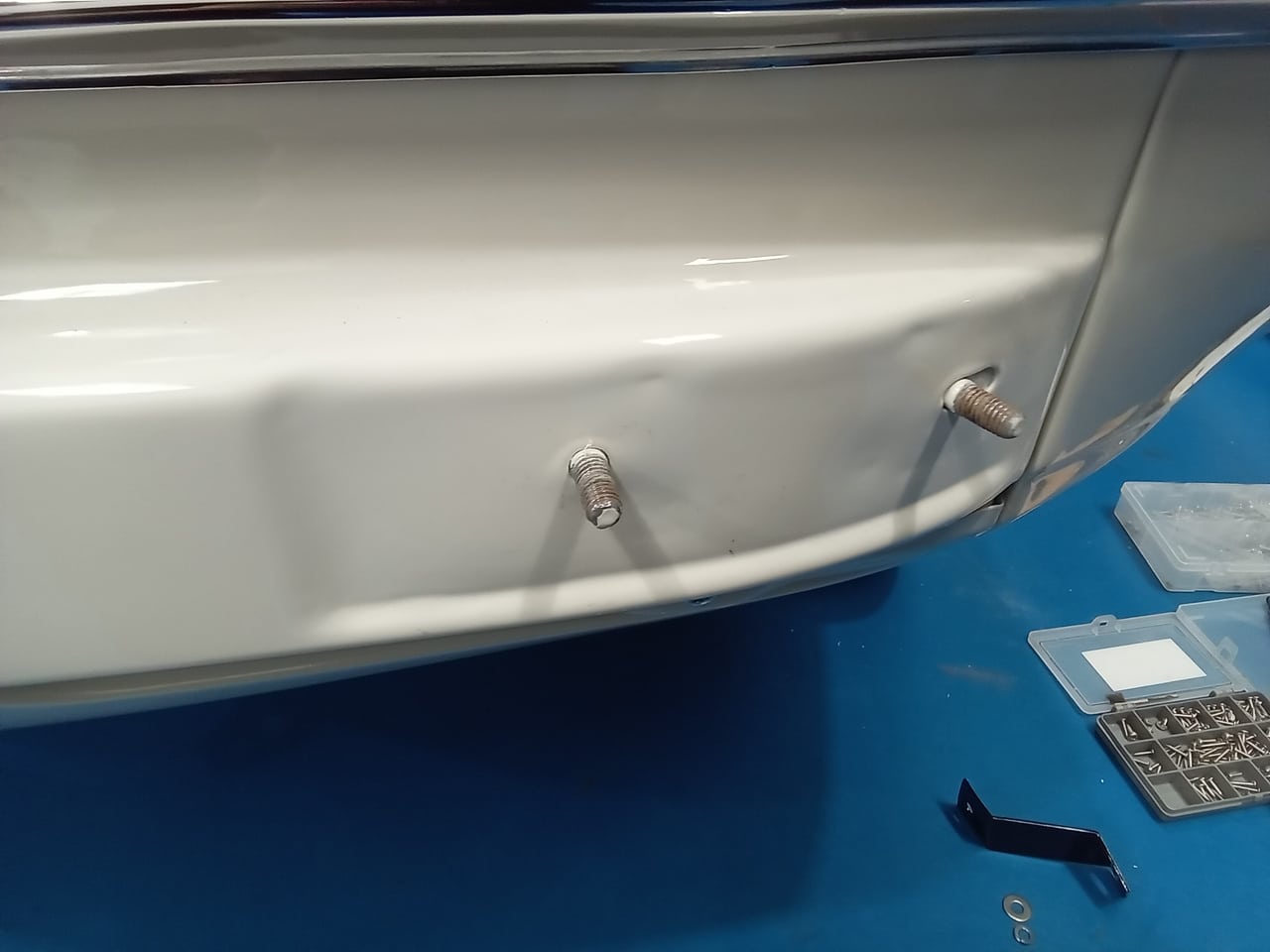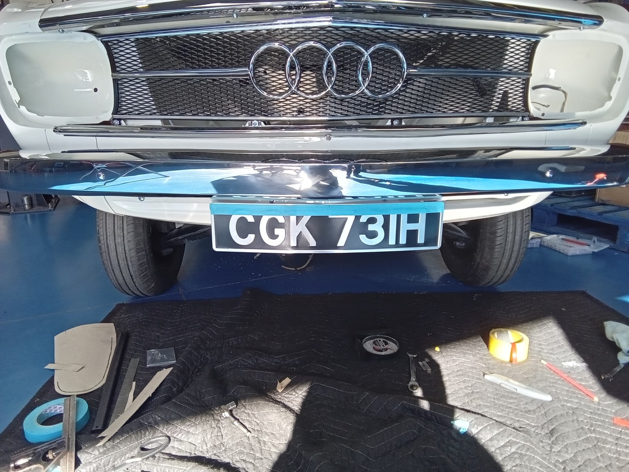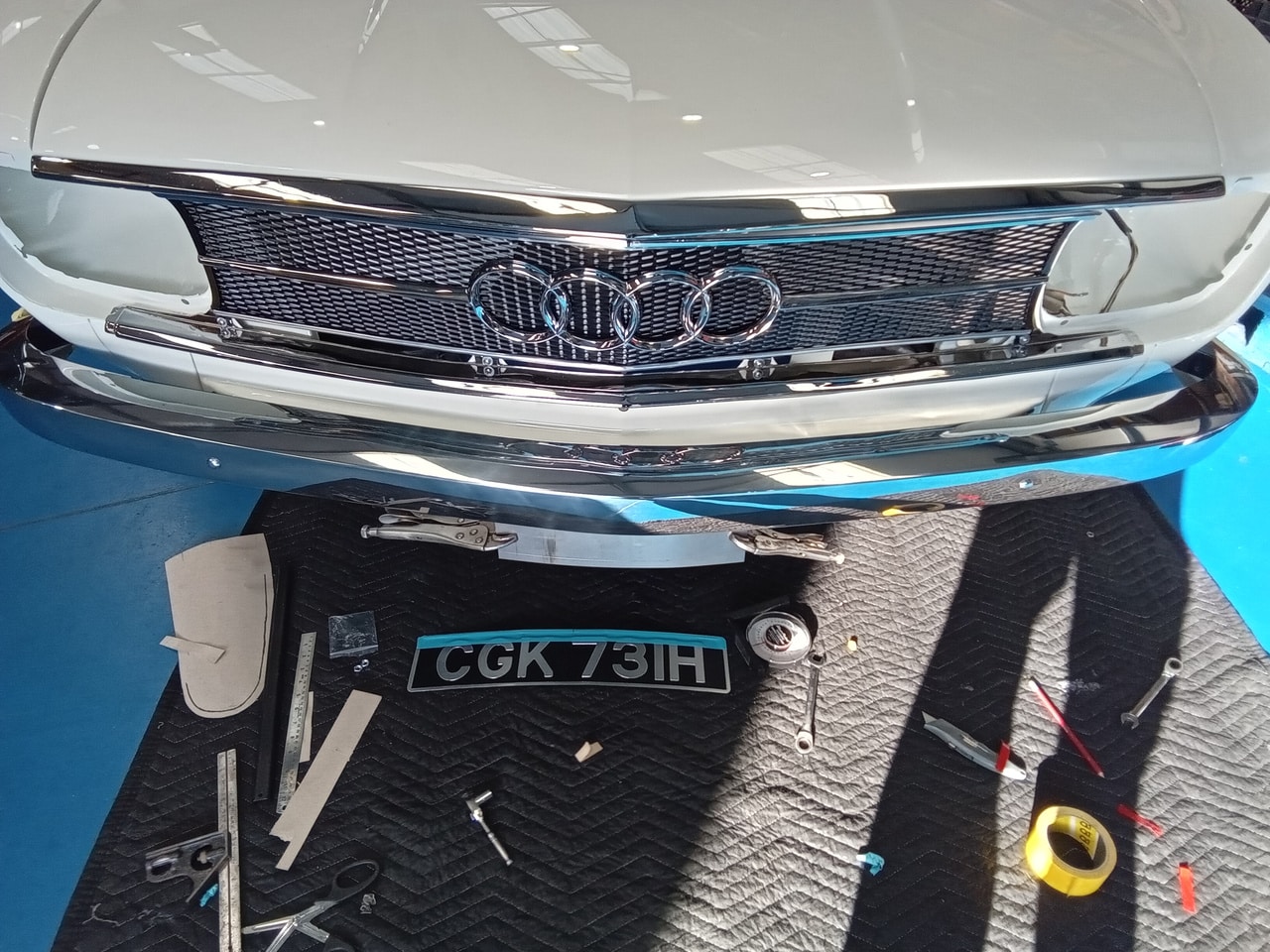 Dave has fitted up the signature 4-ring grille to the car before beginning to fit and readjust the bumper irons to give this piece the best fitment possible to then begin to make the number plate mounts.