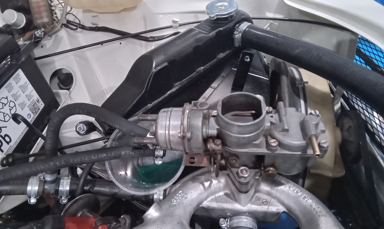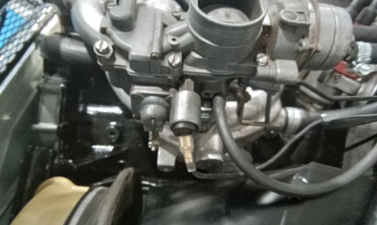 ‘Remove air box, remove fuel lines and water lines to carburettor, remove throttle linkage from carburettor, remove carburettor, with carb on the bench strip right down, clean out float bowl and clean off throttle butterflies, clean out jets and make sure they are not blocked, Finish cleaning jets and making sure they are not blocked, clean up outside body of carburettor, rebuild carburettor, refit to car, refit fuel and water lines to carb, top up water lost, refit air box.’