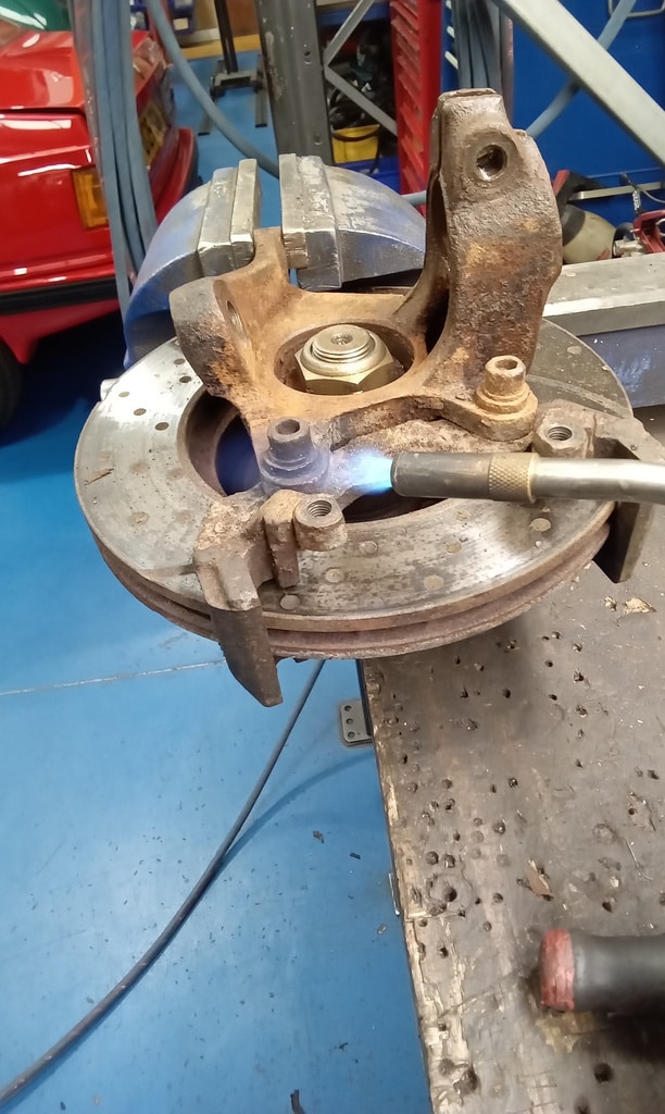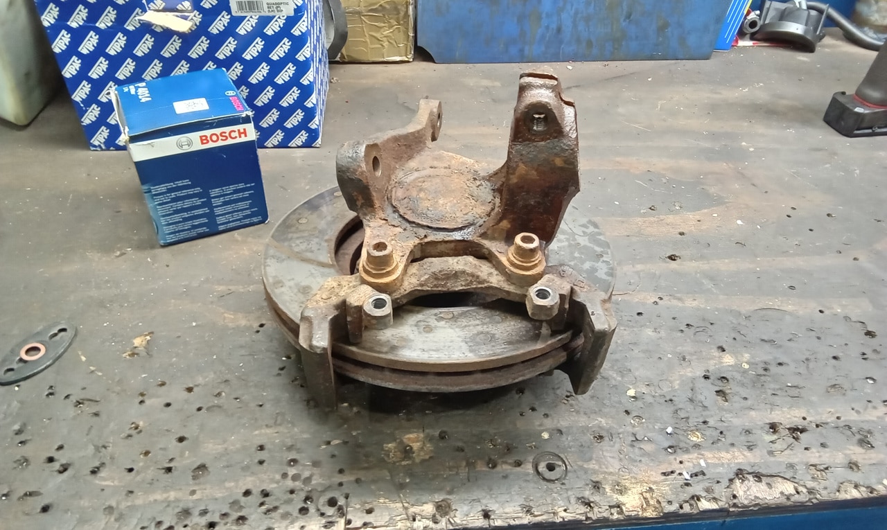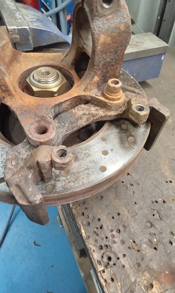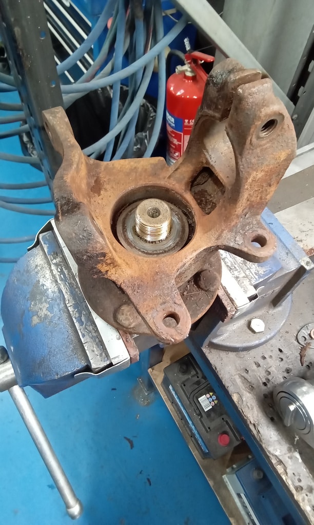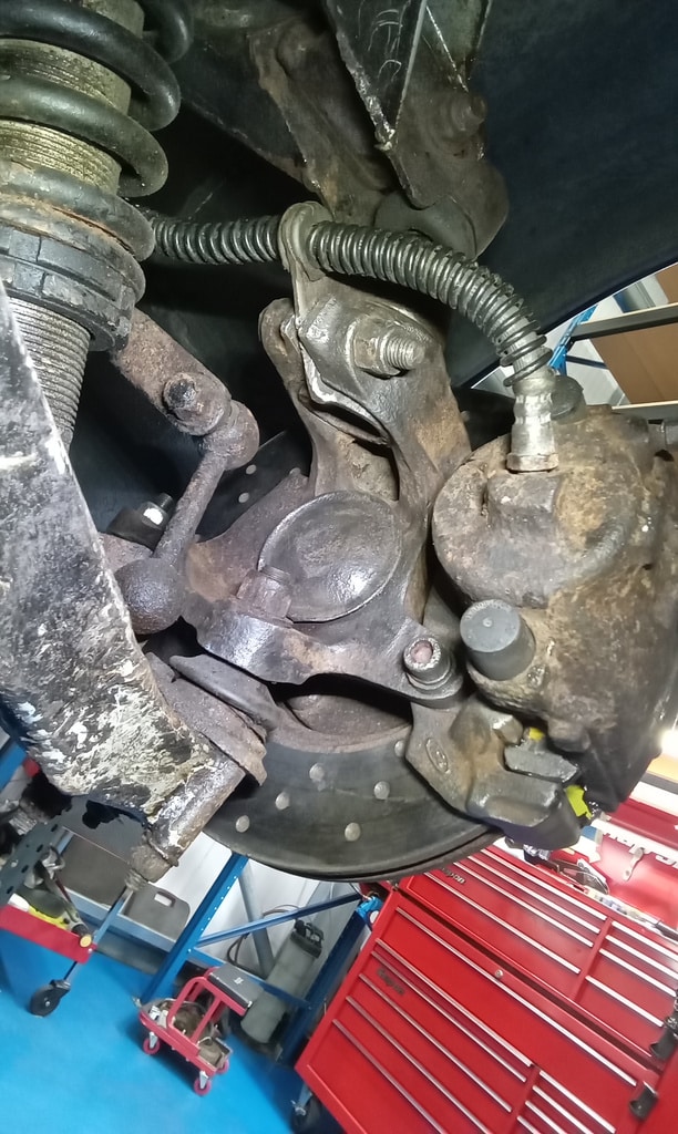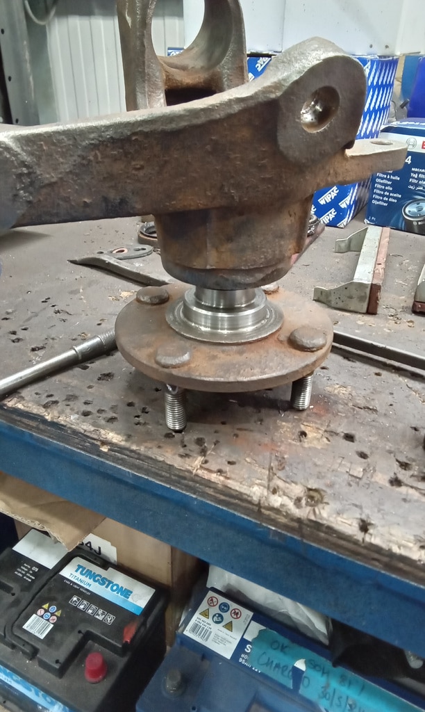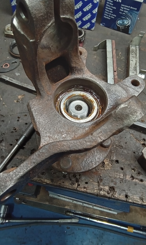 ”Drain oil amd filter and leave to drain while I replace wheel bearing. Strip offside front hub and remove complete with disc. Heat up carrier bolts and remove. Knock out old bearing races and clean hub. Press in new bearing races. Grease new bearings and fit. Press in hub flange and torque newnut to 350nm. Refit huband secure. Remove caliper sliders and rubbers. Remove rust from caliper and refit rubbers. Lube sliders and refit caliper. Refit wheel.”