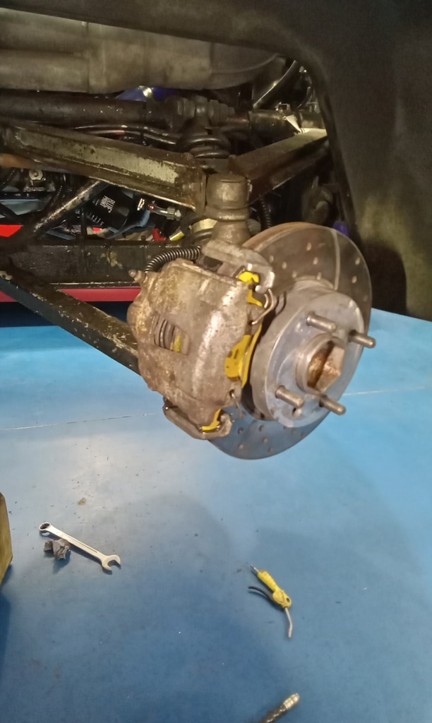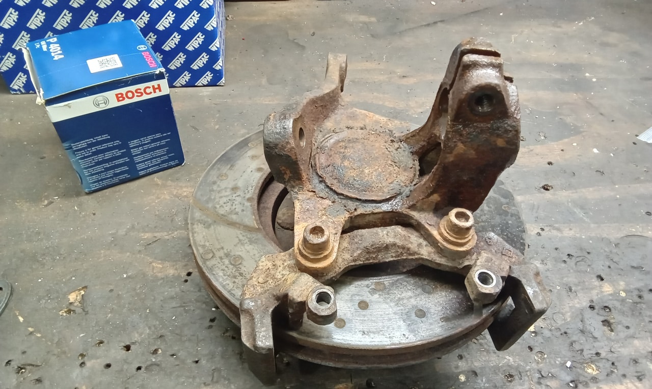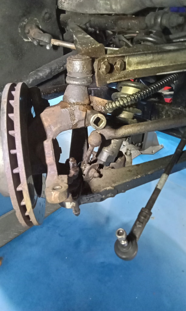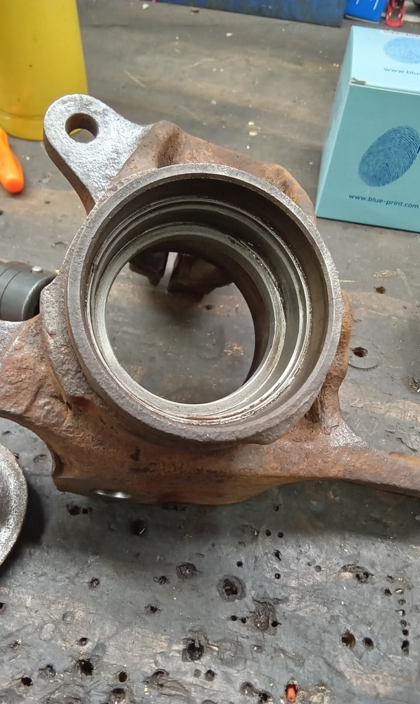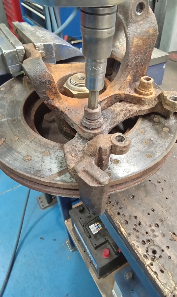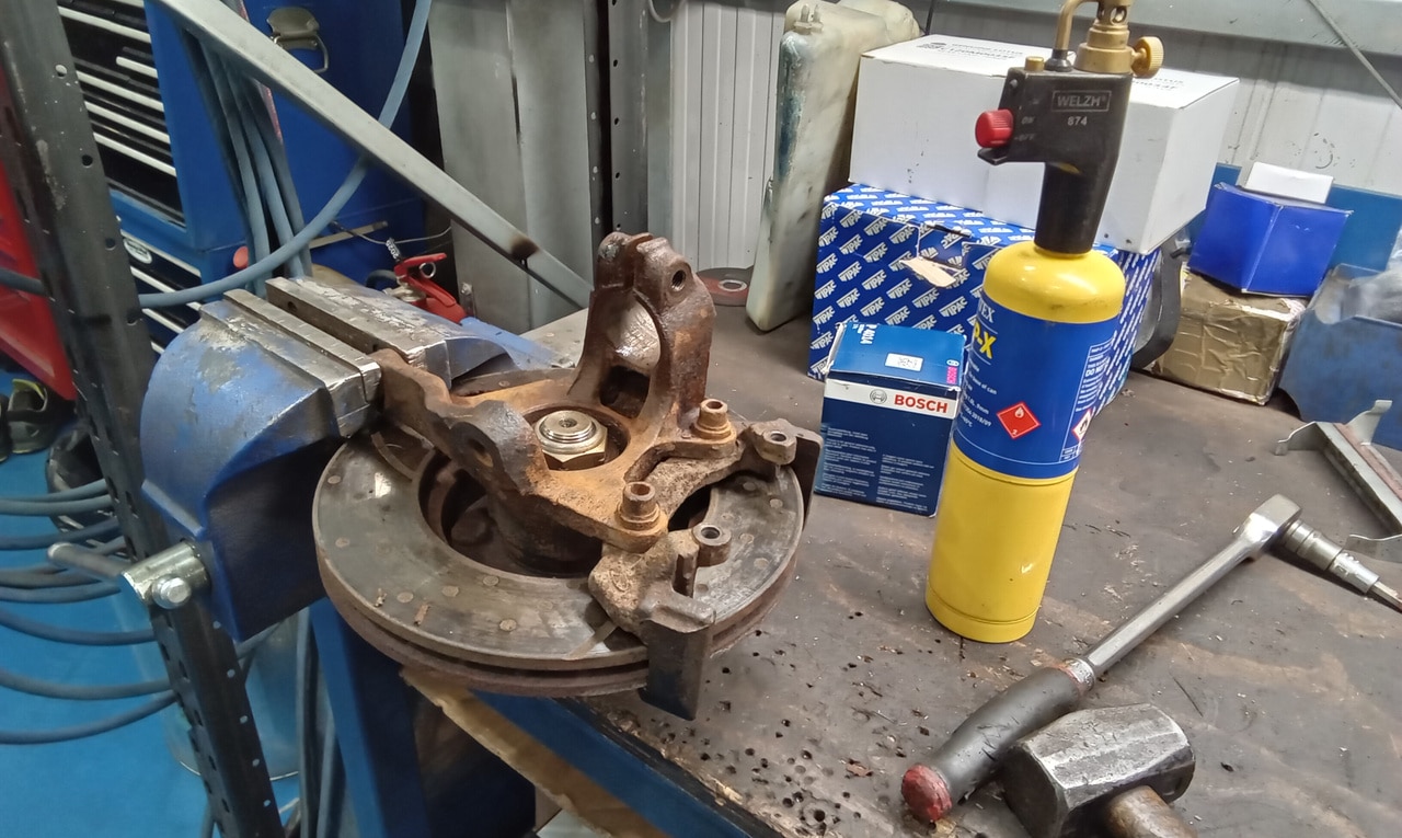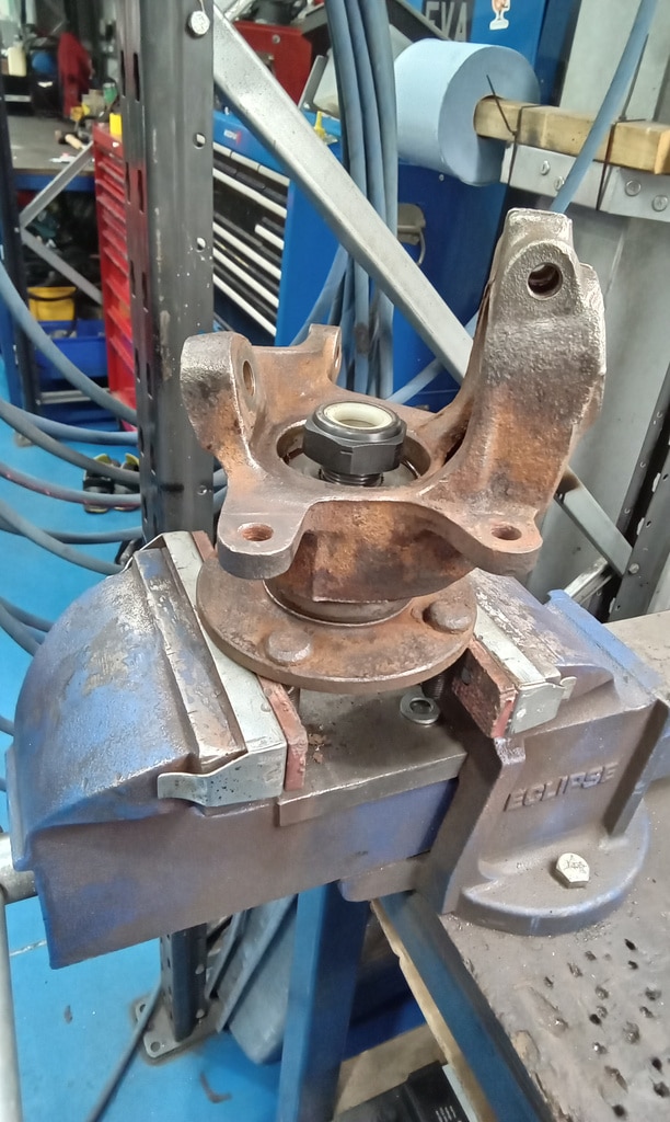 ”Drain oil amd filter and leave to drain while I replace wheel bearing. Strip offside front hub and remove complete with disc. Heat up carrier bolts and remove. Knock out old bearing races and clean hub. Press in new bearing races. Grease new bearings and fit. Press in hub flange and torque newnut to 350nm. Refit huband secure. Remove caliper sliders and rubbers. Remove rust from caliper and refit rubbers. Lube sliders and refit caliper. Refit wheel.”