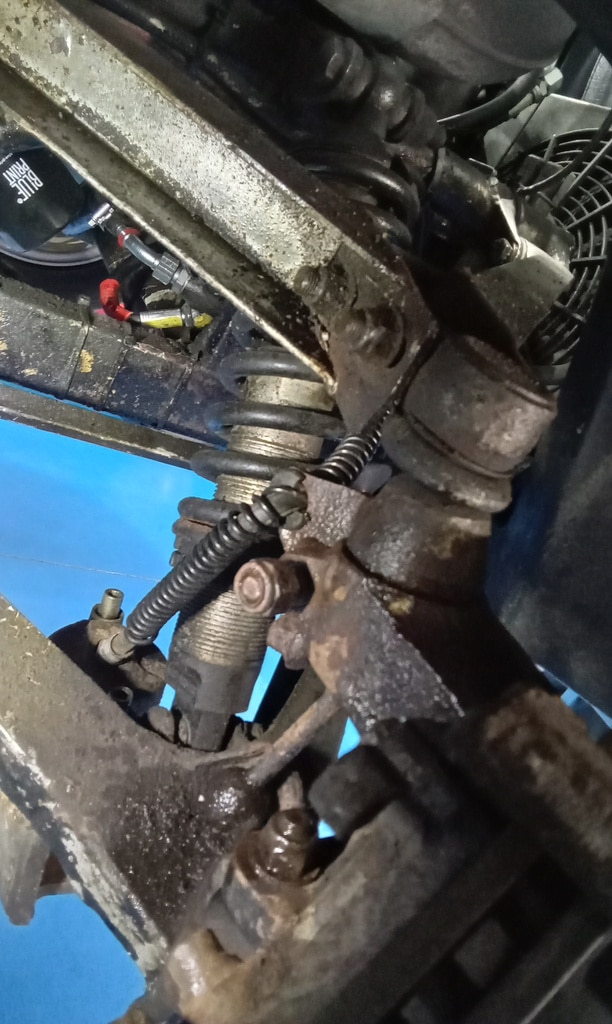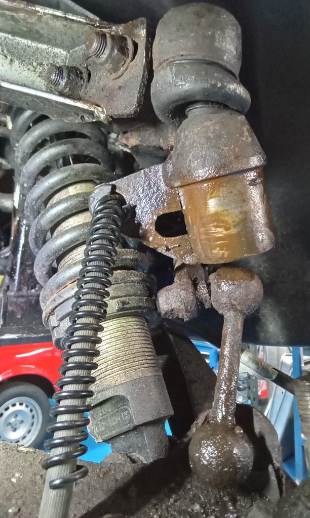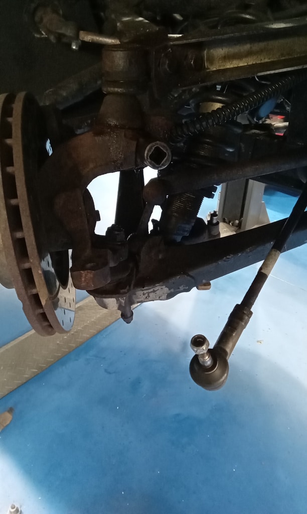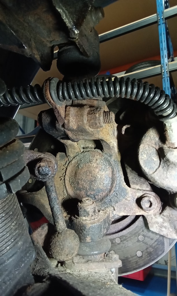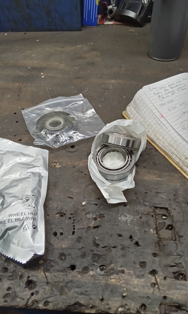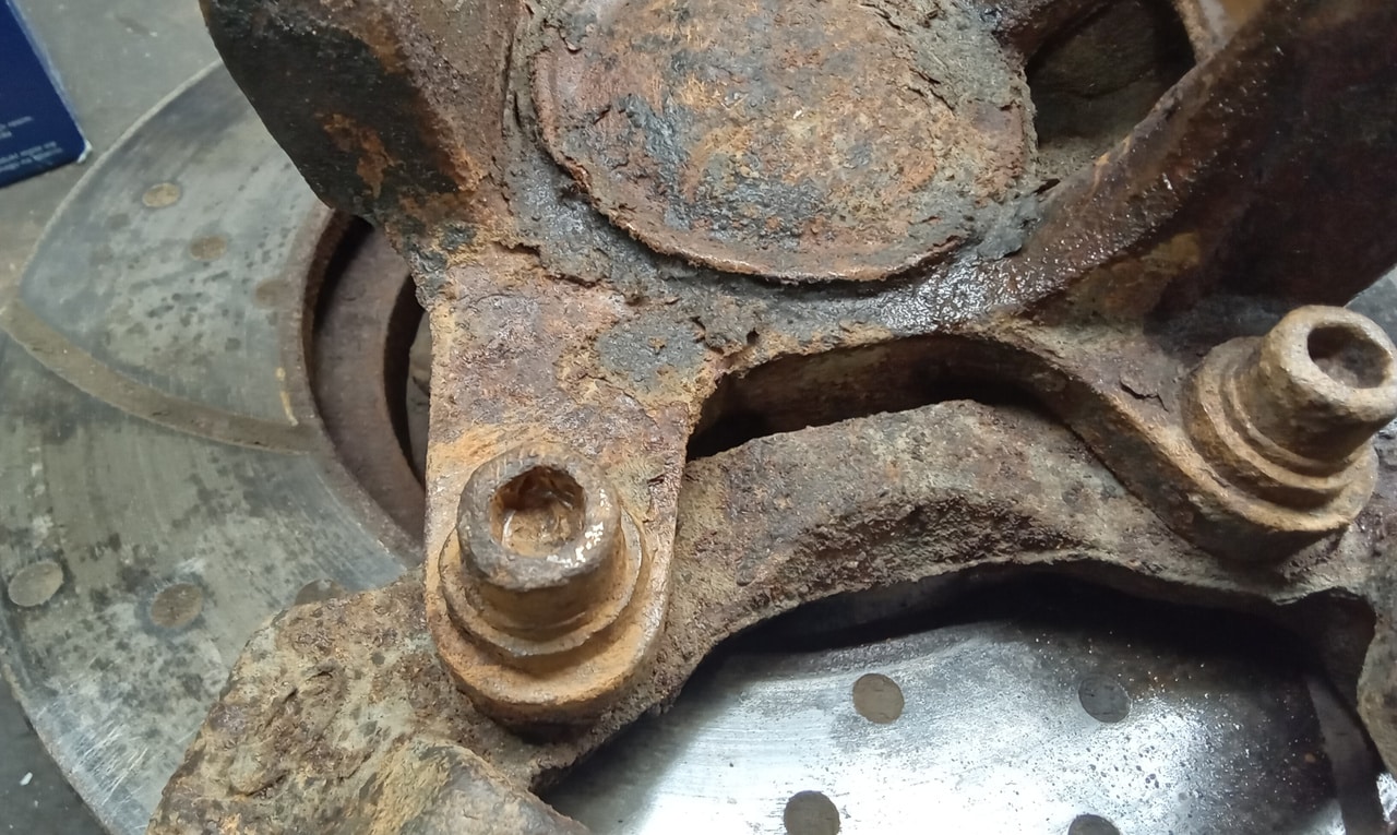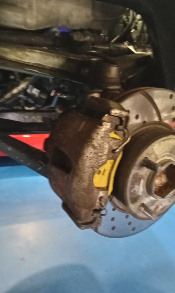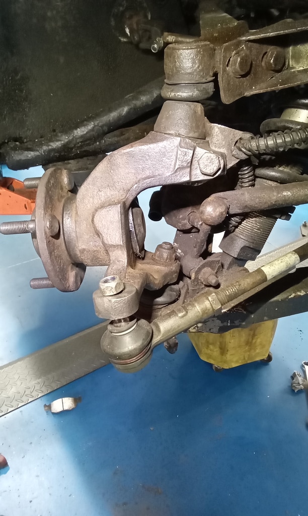 ”Drain oil amd filter and leave to drain while I replace wheel bearing. Strip offside front hub and remove complete with disc. Heat up carrier bolts and remove. Knock out old bearing races and clean hub. Press in new bearing races. Grease new bearings and fit. Press in hub flange and torque newnut to 350nm. Refit huband secure. Remove caliper sliders and rubbers. Remove rust from caliper and refit rubbers. Lube sliders and refit caliper. Refit wheel.”