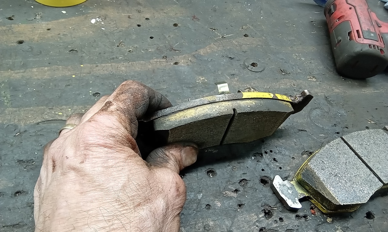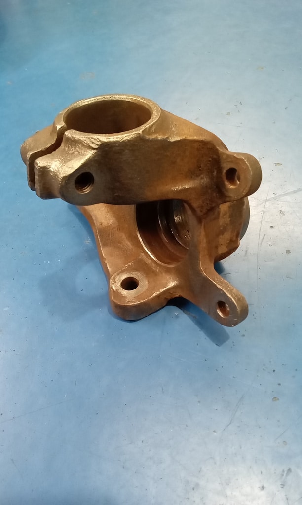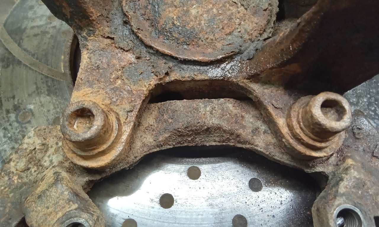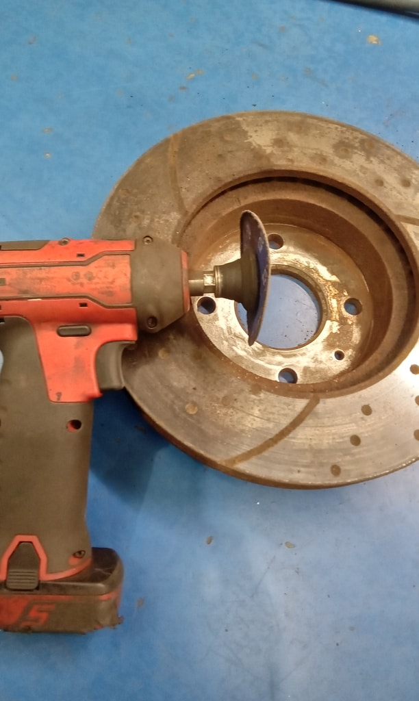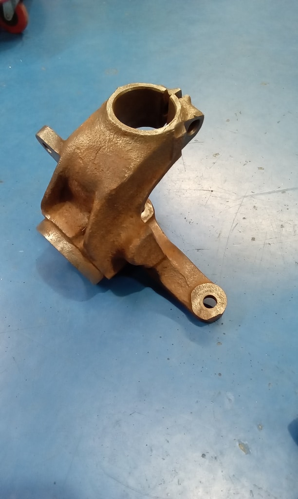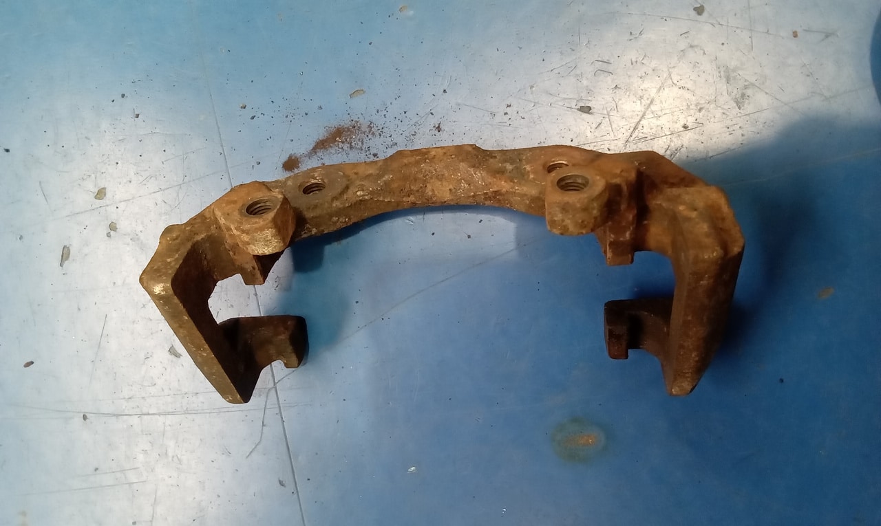 ”Drain oil amd filter and leave to drain while I replace wheel bearing. Strip offside front hub and remove complete with disc. Heat up carrier bolts and remove. Knock out old bearing races and clean hub. Press in new bearing races. Grease new bearings and fit. Press in hub flange and torque newnut to 350nm. Refit huband secure. Remove caliper sliders and rubbers. Remove rust from caliper and refit rubbers. Lube sliders and refit caliper. Refit wheel.”