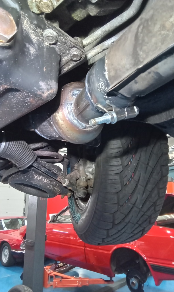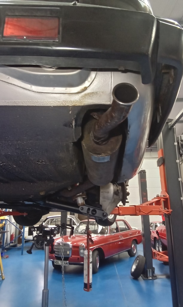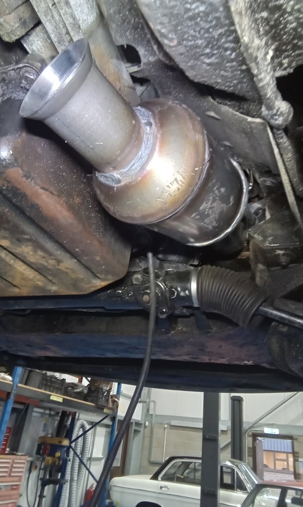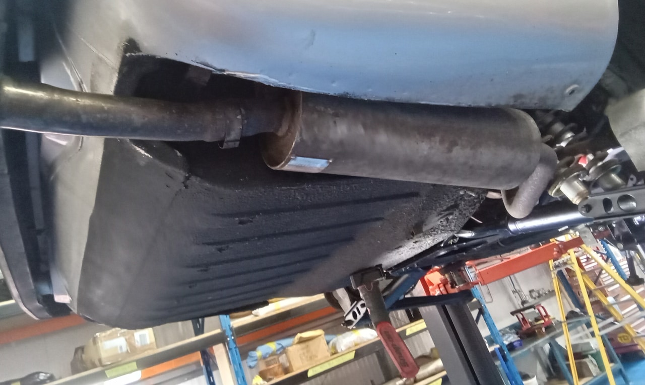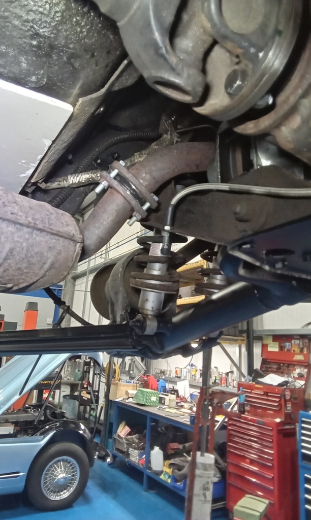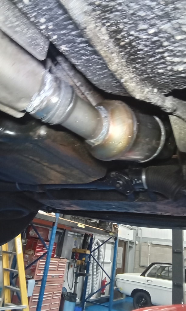 ”Fit new catalyst. Doesn’t line up quite right. Adjusted downpipes to open up. Test fit again. Much better. With Johns help, bolt in place and secure. Fit oxygen sensor and route wiring away from exhaust and steering. Remove mount from rear silencer and feed through rear axle frame. Refit mount and fit to mounts. Mount centre pipe and silencer. Seal flanges and secure. Refit rear wheels and lower to floor. Refit rear trailing arms and secure. Fit lockwire to bolts. Get off ramp.”