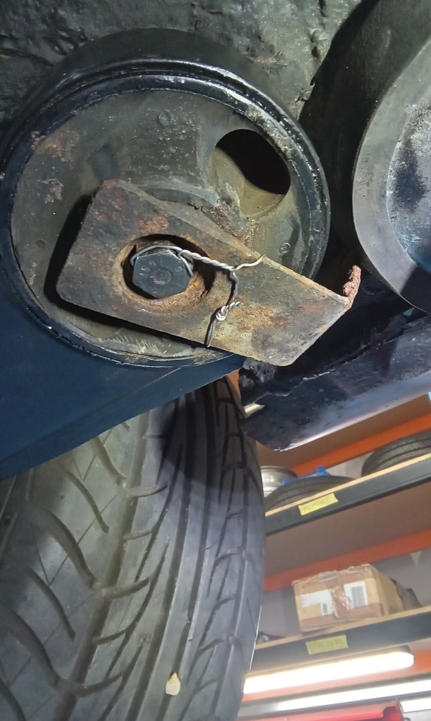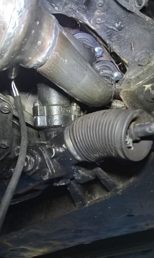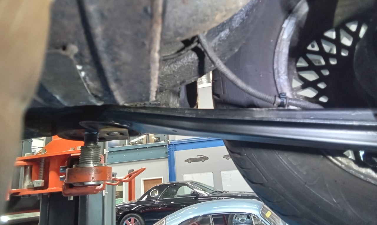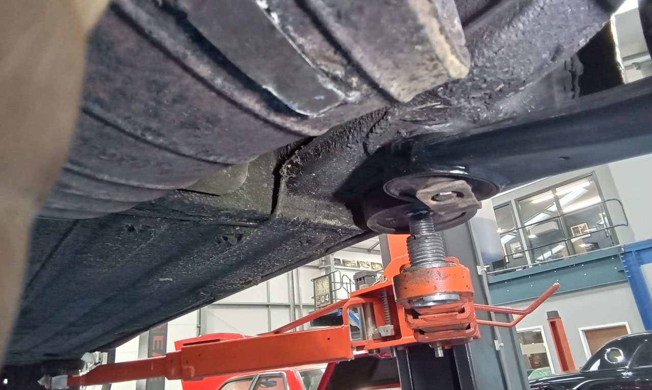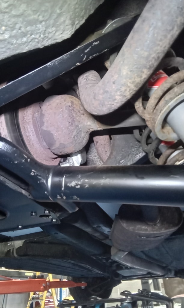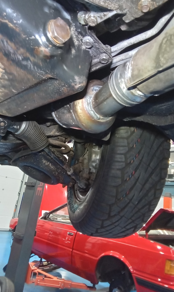 ”Fit new catalyst. Doesn’t line up quite right. Adjusted downpipes to open up. Test fit again. Much better. With Johns help, bolt in place and secure. Fit oxygen sensor and route wiring away from exhaust and steering. Remove mount from rear silencer and feed through rear axle frame. Refit mount and fit to mounts. Mount centre pipe and silencer. Seal flanges and secure. Refit rear wheels and lower to floor. Refit rear trailing arms and secure. Fit lockwire to bolts. Get off ramp.”