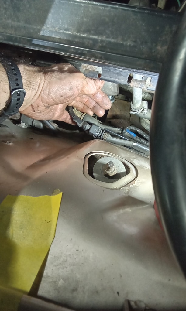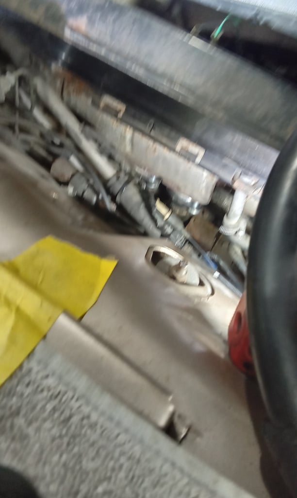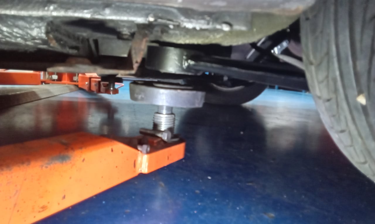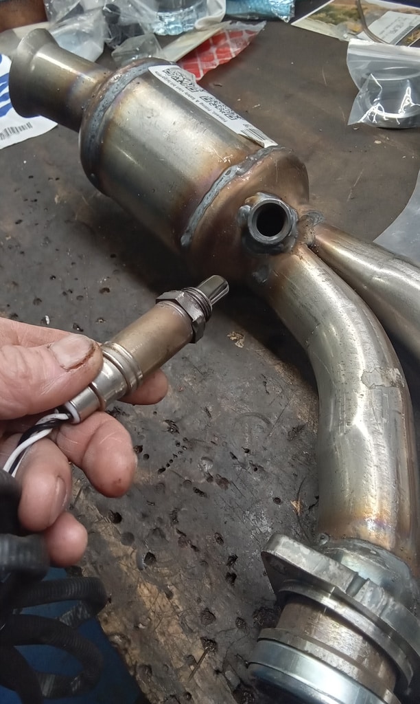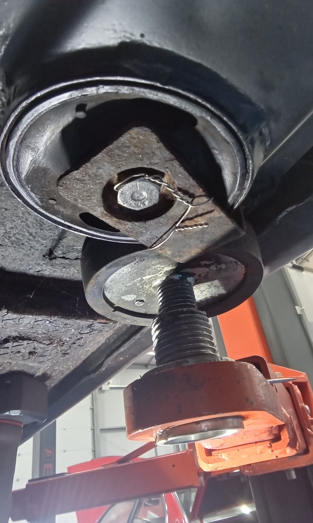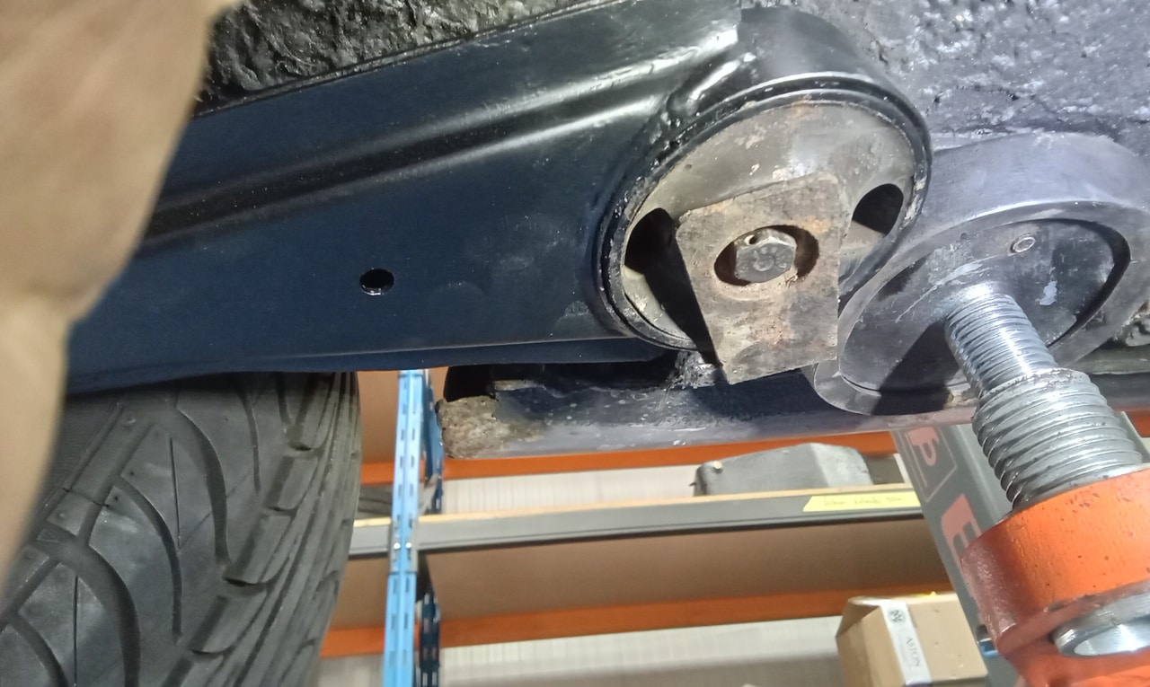”Fit new catalyst. Doesn’t line up quite right. Adjusted downpipes to open up. Test fit again. Much better. With Johns help, bolt in place and secure. Fit oxygen sensor and route wiring away from exhaust and steering. Remove mount from rear silencer and feed through rear axle frame. Refit mount and fit to mounts. Mount centre pipe and silencer. Seal flanges and secure. Refit rear wheels and lower to floor. Refit rear trailing arms and secure. Fit lockwire to bolts. Get off ramp.”