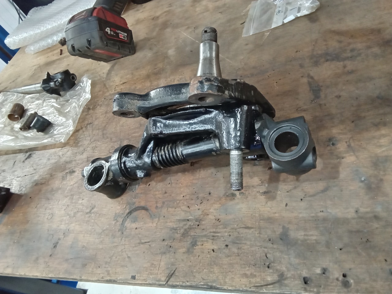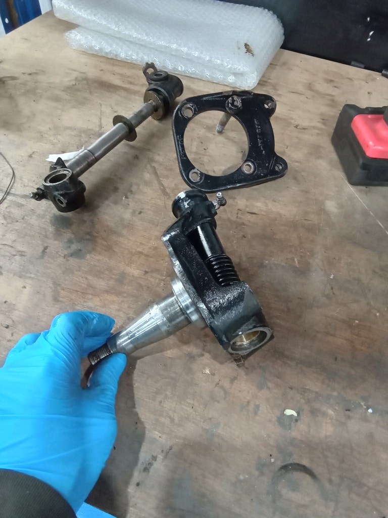 Our 1959 Austin Healey 3000 was won recently, but the lucky new owner decided to take the cash alternative for the classic sports car but that doesn’t stop our workhsop team from getting back up into fighting health. Our restoration technician Steve has been busy getting the car ready, including replacing the O/S kingpin bushes and kingpin. The originals had deteriorated quite alot and were causing excessive play in the steering.