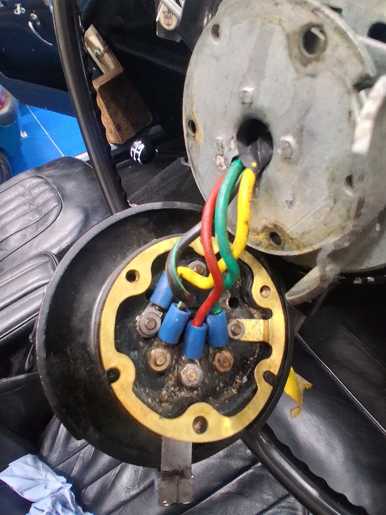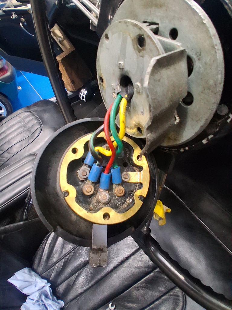 ”After fitting a new steering box, the indicators didn’t work. After checking the wiring, it was found to be a fault at the switch in the steering wheel centre. The switch was dismantled, and continuity was checked from the indicators to the switch. There was high resistance in the wiring. This was traced to corroded connections. The terminals were removed and cleaned, and the lights were rechecked. The switch was then rebuilt, as was the steering.”