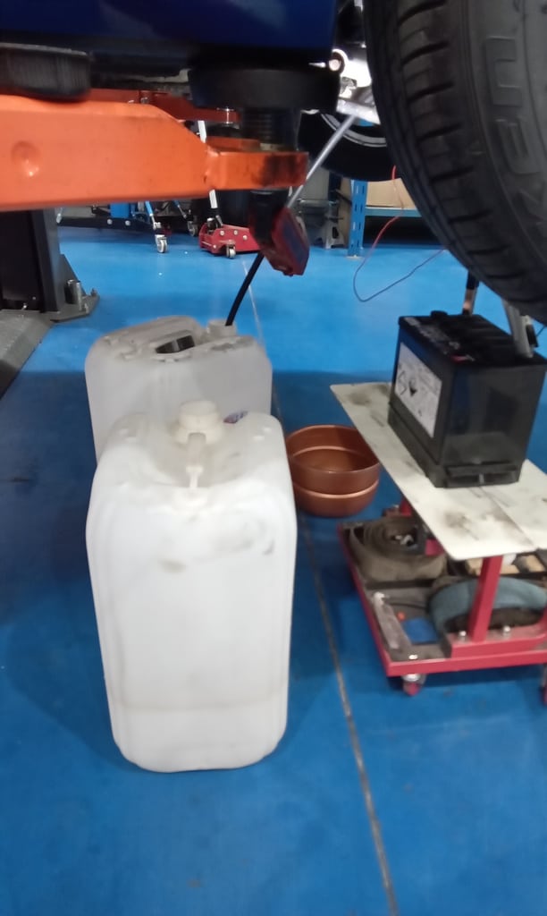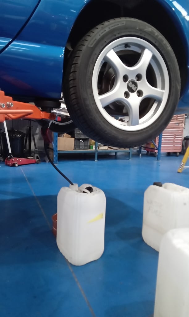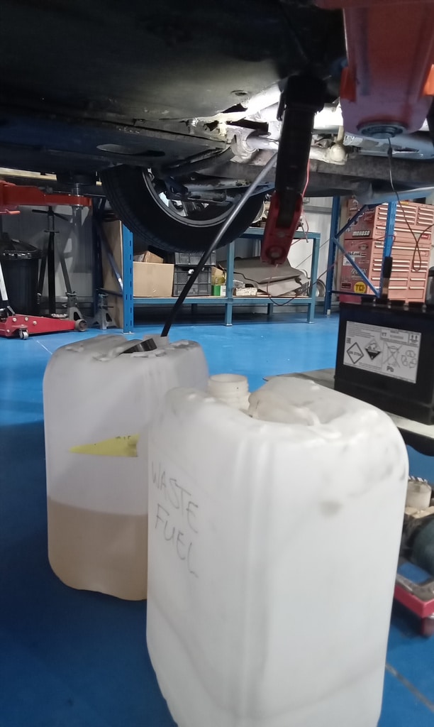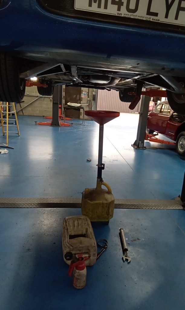 Jon drained the oil and removed the filter as part of the service, then drained the fuel tank by connecting the fuel pump directly to the battery and using it to empty the tank into barrels before reconnecting the feed pipe and wiring to the pump. He added 10 litres of E5 petrol, fitted a new oil filter, and refilled the engine with fresh oil. After running the engine, he rechecked the oil level and topped it up as needed. During testing, he observed that the rev counter was erratic and that the engine idle was rough. He will proceed with fitting the new coolant temperature sensor once it arrives in order to check the timing and continue diagnosing the running issues.