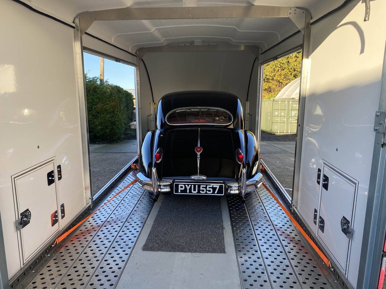 The 1955 Jaguar XK140 has safely arrived at its new home with lucky new owner, Richard. The car was prepared at our Suffolk HQ before the Bridge Classic Cars transporter team carefully loaded into our enclosed trailer for its journey to its excited new custodian.