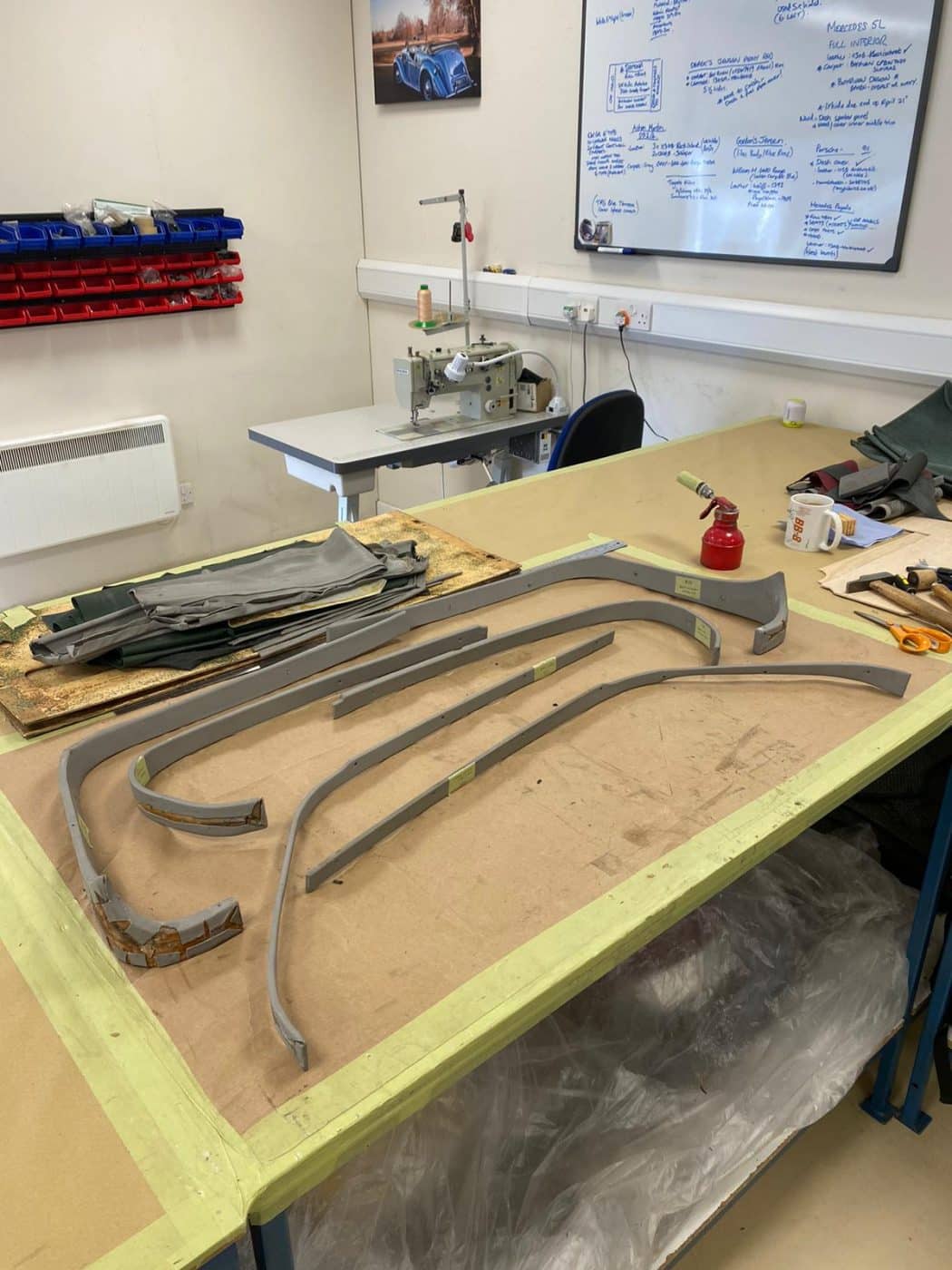 More stripping, gluing and re-covering on the agenda for Brian and Lydia in our trim-shop this week and the cappings, front and side windows, window panels and woodwork have all been finished in new leatherwork.