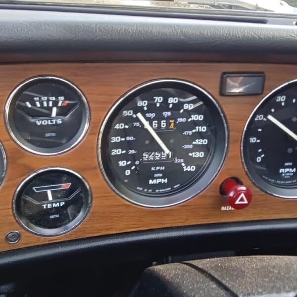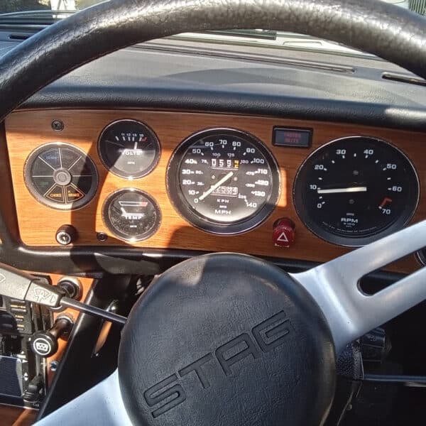Jonn fitted new bungs and gaskets to both carburettor float bowls and ensured they were securely in place. He then refitted the carburettor assemblies to the manifold and tightened all fixings. With the ignition key turned on, he checked for any fuel leaks, finding none. To build oil pressure, the engine was cranked over for one minute with the coil lead disconnected; the oil warning light extinguished as expected. The coil was then reconnected, and the engine was turned over for ten seconds. Upon pulling out the choke, the 1974 Triumph Stag started immediately. Jonn switched off the engine and carried out a visual inspection before preparing the vehicle to be taken outside.