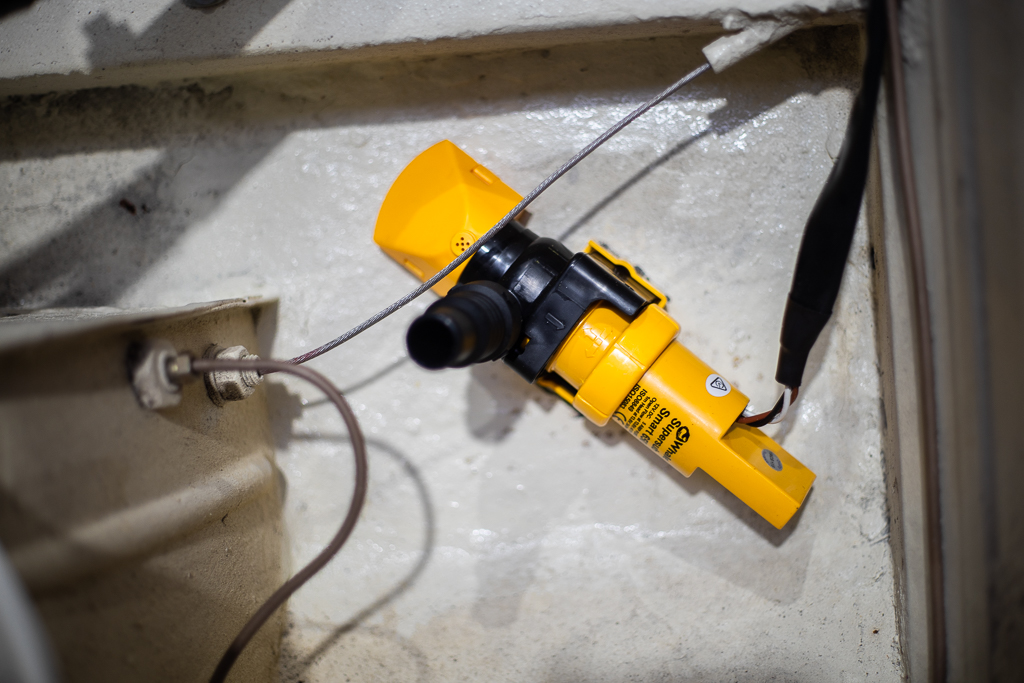 Two bilge pumps have been added to the Amphicar. The original bilge pump remains in its original position in the engine bay and is still in working condition. The old pump still has its wires connected and can be connected at any point in the future, however, it is currently disconnected from the car. The old pump has been kept in for peace of mind.