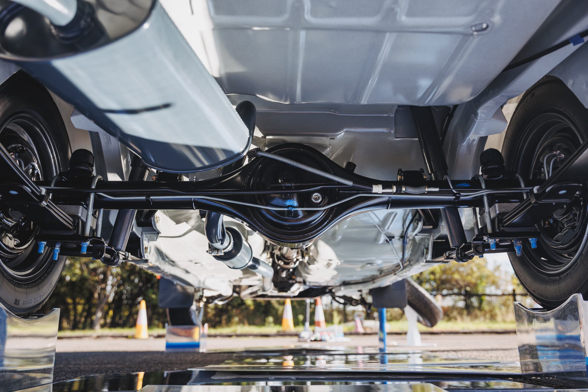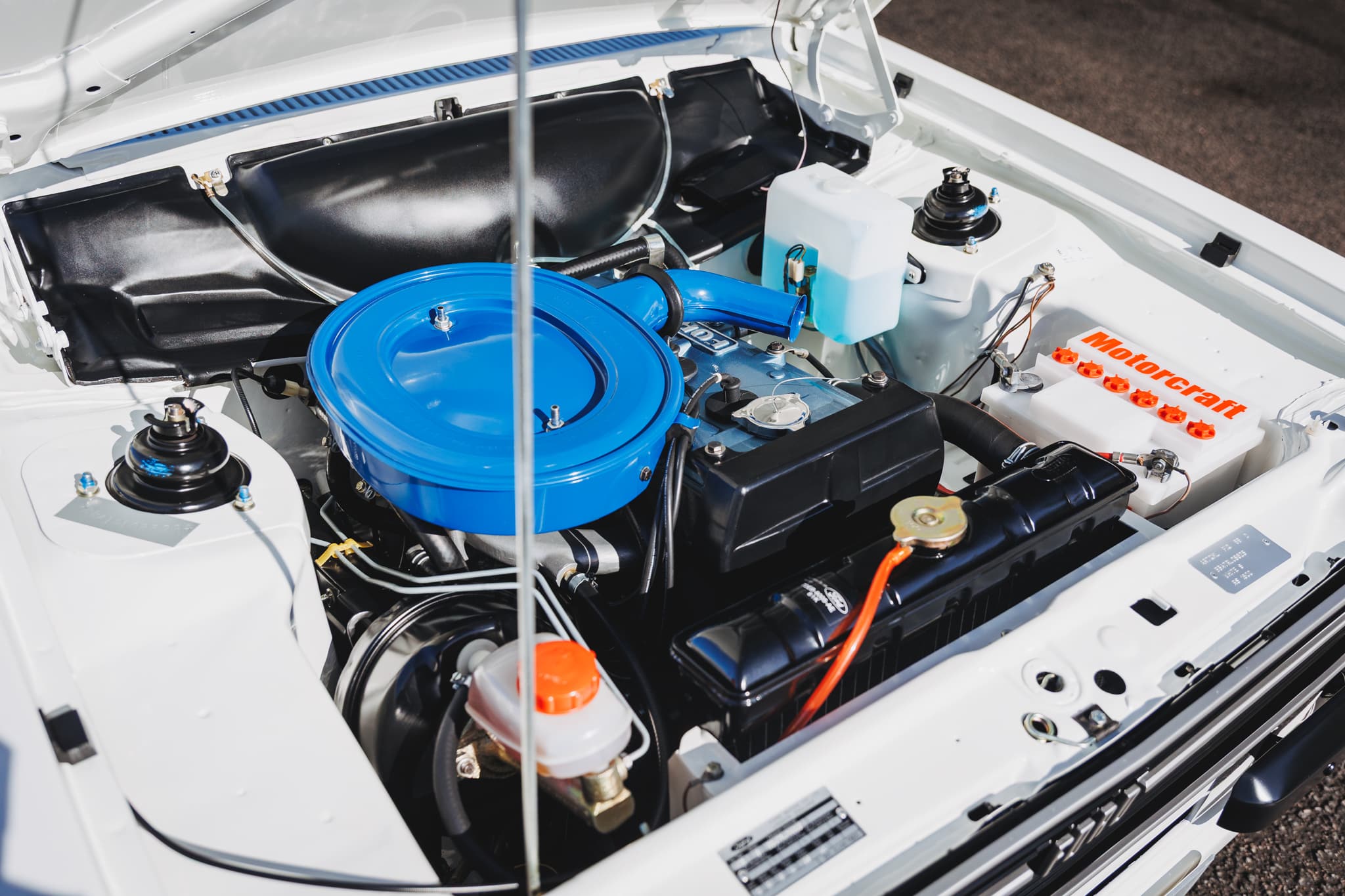 The extremely rare car was restored to completely original condition including the white Ford-stamped rear spoiler, chrome seat handles, period Pirelli Cinturato CN36 tyres, and even the correct Motorcraft battery and radio have been fitted to the car.