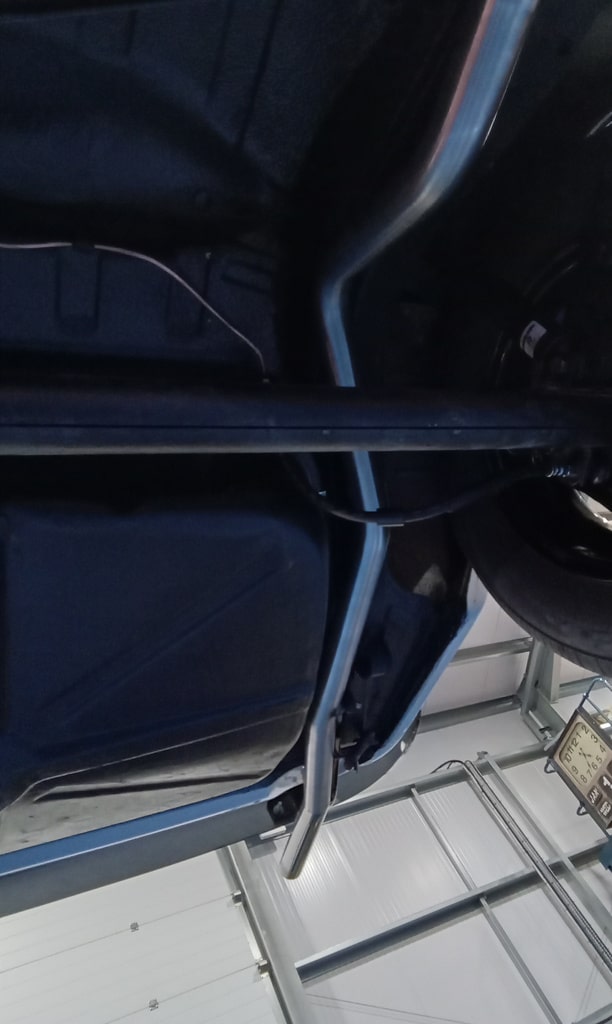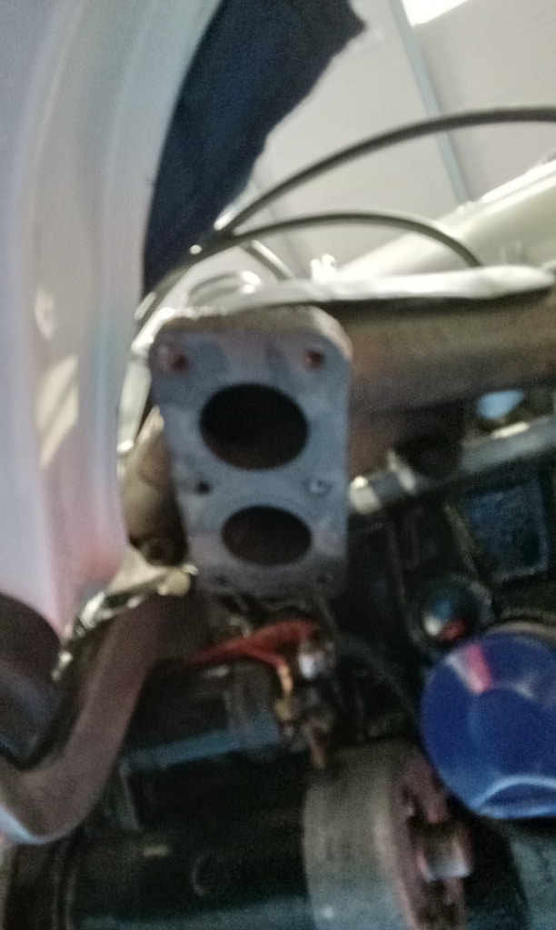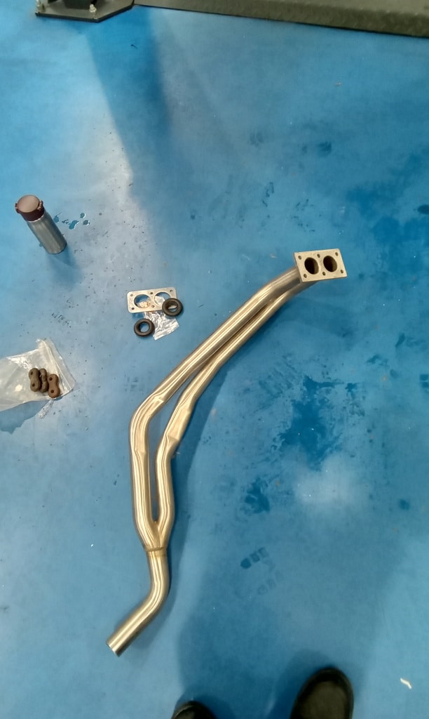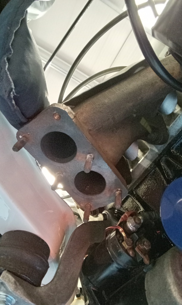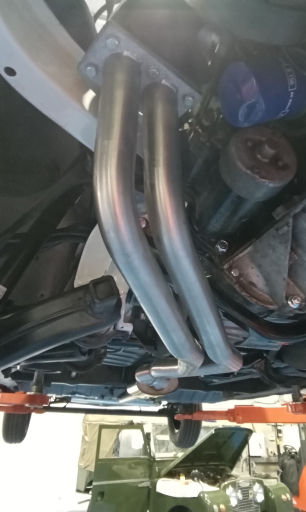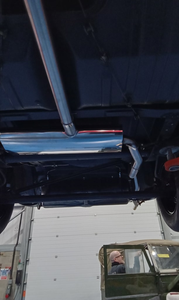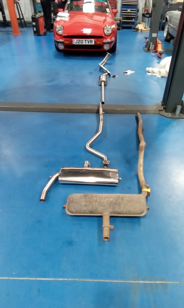 ”Get car in air, remove new and old exhaust from shelf and lay out, remove with a stud extractor old exhaust studs, drill out broken studs. Re tap hole that had a snapped stud in with John, remove snapped tap from hole with John, Finnish cleaning up threads with tap, fit the exhaust from manifold back, fit mid section on loose with muffler. Fit mid section and muffler on with exhaust rubers, fit back over axel section with exhaust rubbers and clamp exhaust on properly, fit bottom radiator hose, fit new oil filter, clean up oil, tidy tools away at end of day.”