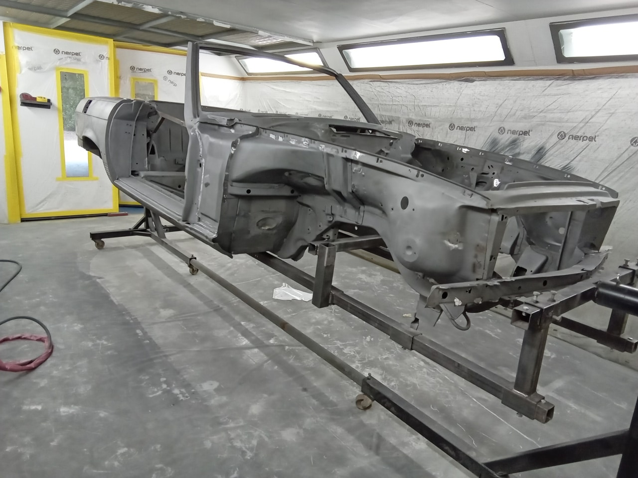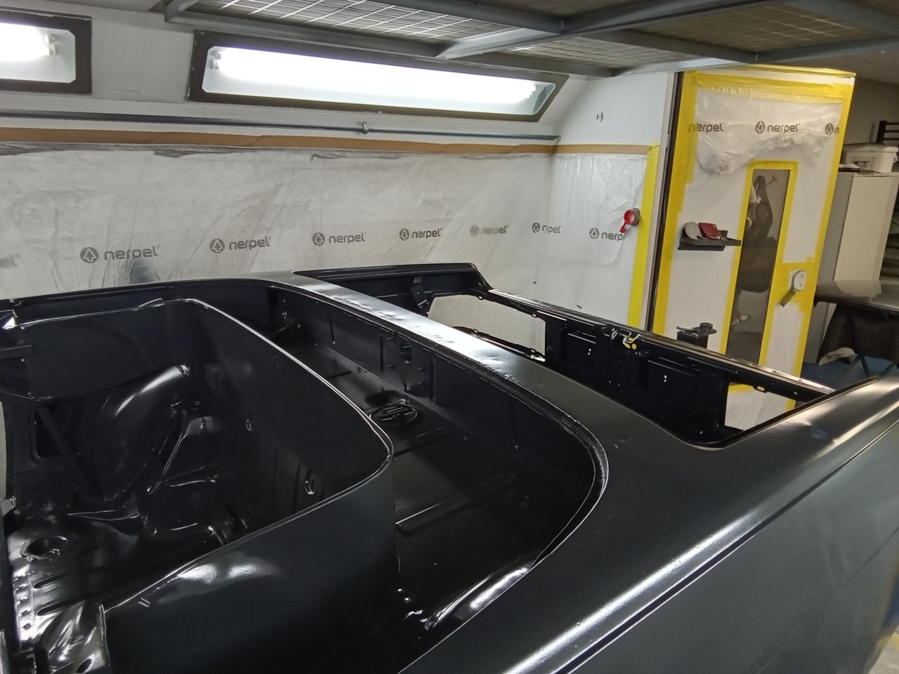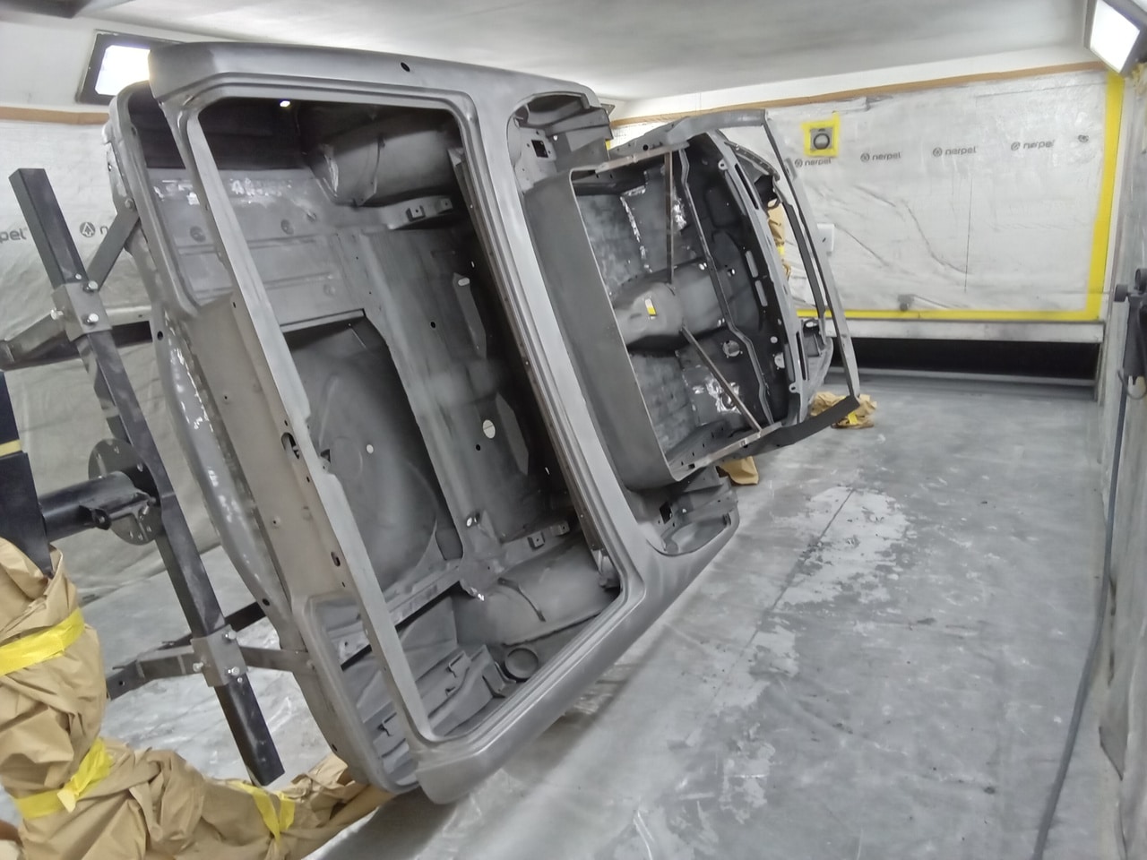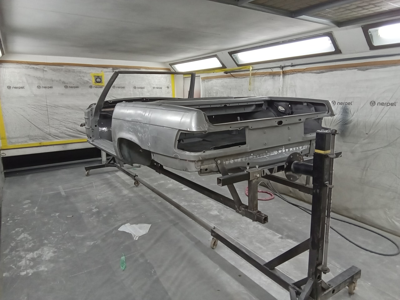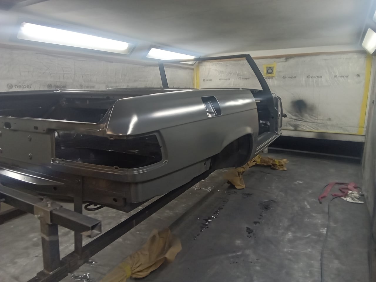 The paint and body team have taken the freshly restored and improved bodyshell of the 1978 Mercedes 350SL. In the paint and bodyshop here at the Bridge Classic Cars restoration workshops has been moved into our in-house paint booth for the team to completely and totally clean down, then clean it again and then clean it once more before laying down several coats of epoxy for the team to then begin refining its shape even more aiming towards possibly the finest Mercedes R107 to have been restored.