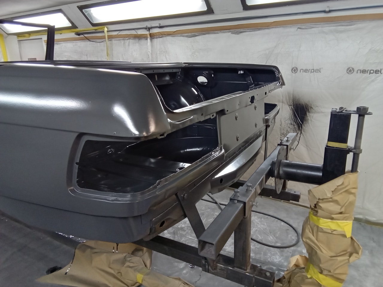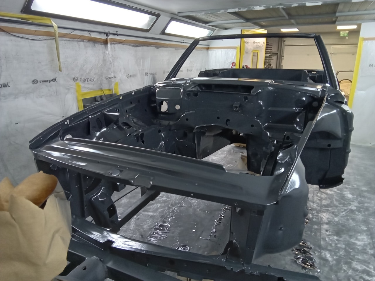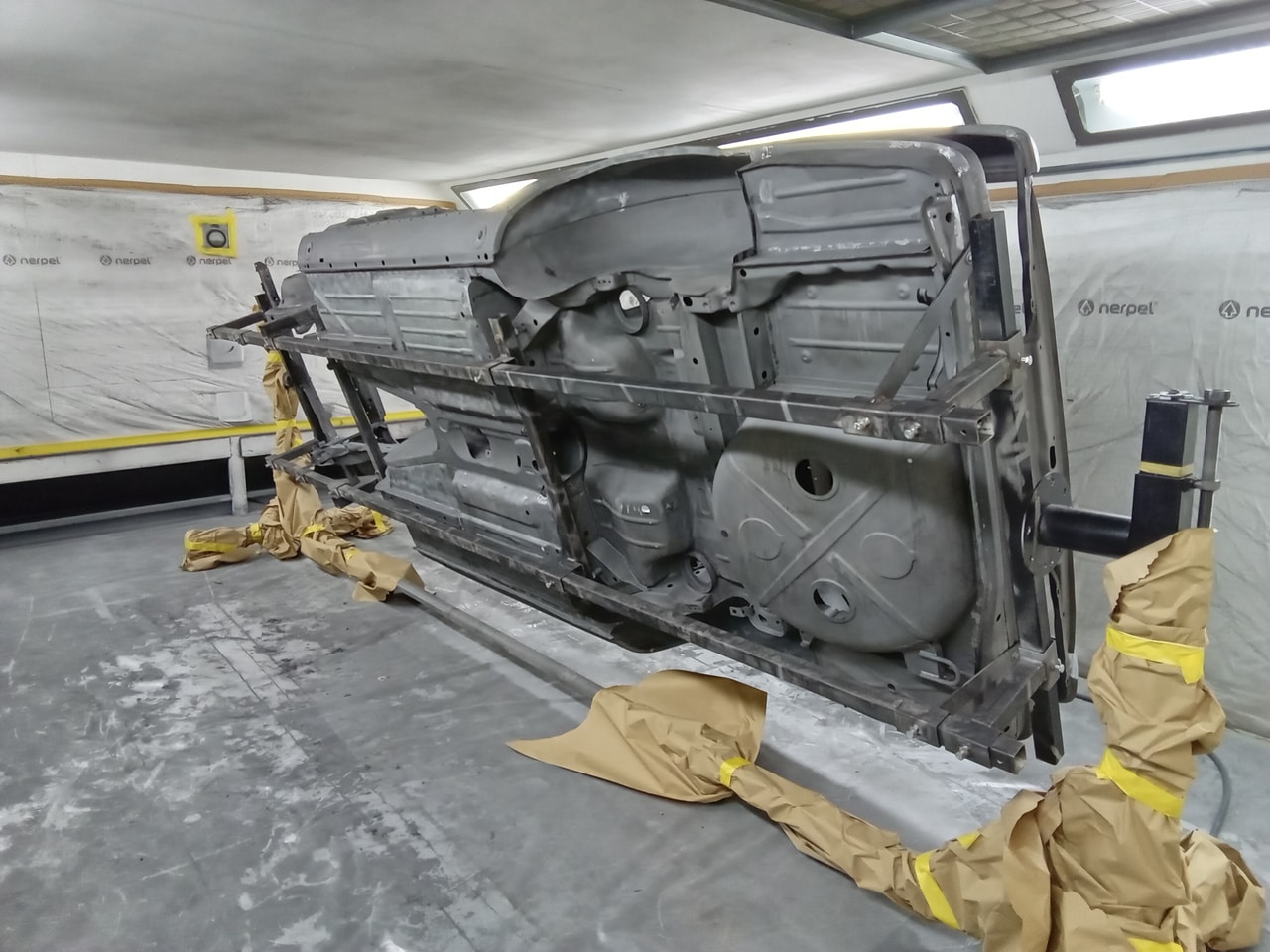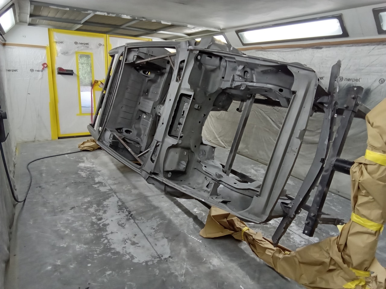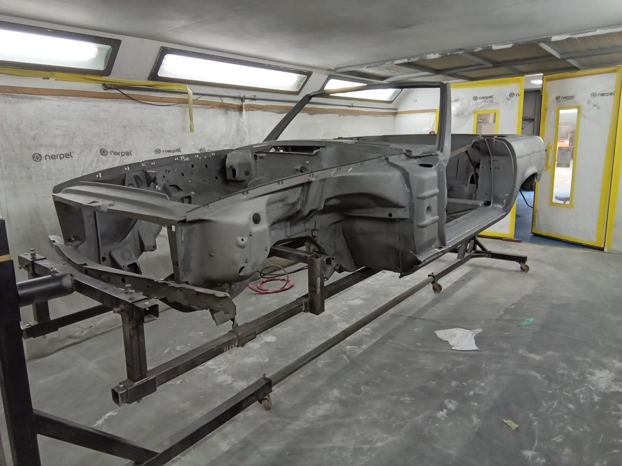The paint and body team have taken the freshly restored and improved bodyshell of the 1978 Mercedes 350SL. In the paint and bodyshop here at the Bridge Classic Cars restoration workshops has been moved into our in-house paint booth for the team to completely and totally clean down, then clean it again and then clean it once more before laying down several coats of epoxy for the team to then begin refining its shape even more aiming towards possibly the finest Mercedes R107 to have been restored.