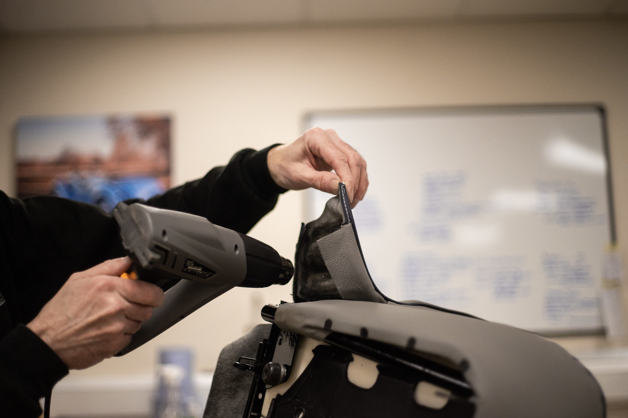 Brian has completed restoring the frame of our Triumph TR5 seats and has installed a reclining hinge joint. He made this element by hand out of plywood and fitted it inside the chair. The fabric was then glued, heated to make the glue go tacky, and pulled over the new joint,